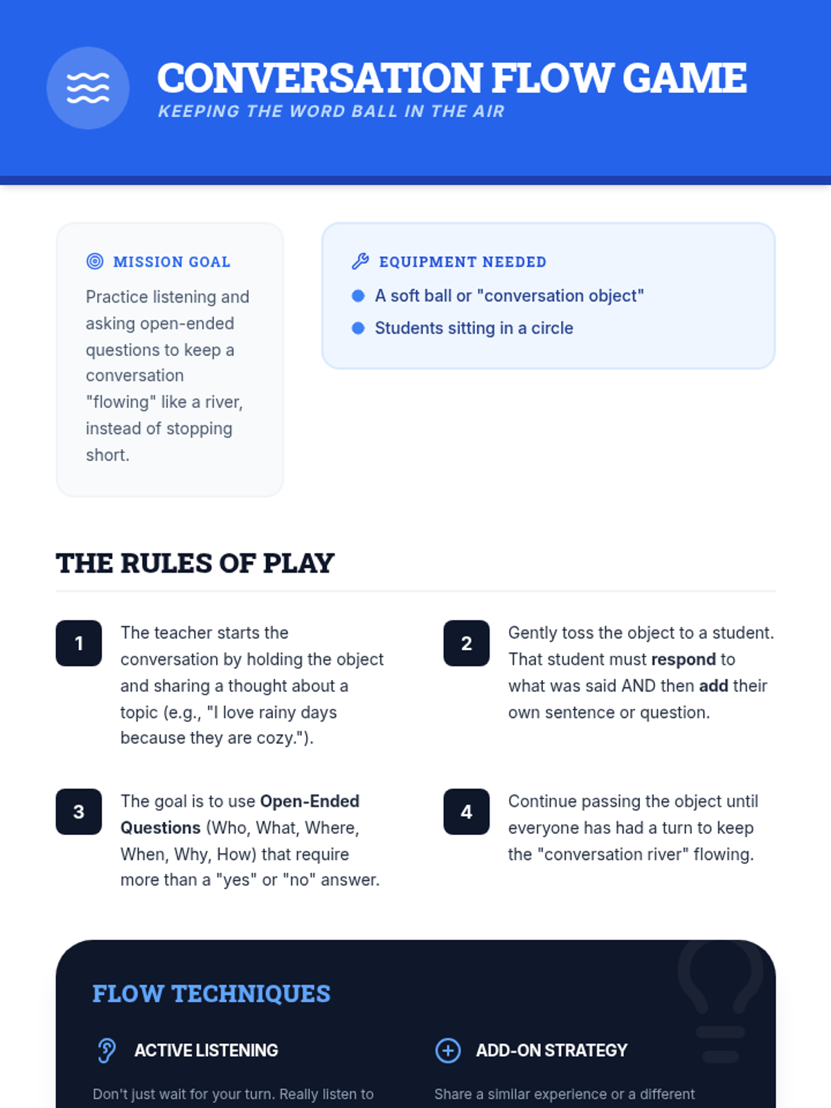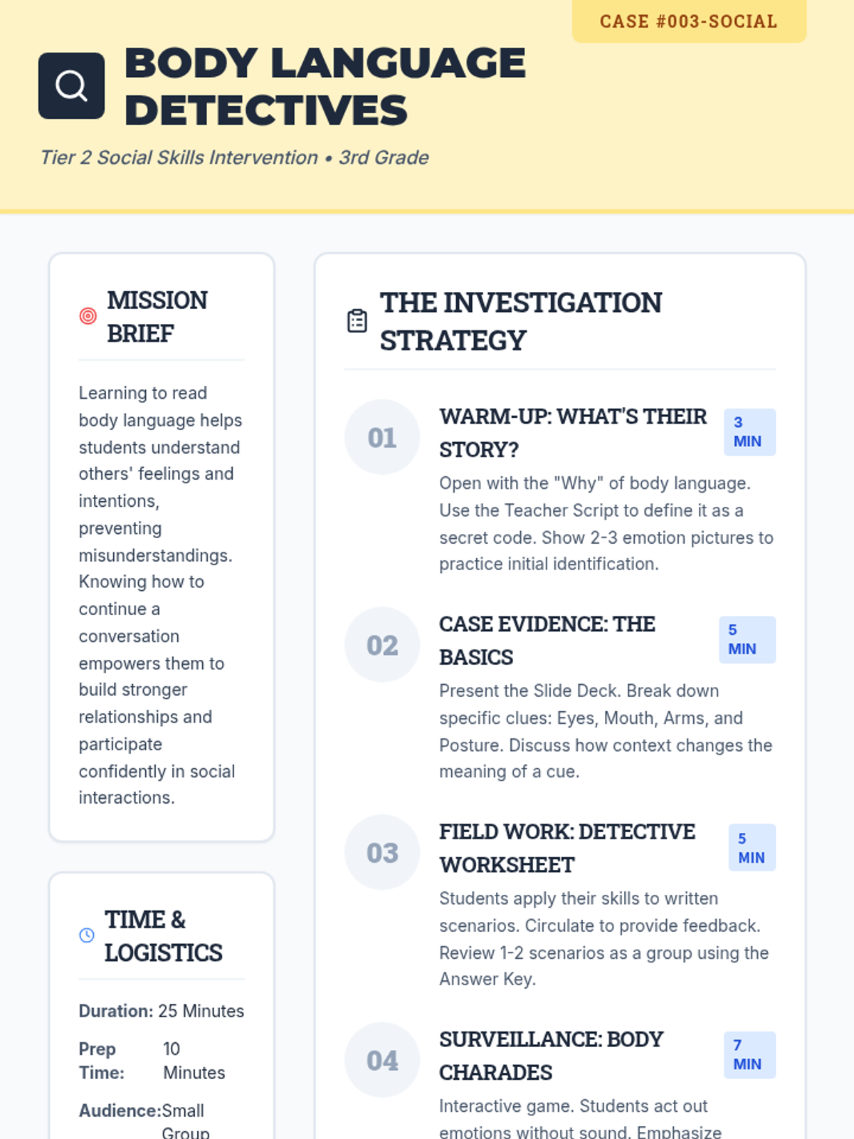 This lesson helps 3rd graders develop essential social skills by teaching them how to read body language and effectively continue conversations. Designed for small groups, this 25-minute session provides targeted support through interactive activities and guided practice.