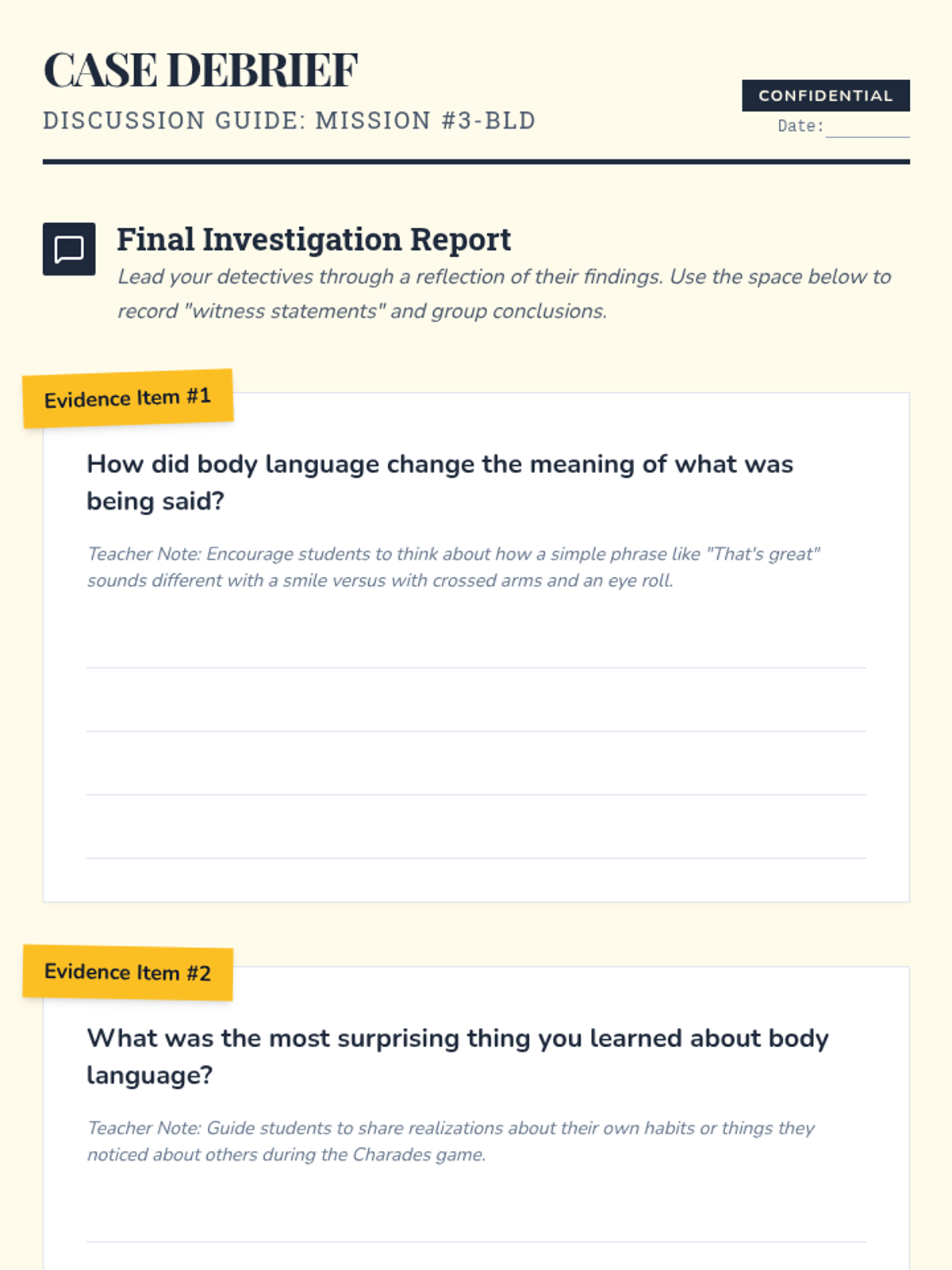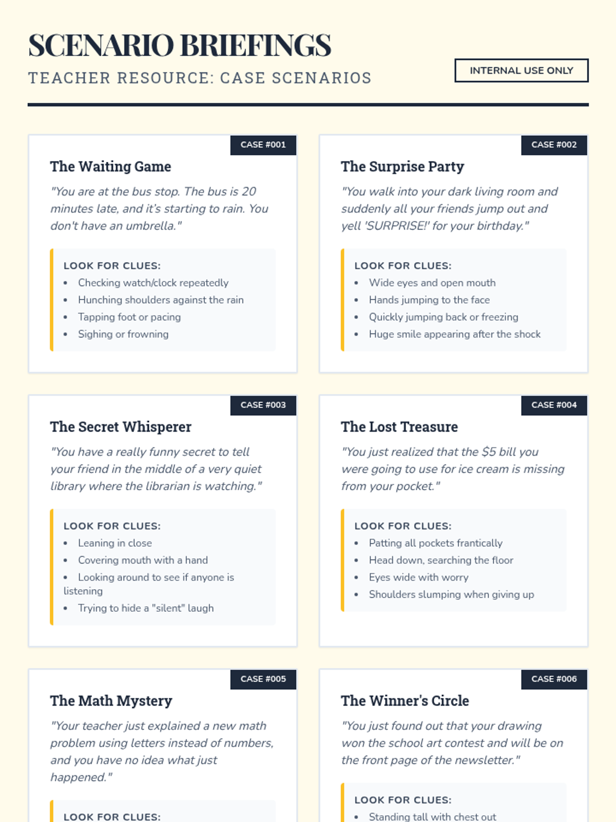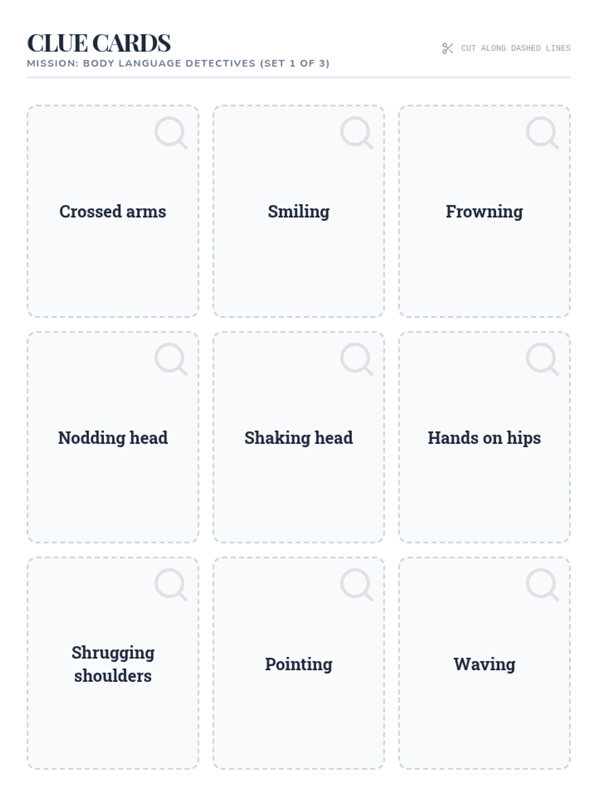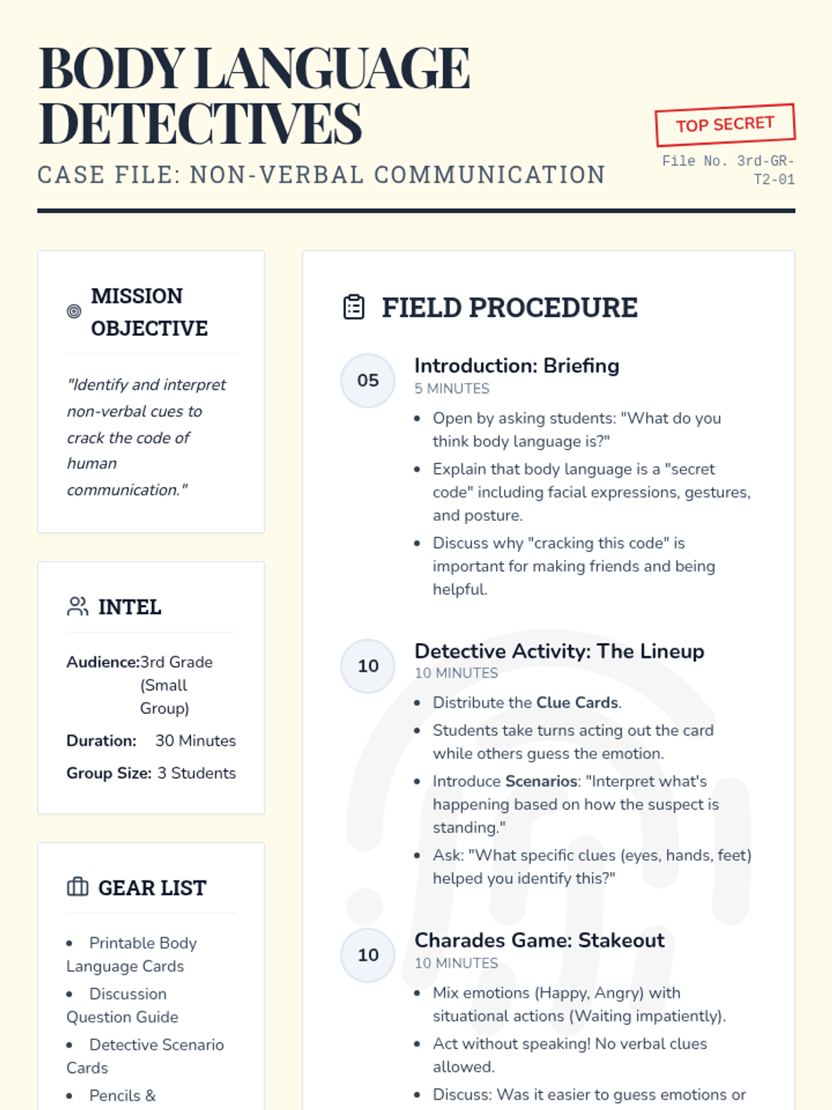 A small-group lesson for 3rd graders to identify and interpret non-verbal cues like facial expressions and posture through interactive role-play.