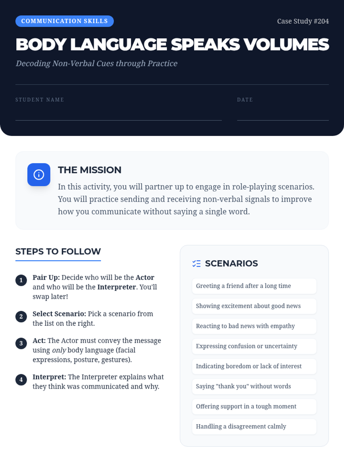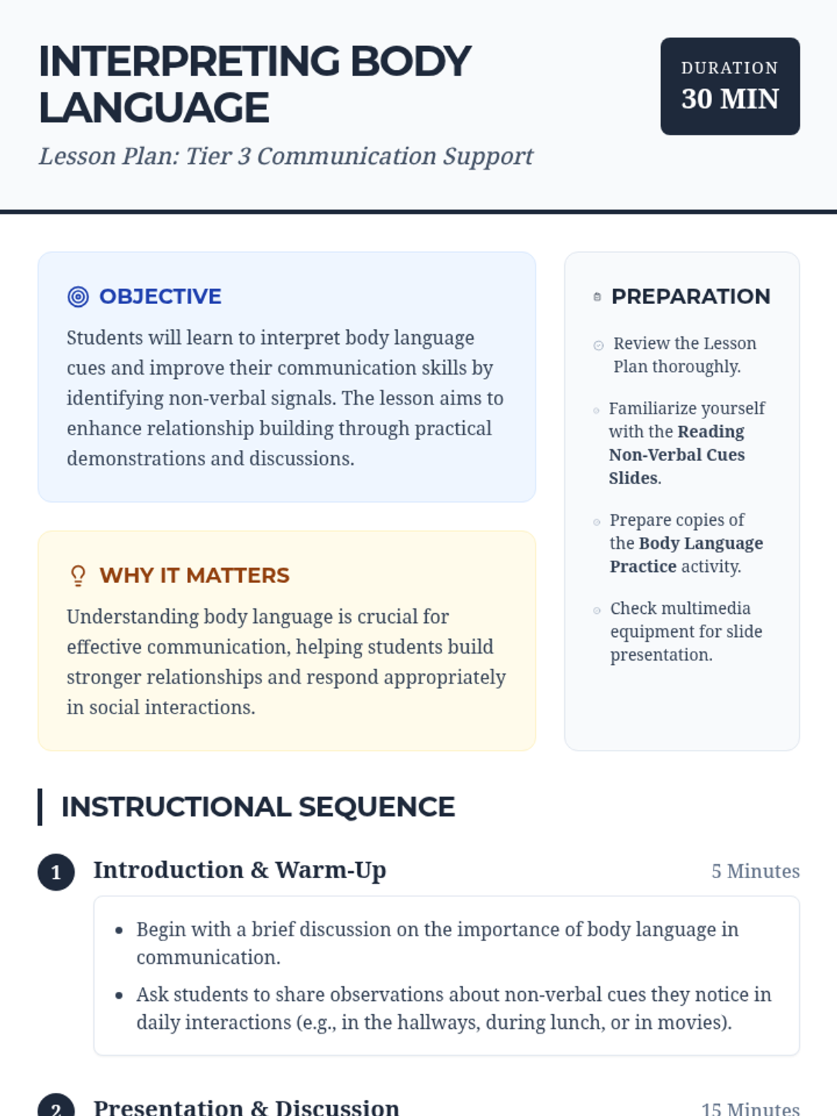 A deep dive into understanding and interpreting body language to improve communication skills. This lesson aids in recognizing non-verbal cues and enhancing relationship building, specifically designed for 10th-grade students in a Tier 3 individual support setting.