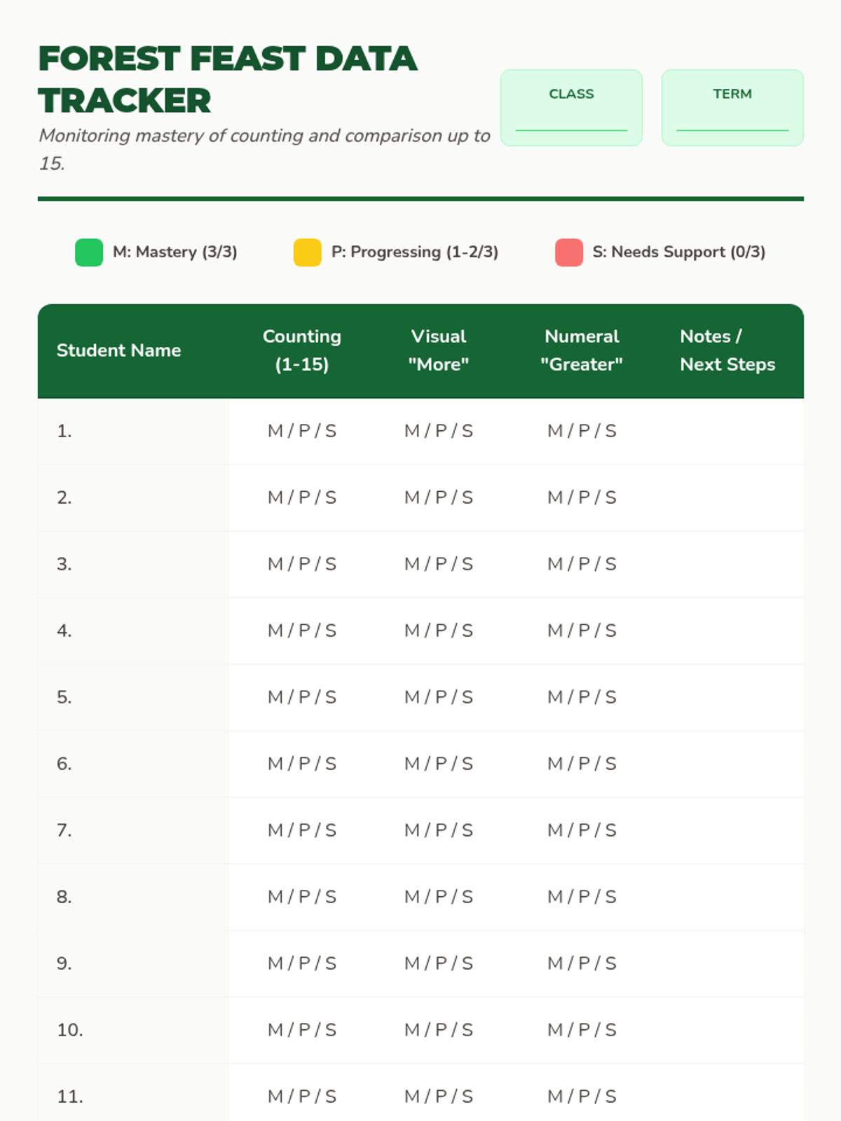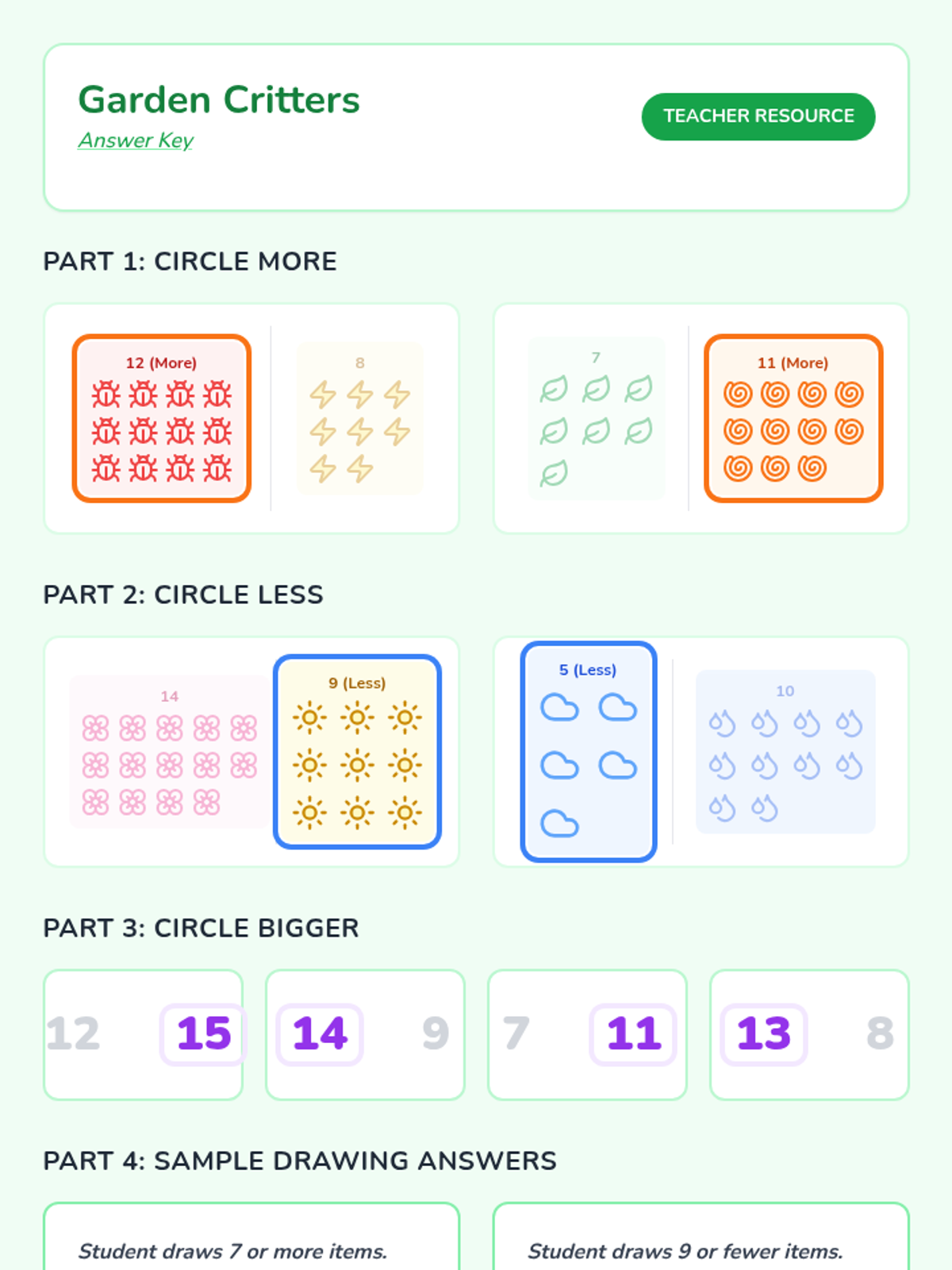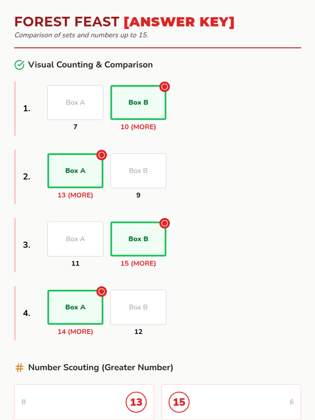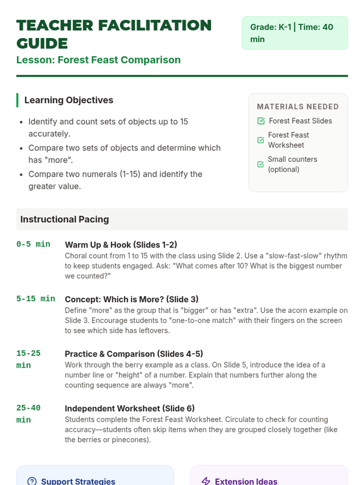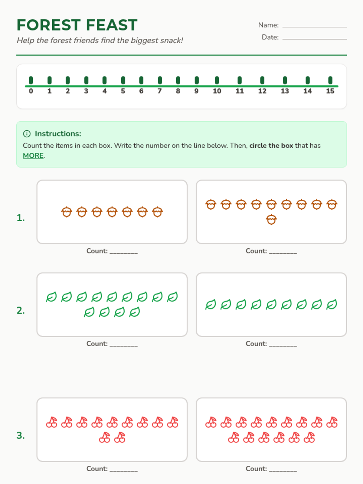 A hands-on lesson focusing on counting and comparing sets of forest-themed items up to 15 to develop foundational number sense and comparison skills.