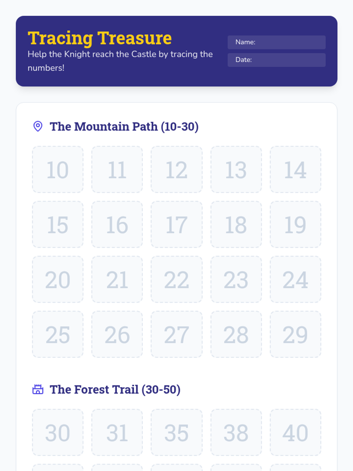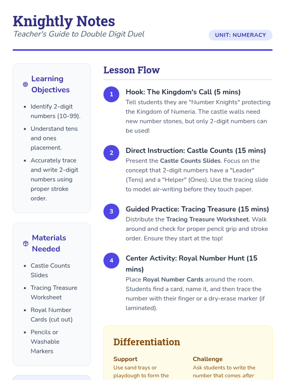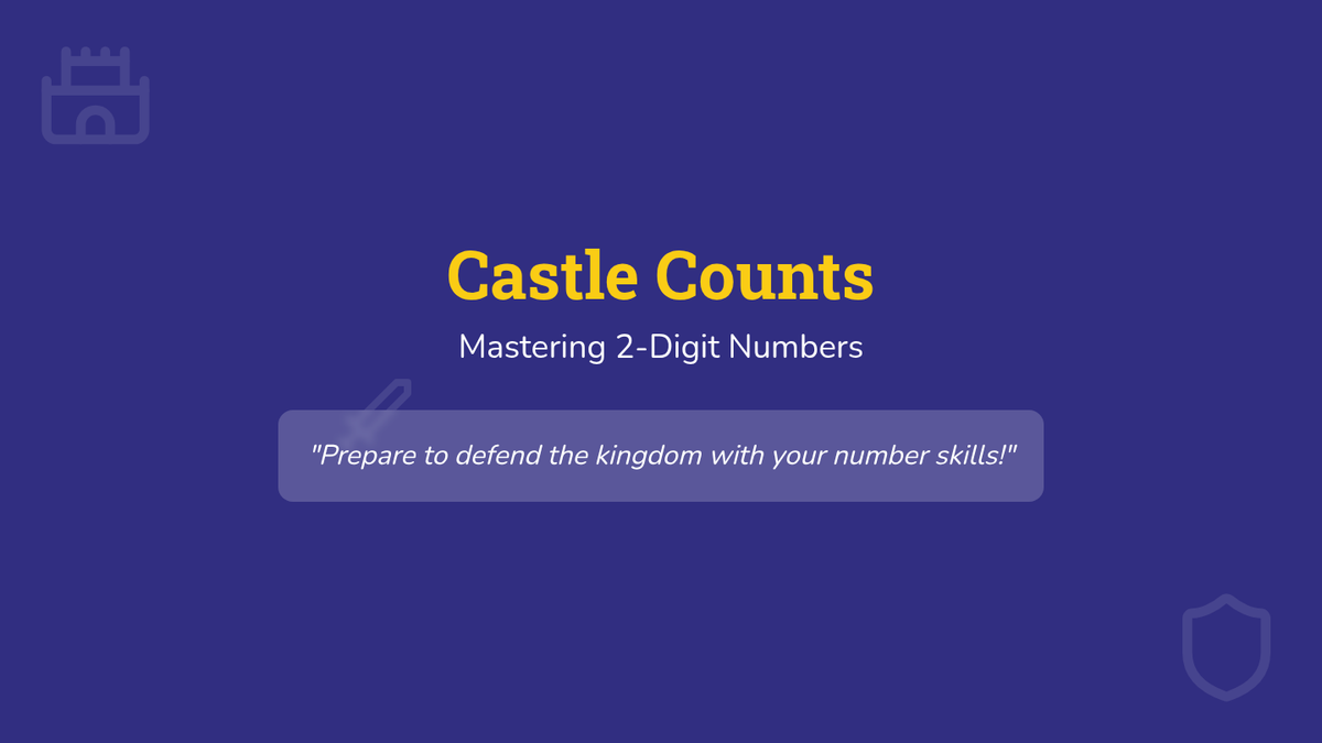 A lesson focused on identifying and writing 2-digit numbers through guided tracing and interactive castle-themed activities. Students will master place value basics and fine motor skills for writing numbers 10-99.