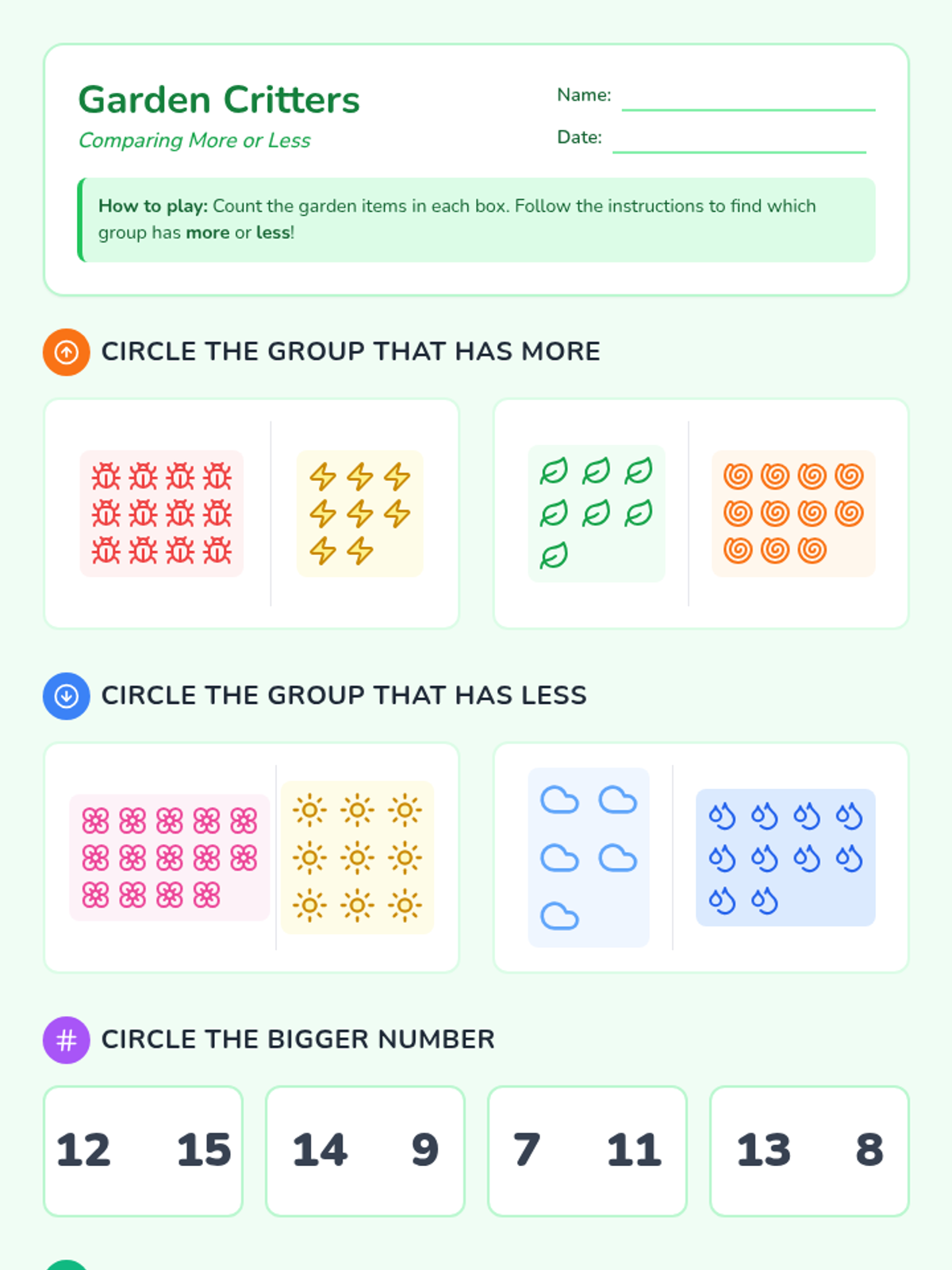 A lesson focused on comparing quantities and numbers up to 15 using visual representations and numerical values. Students will practice identifying sets with more or fewer items and comparing numerals directly.