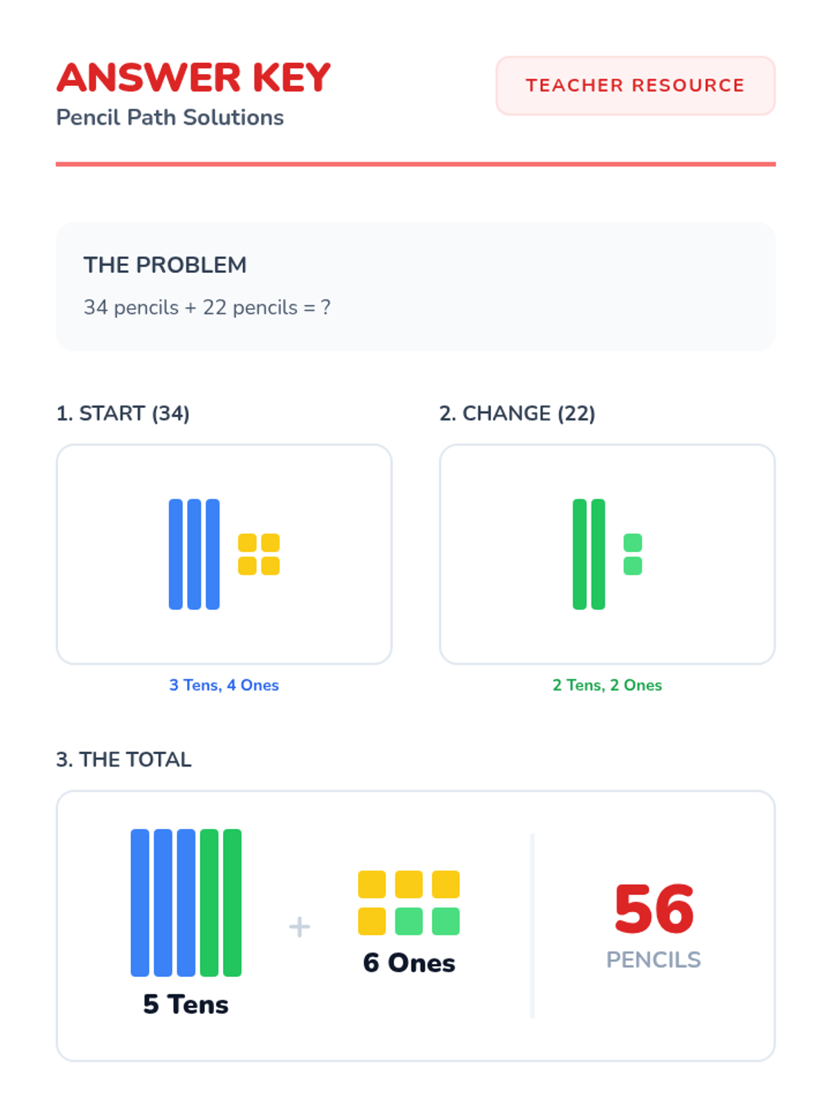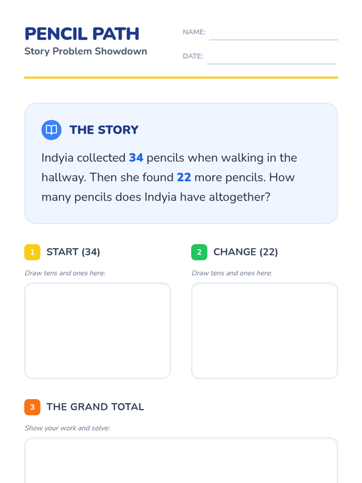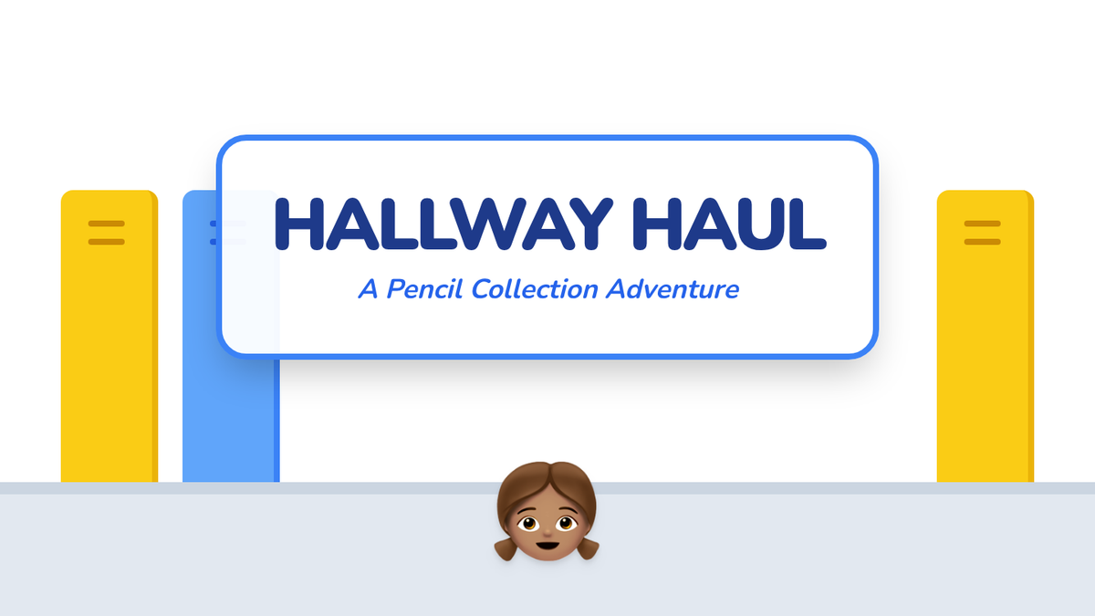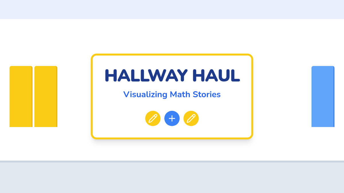 A lesson focused on solving addition story problems using visual representations, featuring a character named Indyia collecting pencils in a school hallway.