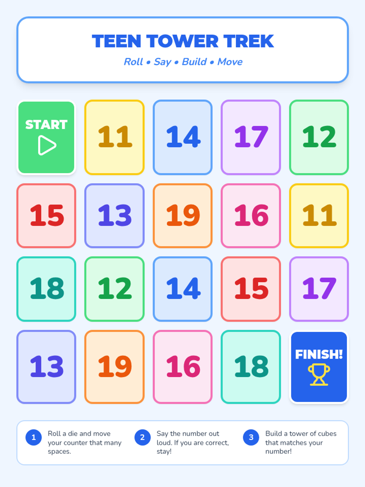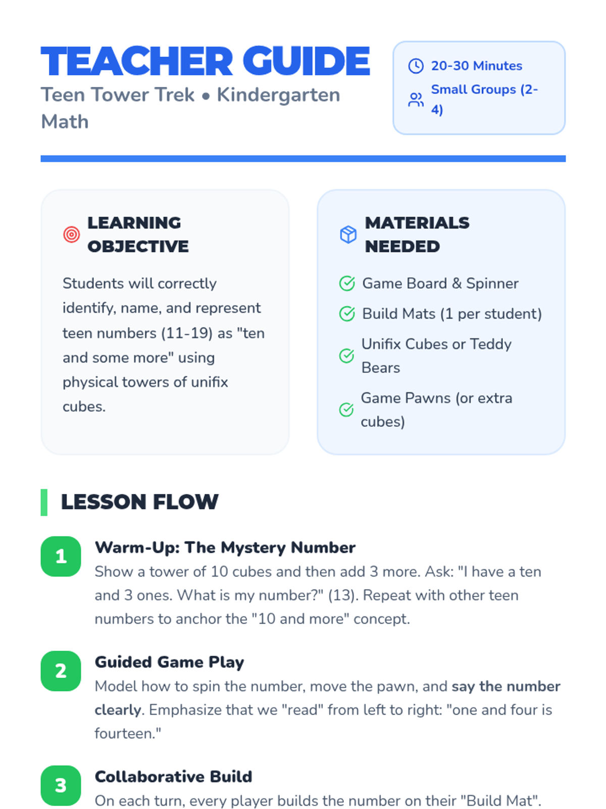 A hands-on kindergarten lesson focused on identifying and representing teen numbers 11-19 using physical manipulatives and a collaborative board game. Students build 'towers' to visualize the 'ten and some more' structure of teen numbers.