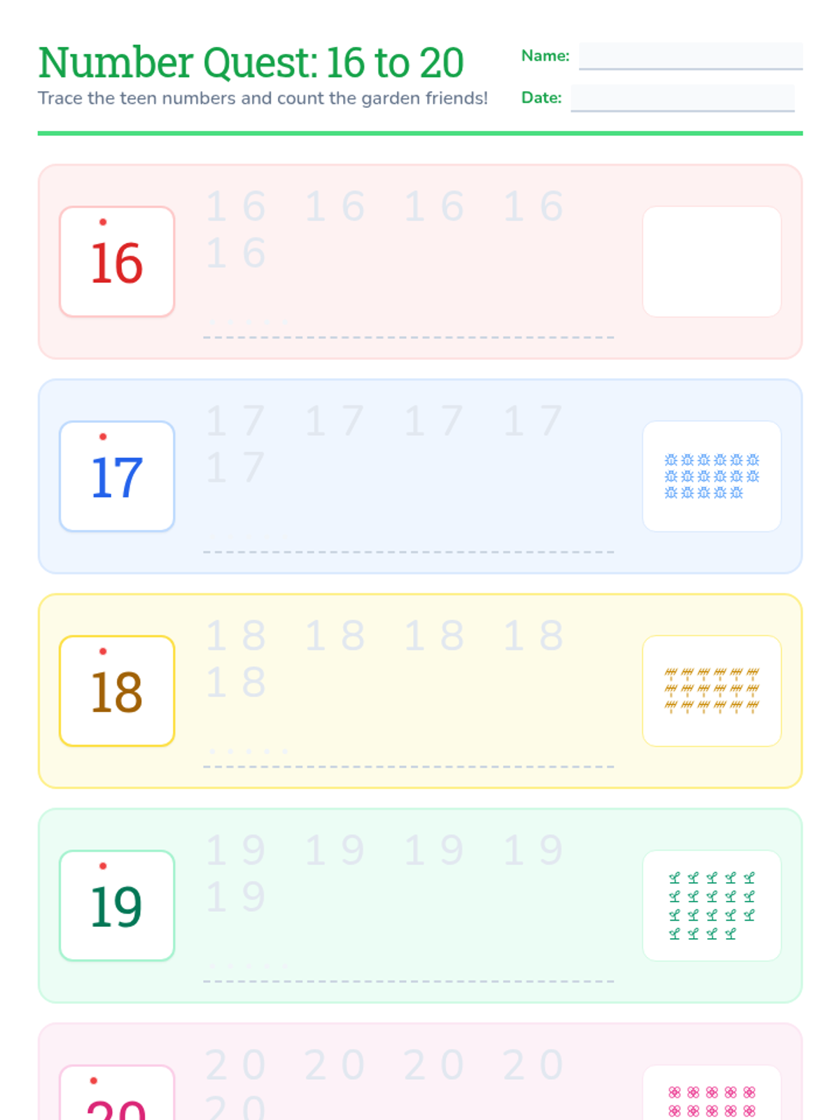 A series of hands-on tracing and counting activities designed to help Kindergarten students master number formation and recognition for numbers 1-20.