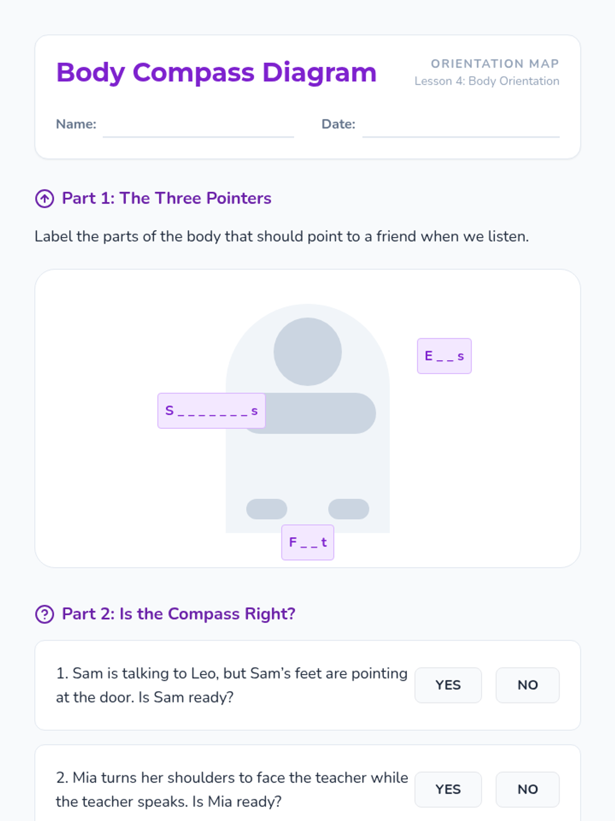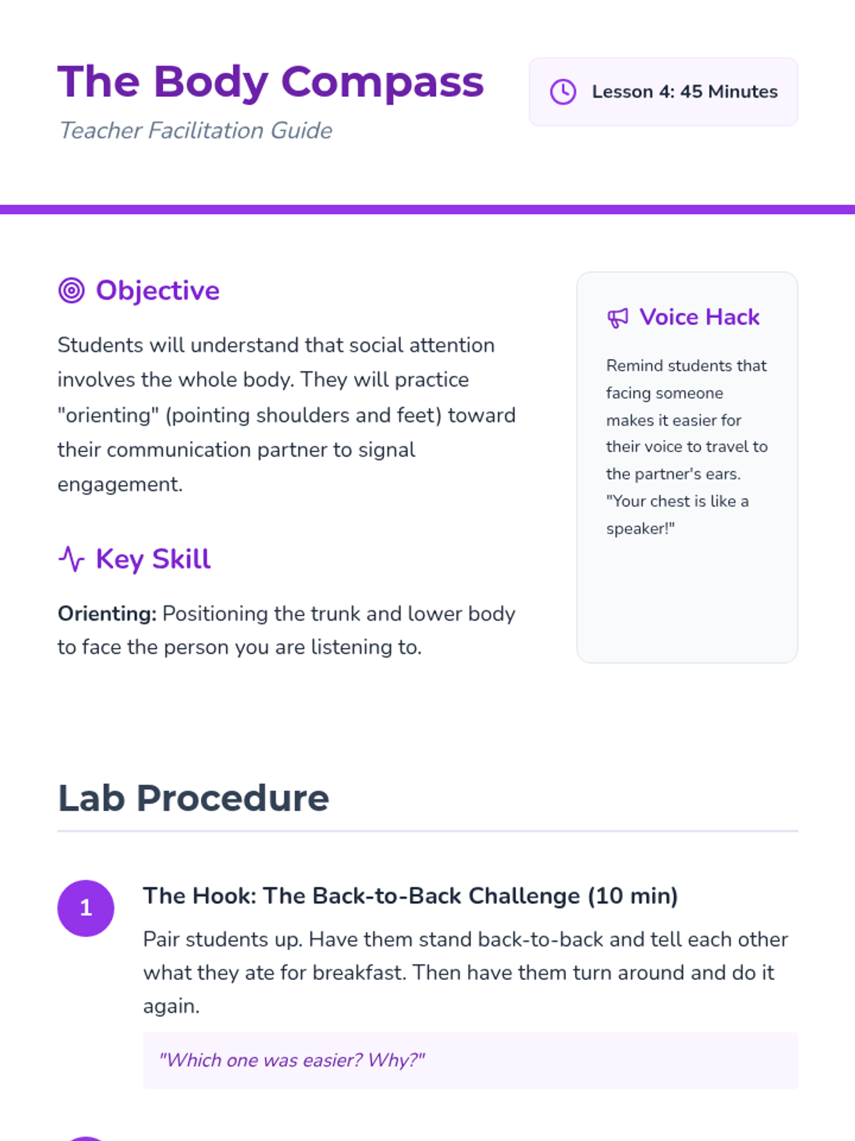 Connects eye contact with body positioning, teaching students to orient their shoulders and feet toward their partner to signal attention.