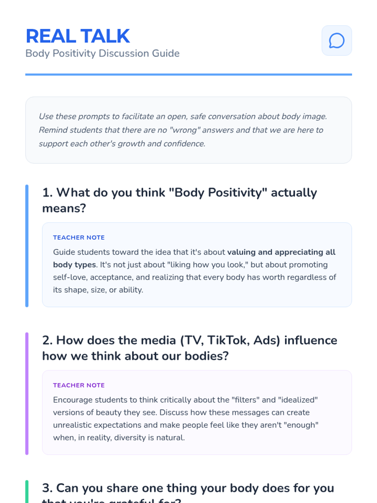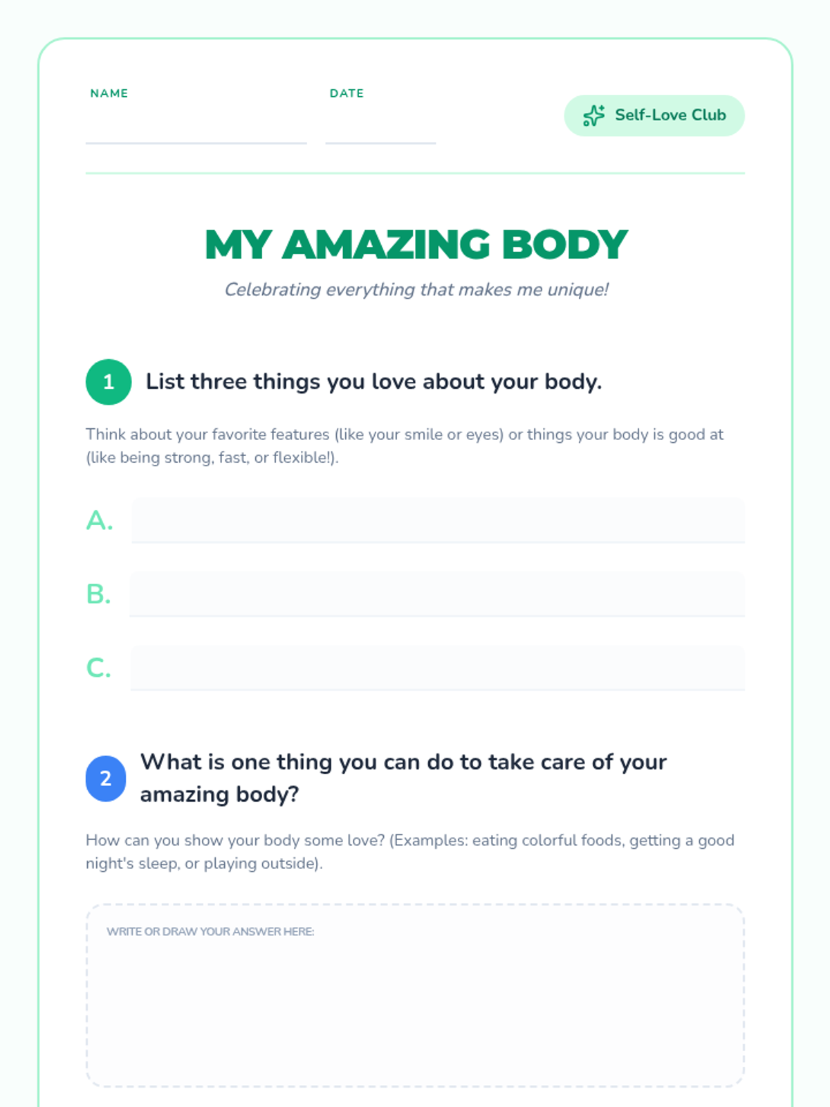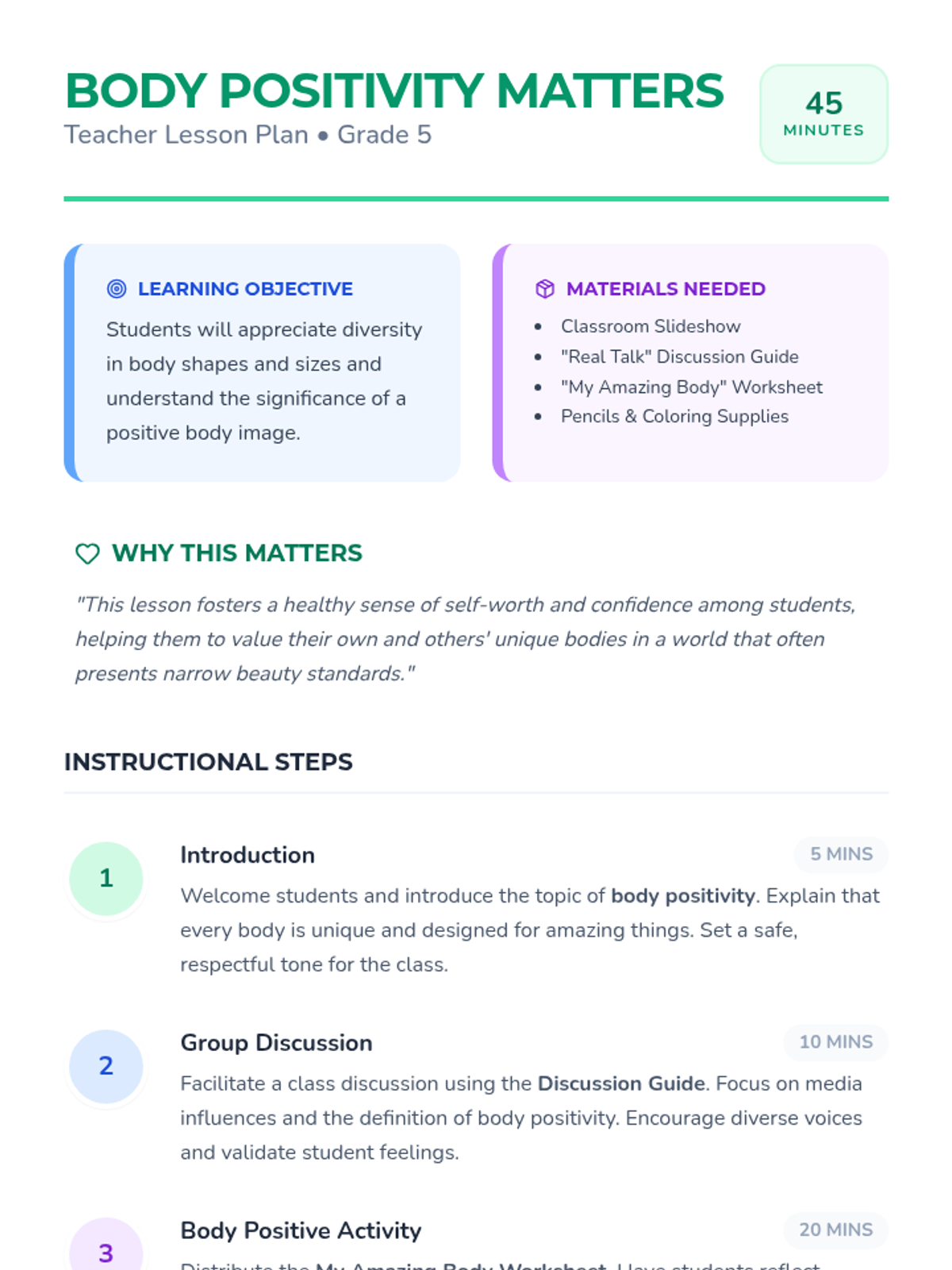 Students will learn about the significance of having a positive body image and appreciate diversity in body shapes and sizes through discussion, reflection, and creative activities. This lesson fosters self-worth and confidence, helping 5th graders value their own and others' unique bodies.