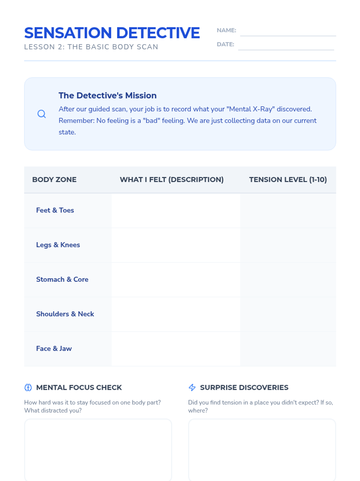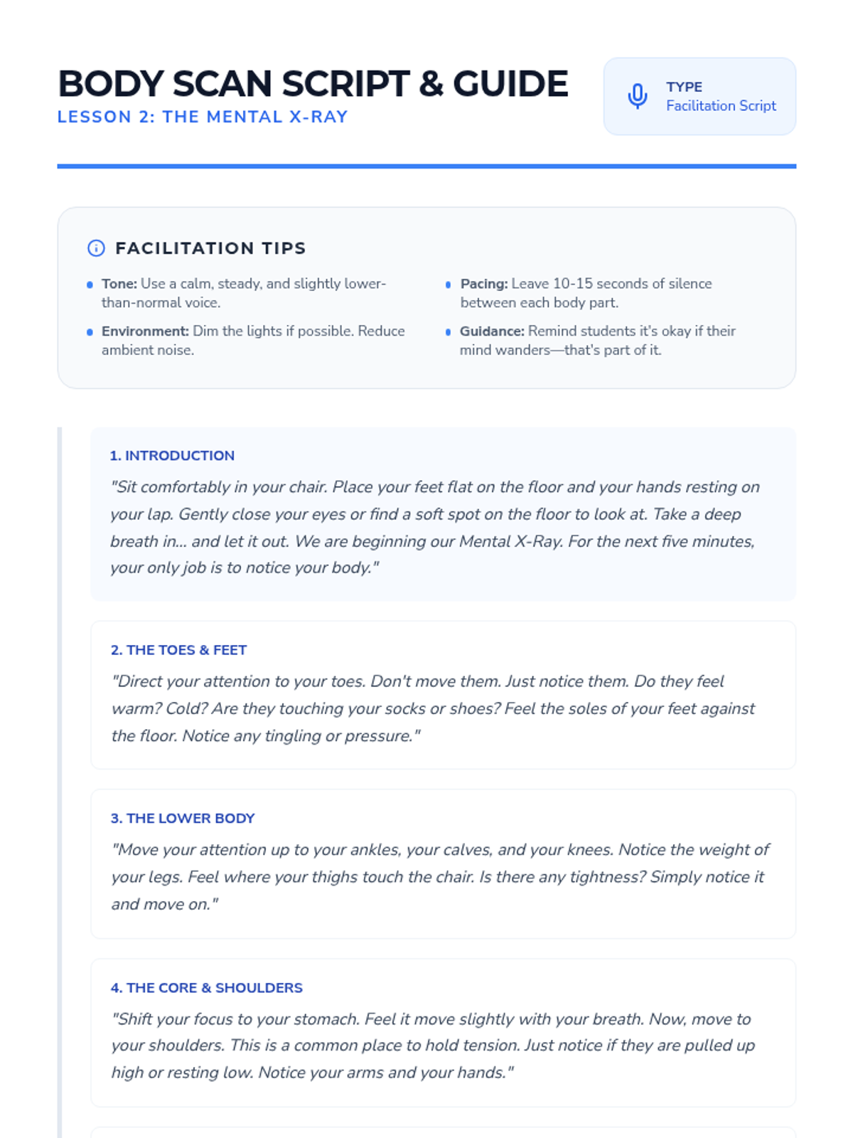 Students participate in a guided 'Body Scan' meditation, moving their attention systematically from toes to head to practice noticing physical sensations without judgment.