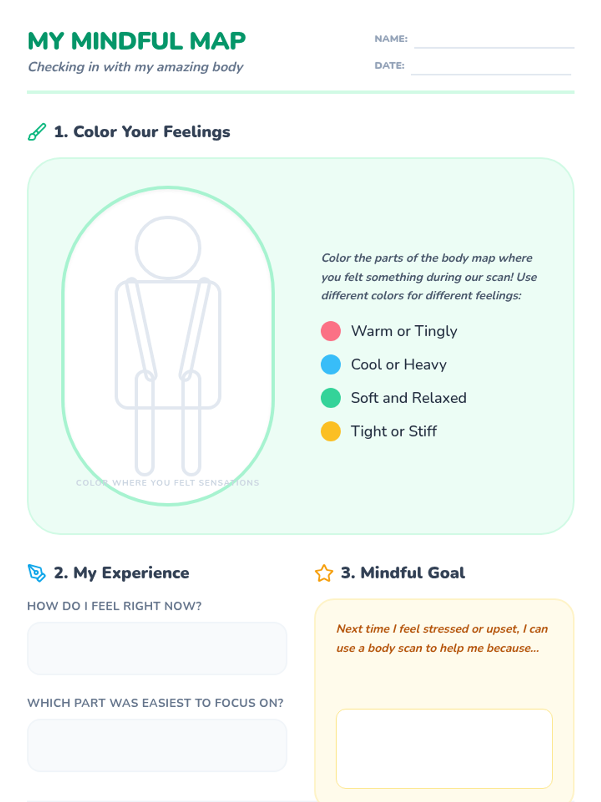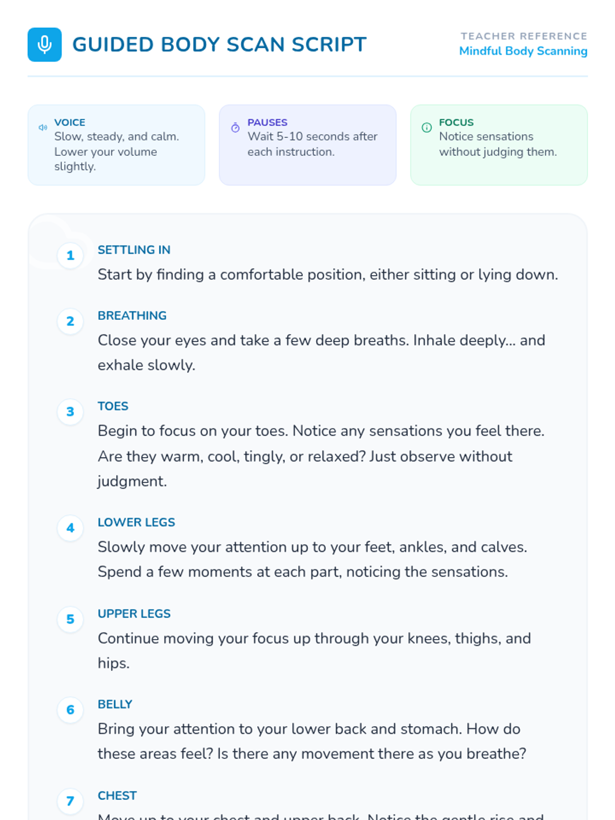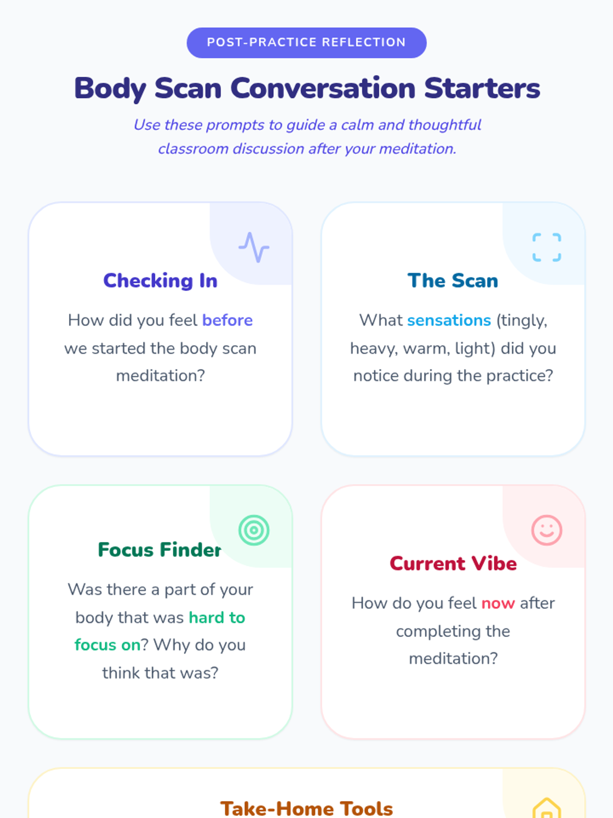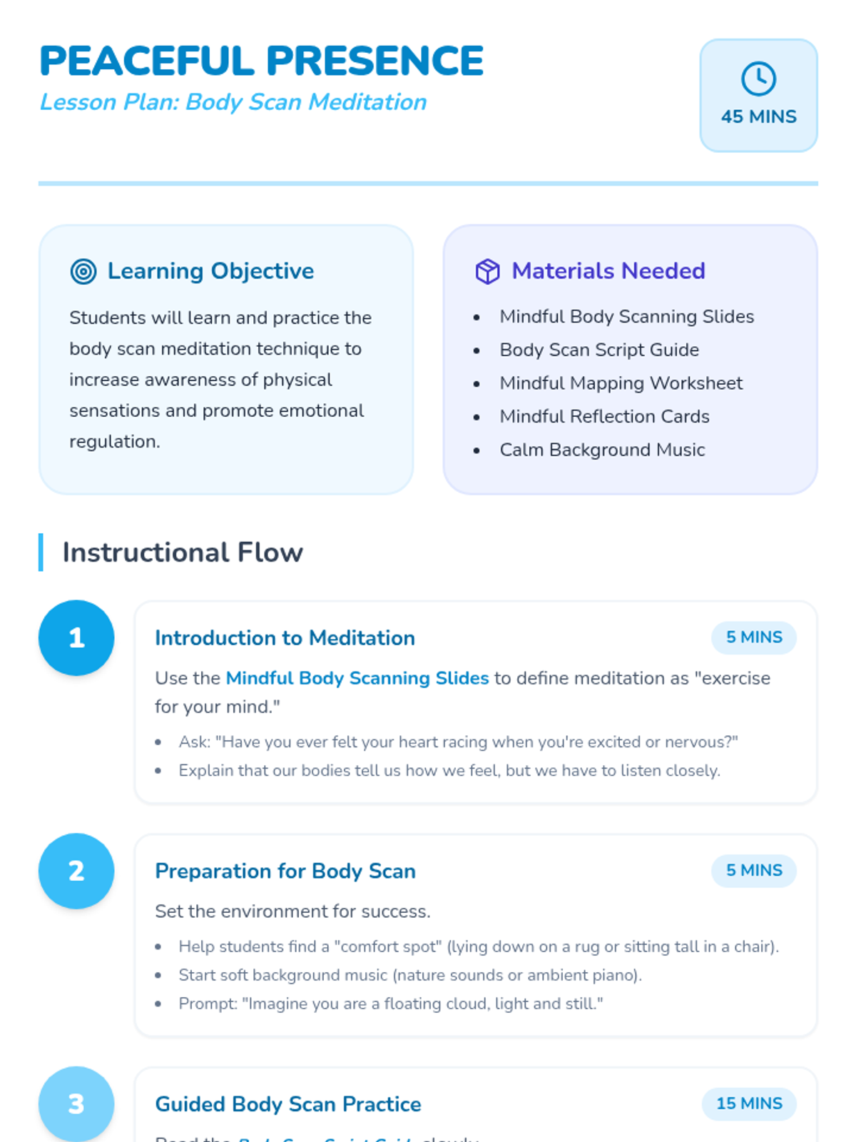 Students will learn the body scan meditation technique to become more aware of their bodily sensations and promote relaxation.