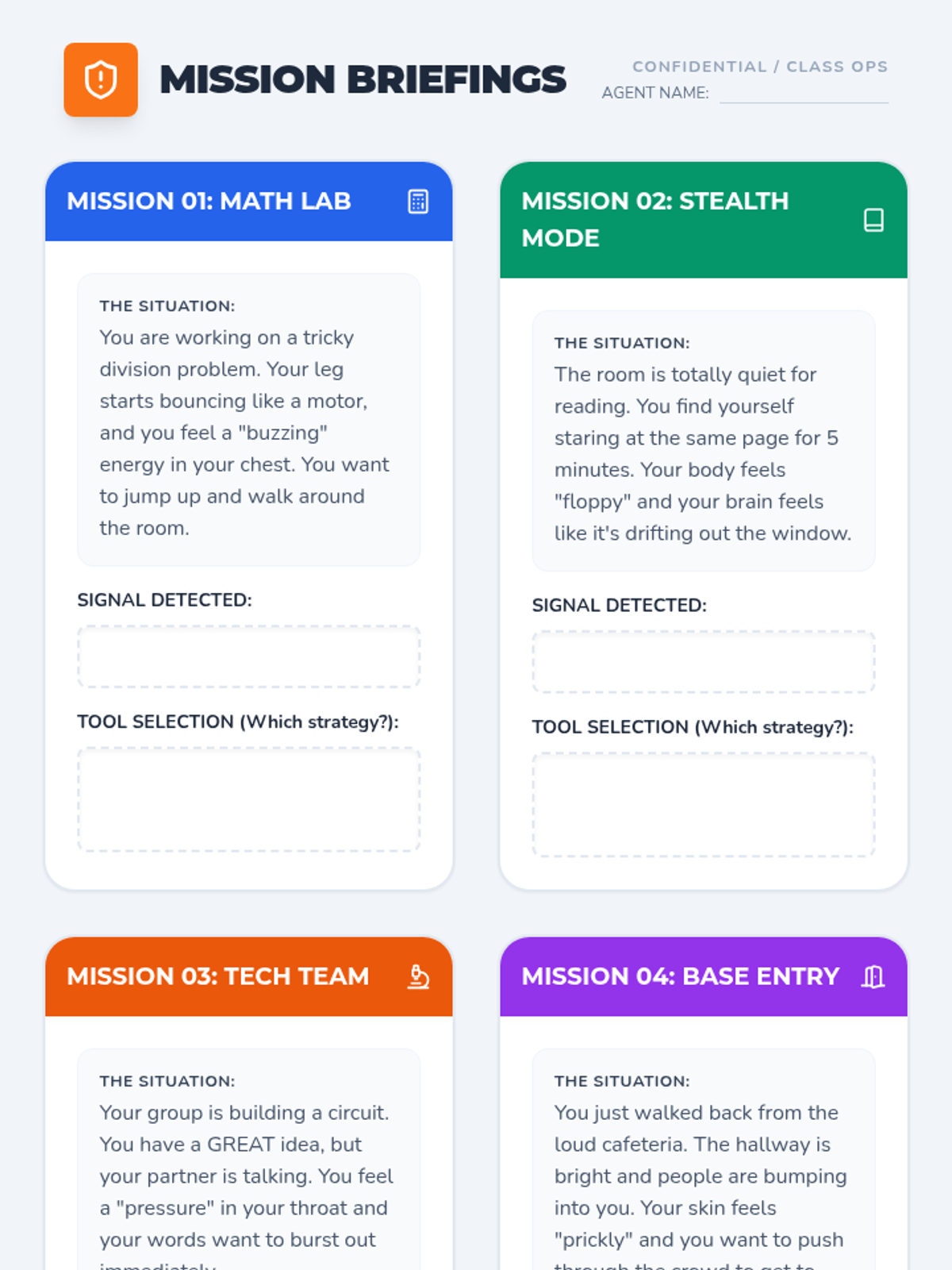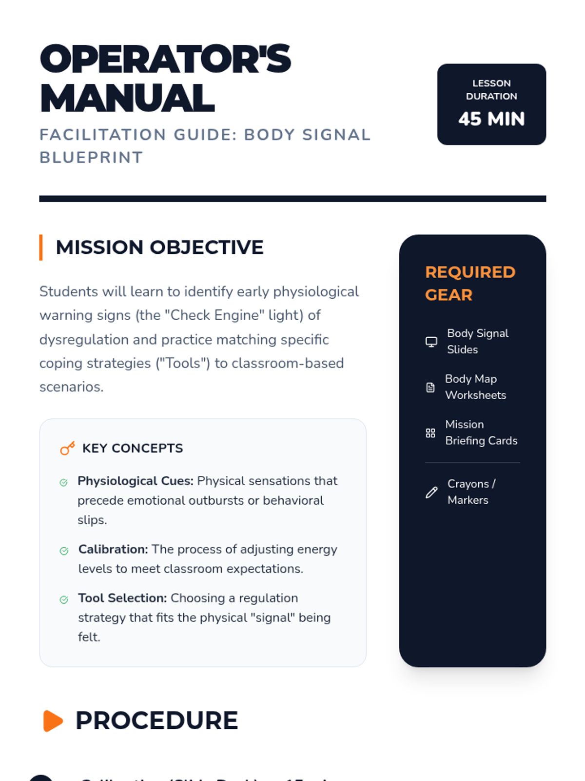 A comprehensive lesson designed for 5th graders to identify internal body signals of dysregulation and apply specific coping strategies across different classroom settings.