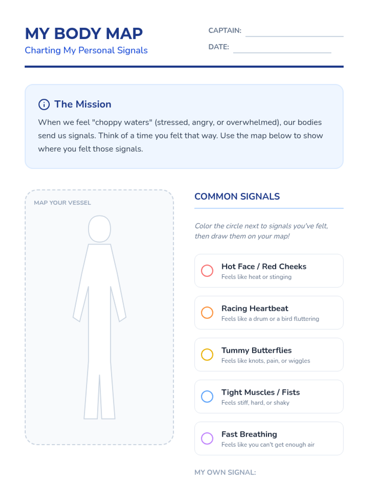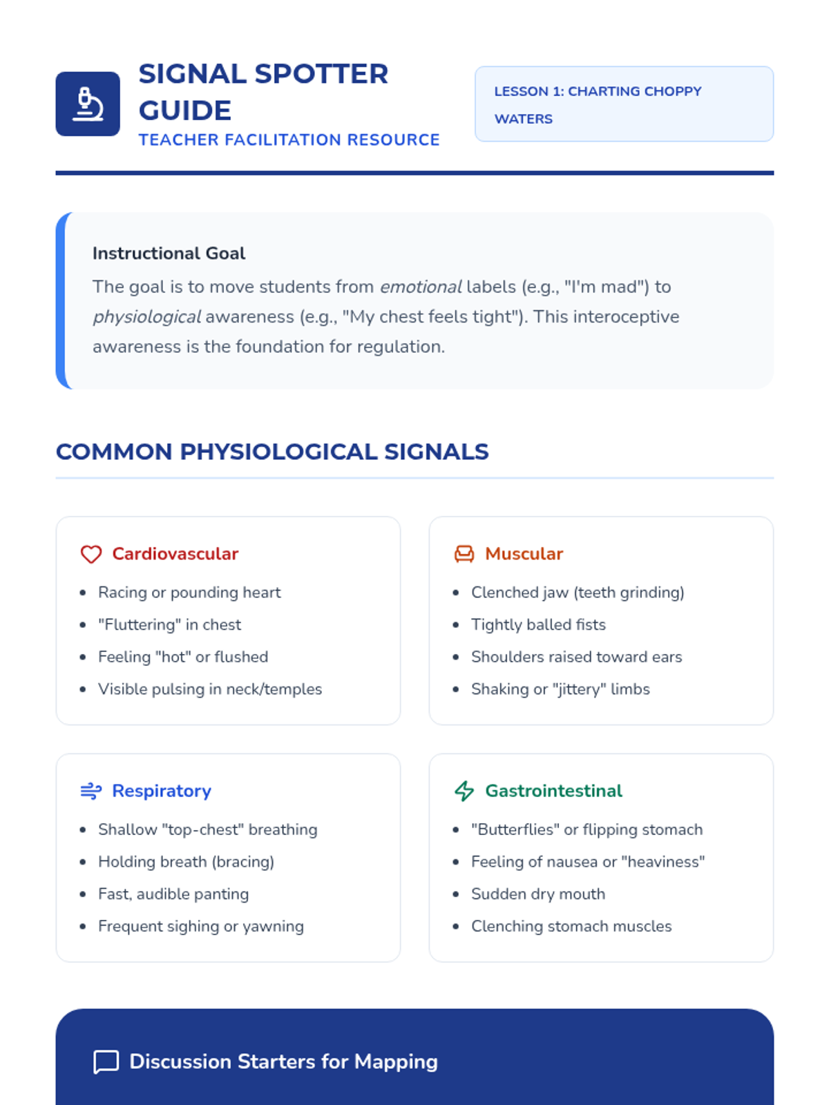 Students learn to identify physiological indicators that their body has left its baseline state. They use body outline diagrams to map where they feel dysregulation and discuss the concept of 'recovery' as a physiological reset.
