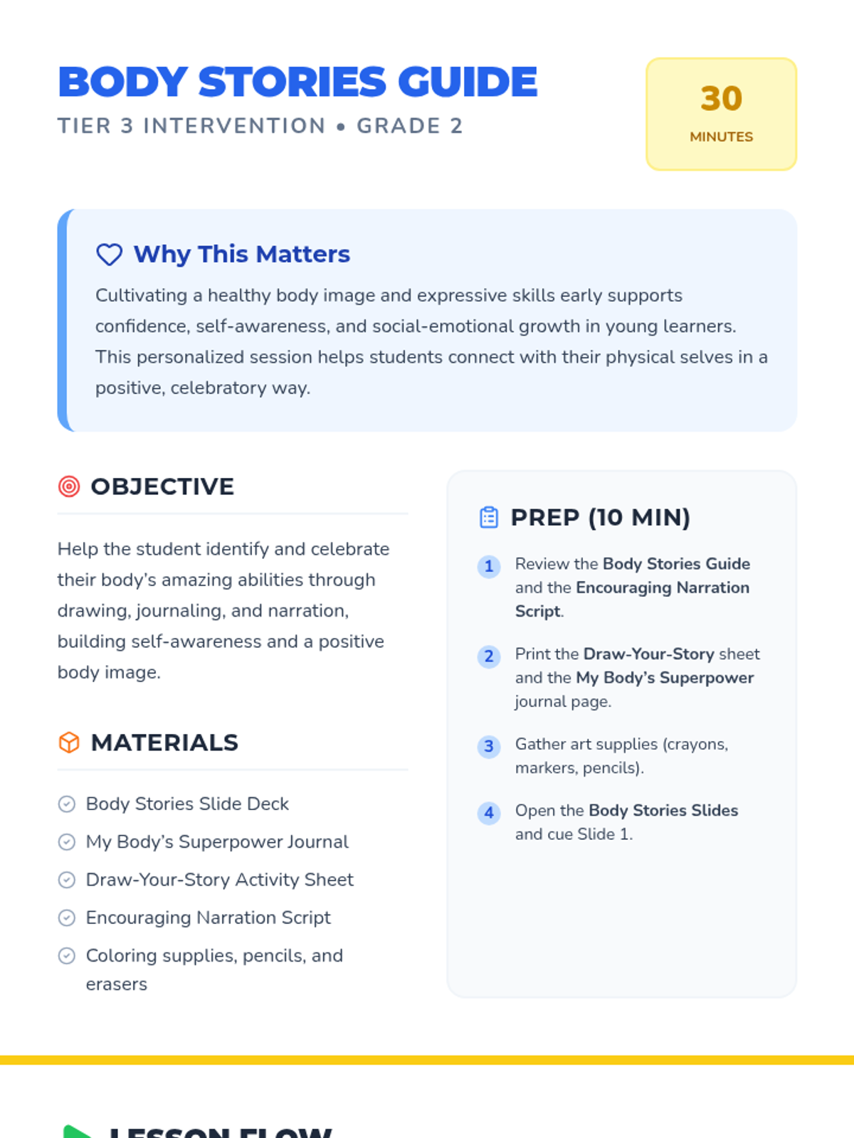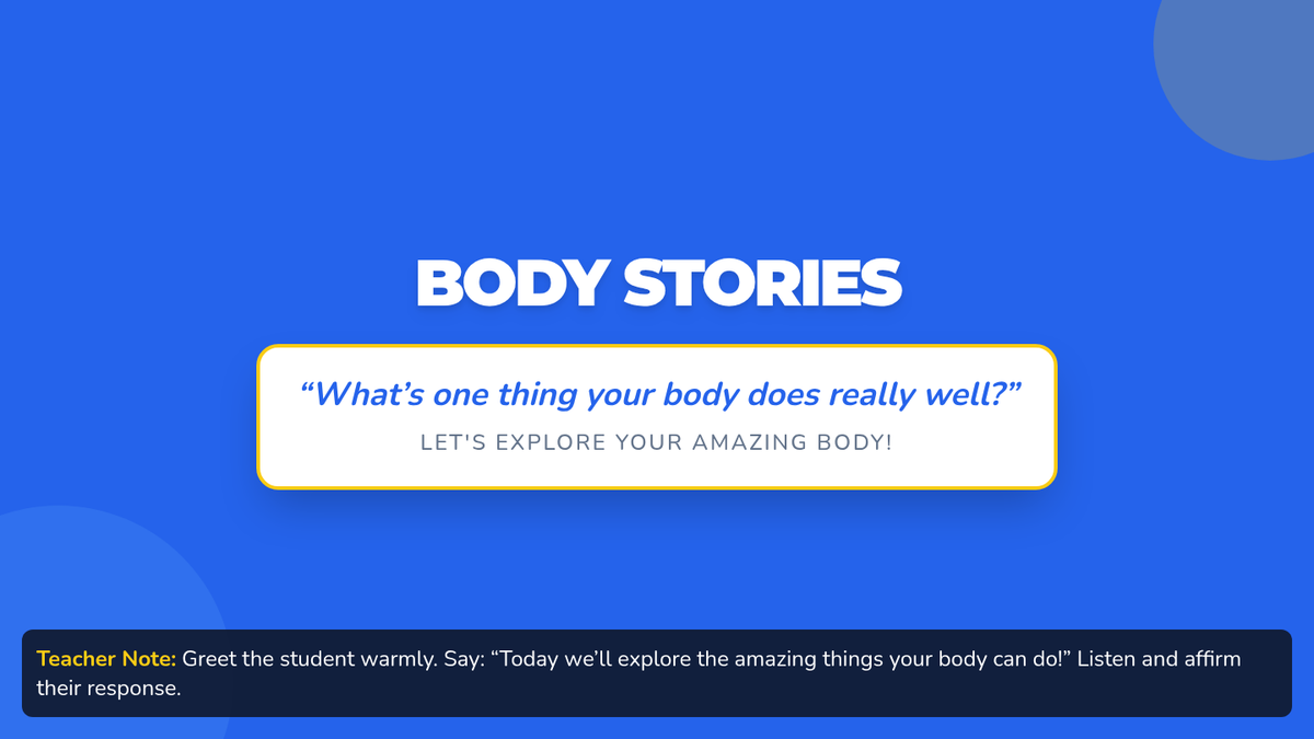 A personalized Tier 3 session where 2nd graders explore their body's amazing abilities through drawing, narration, and journaling to build self-awareness and positive body image.