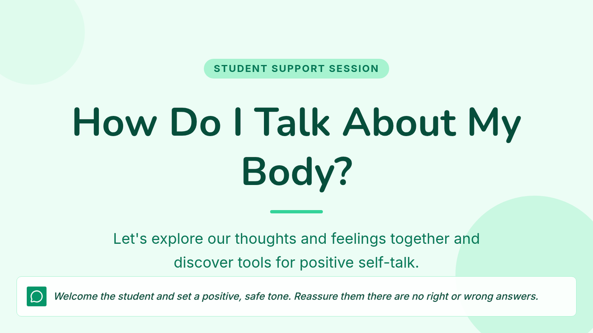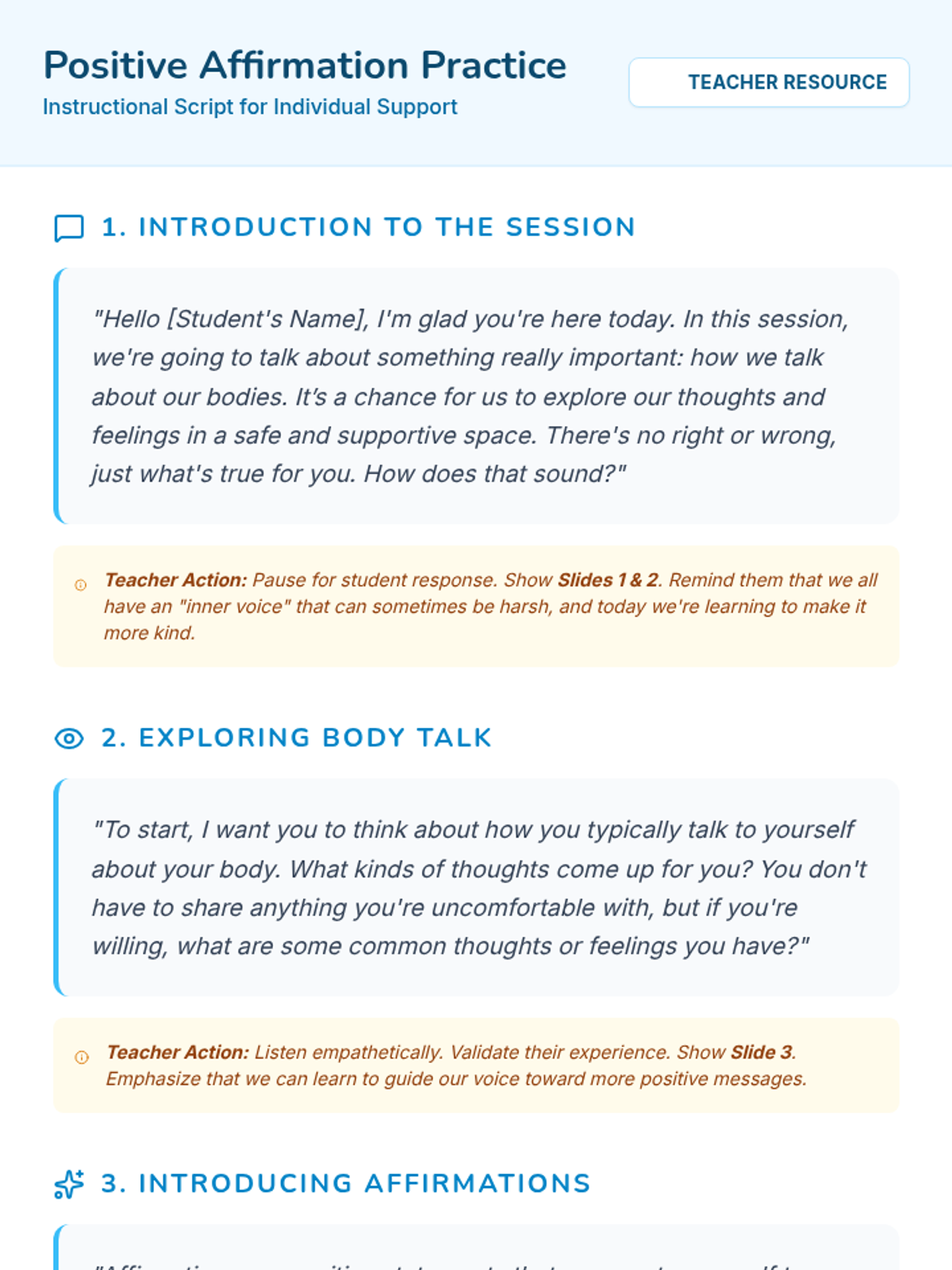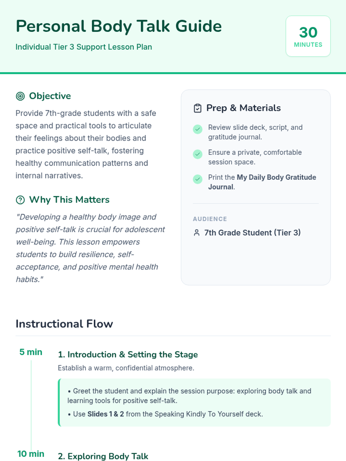 A supportive Tier 3 intervention for 7th grade students to develop healthy communication patterns and positive internal narratives regarding body image. through guided reflection and practical tools.