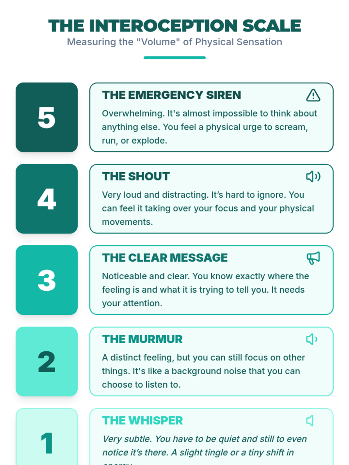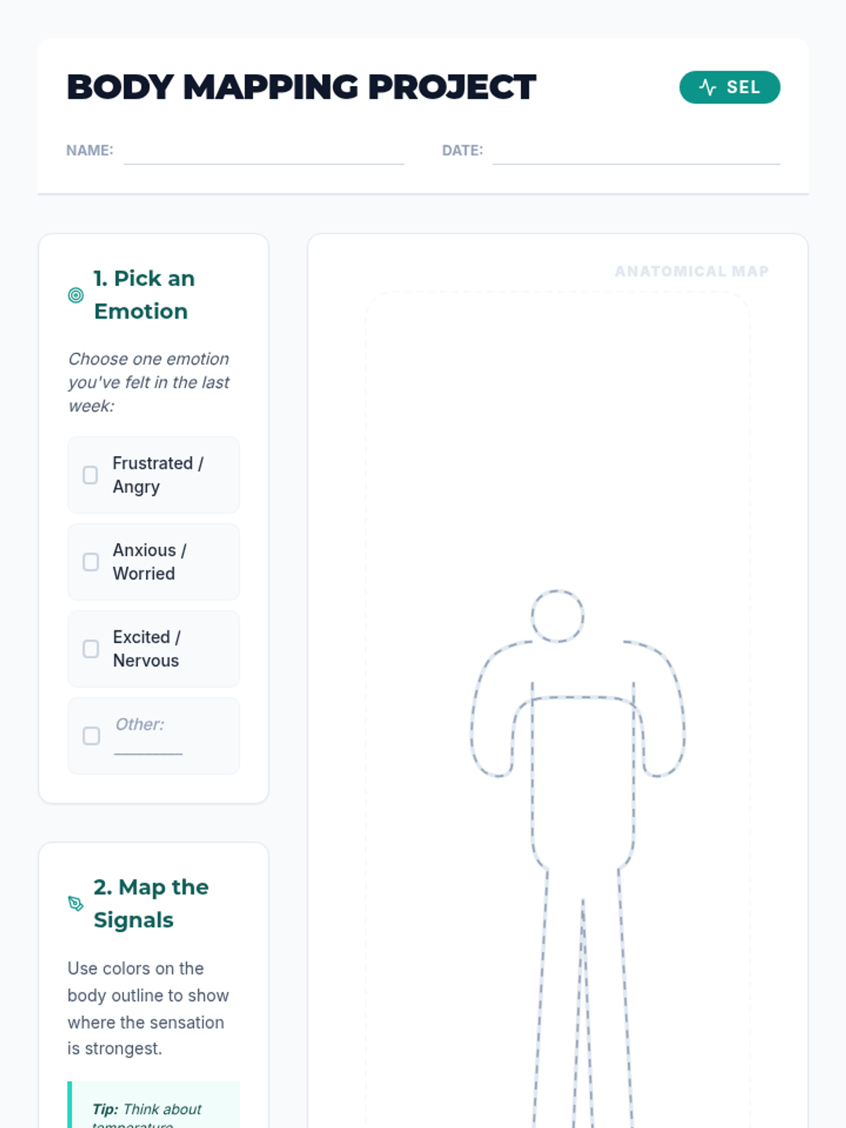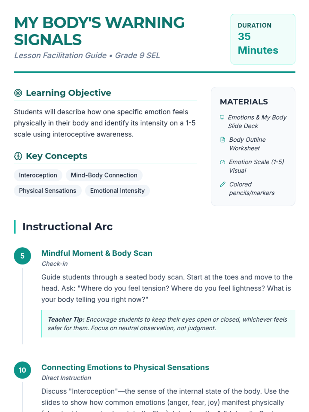 A 35-minute lesson helping 9th graders recognize physical sensations associated with emotions through interoception and intensity scaling.