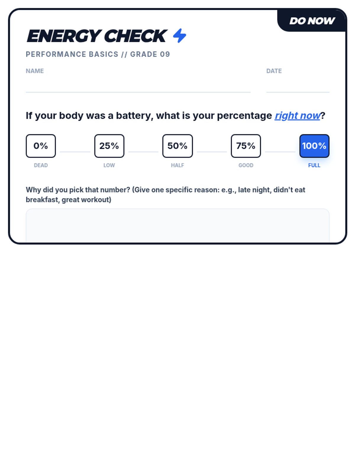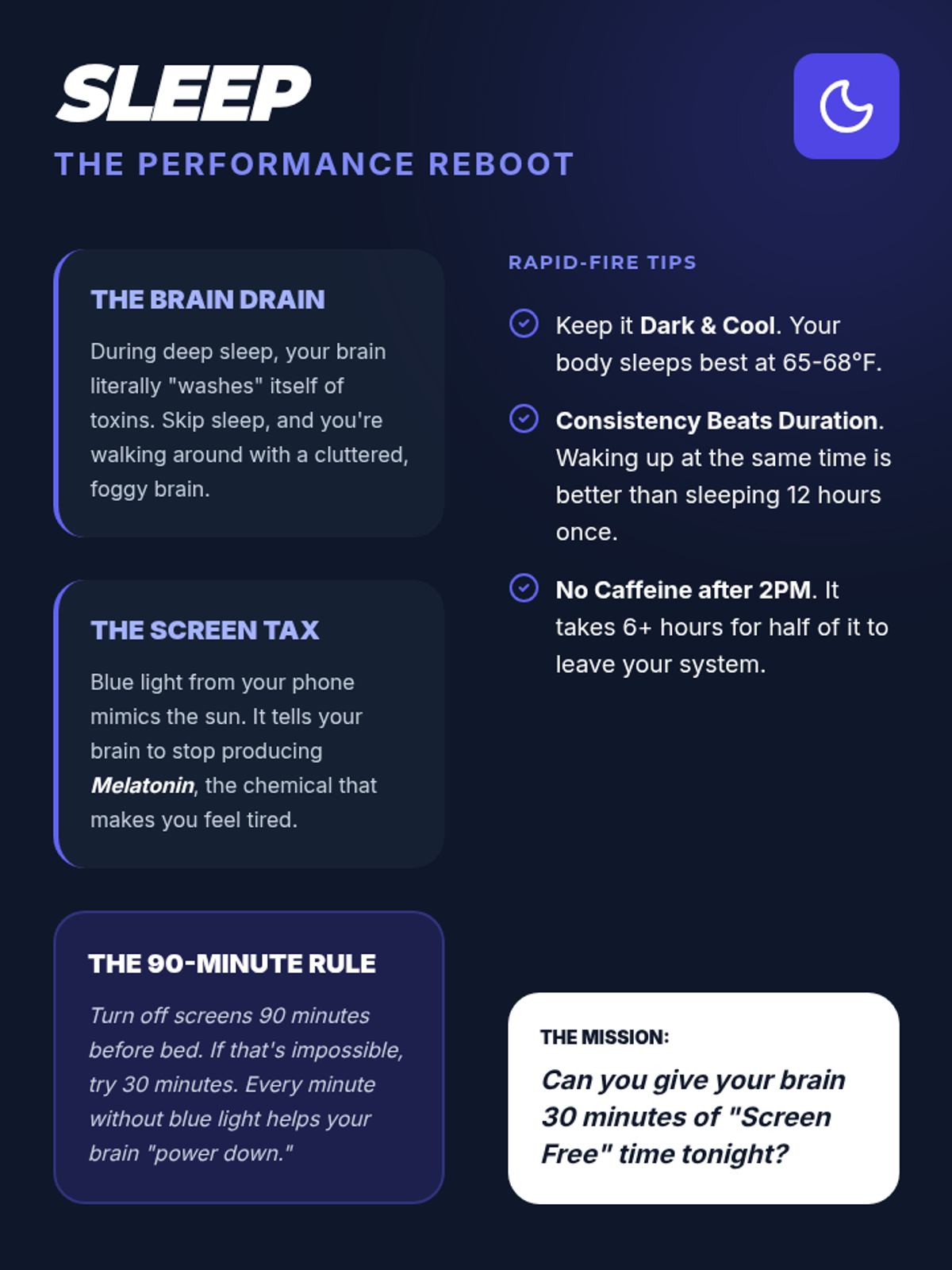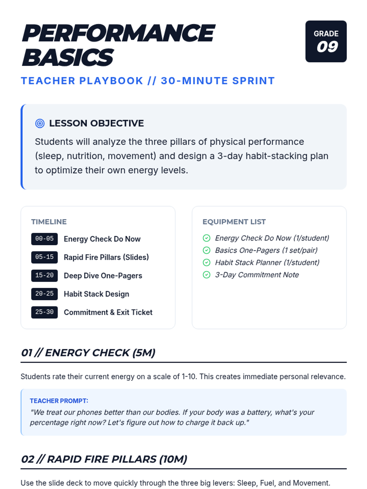 A fast-paced, 30-minute introduction to the fundamental pillars of physical performance—sleep, nutrition, and movement—culminating in a concrete habit-stacking plan for students to implement over three days.