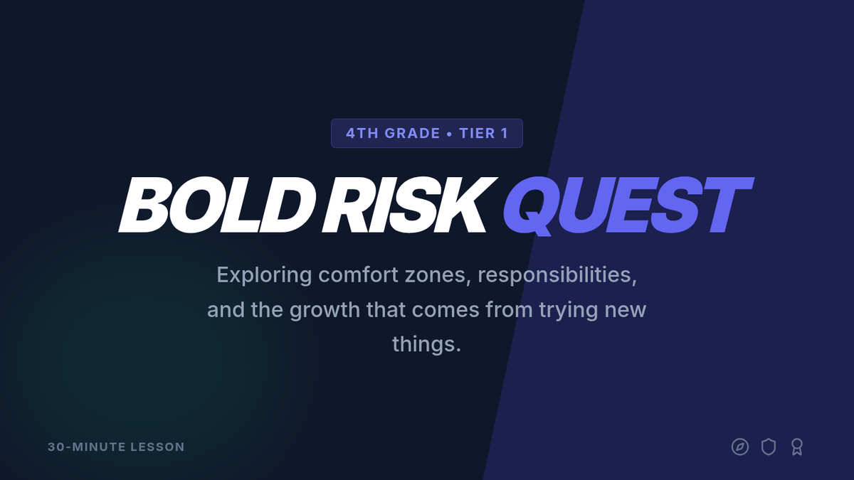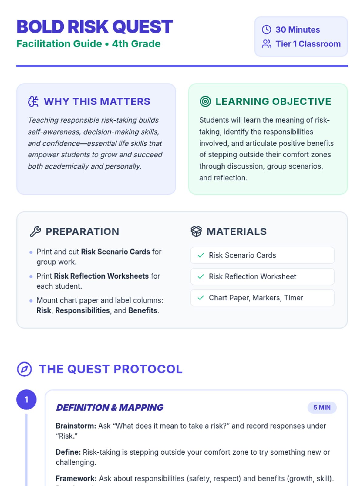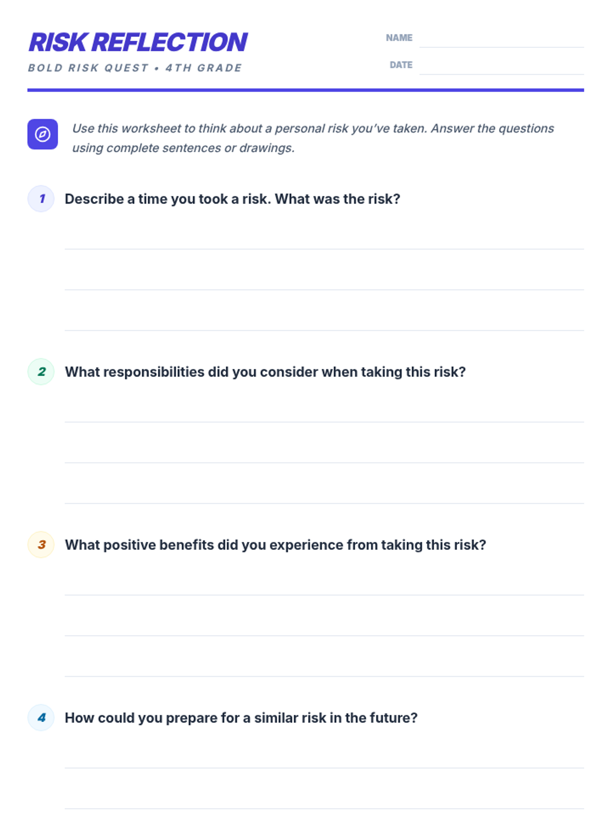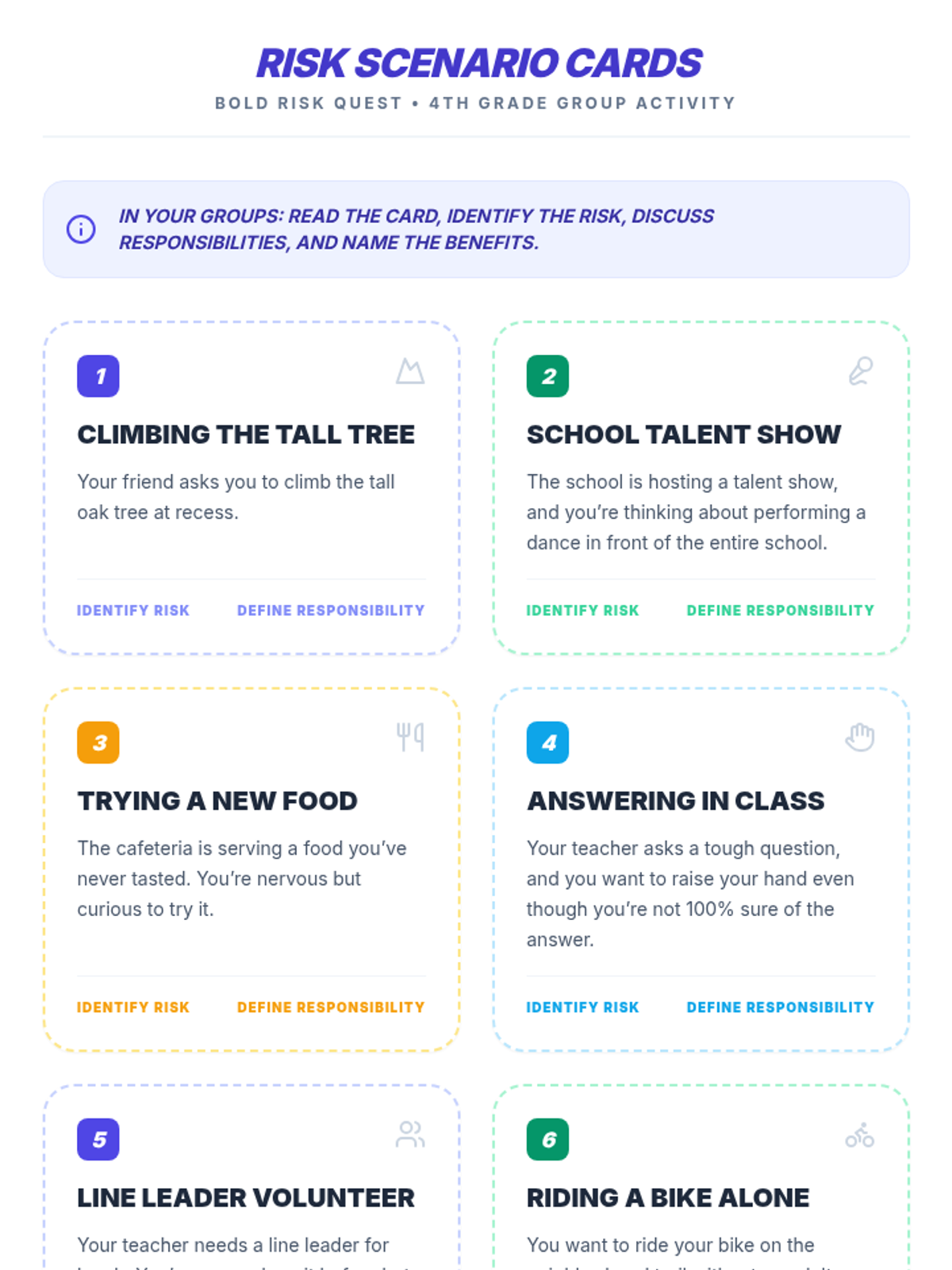 In this 30-minute 4th grade lesson, students will learn the meaning of risk taking, identify the responsibilities involved, and articulate positive benefits of stepping outside their comfort zones through discussion, group scenario work, and personal reflection.