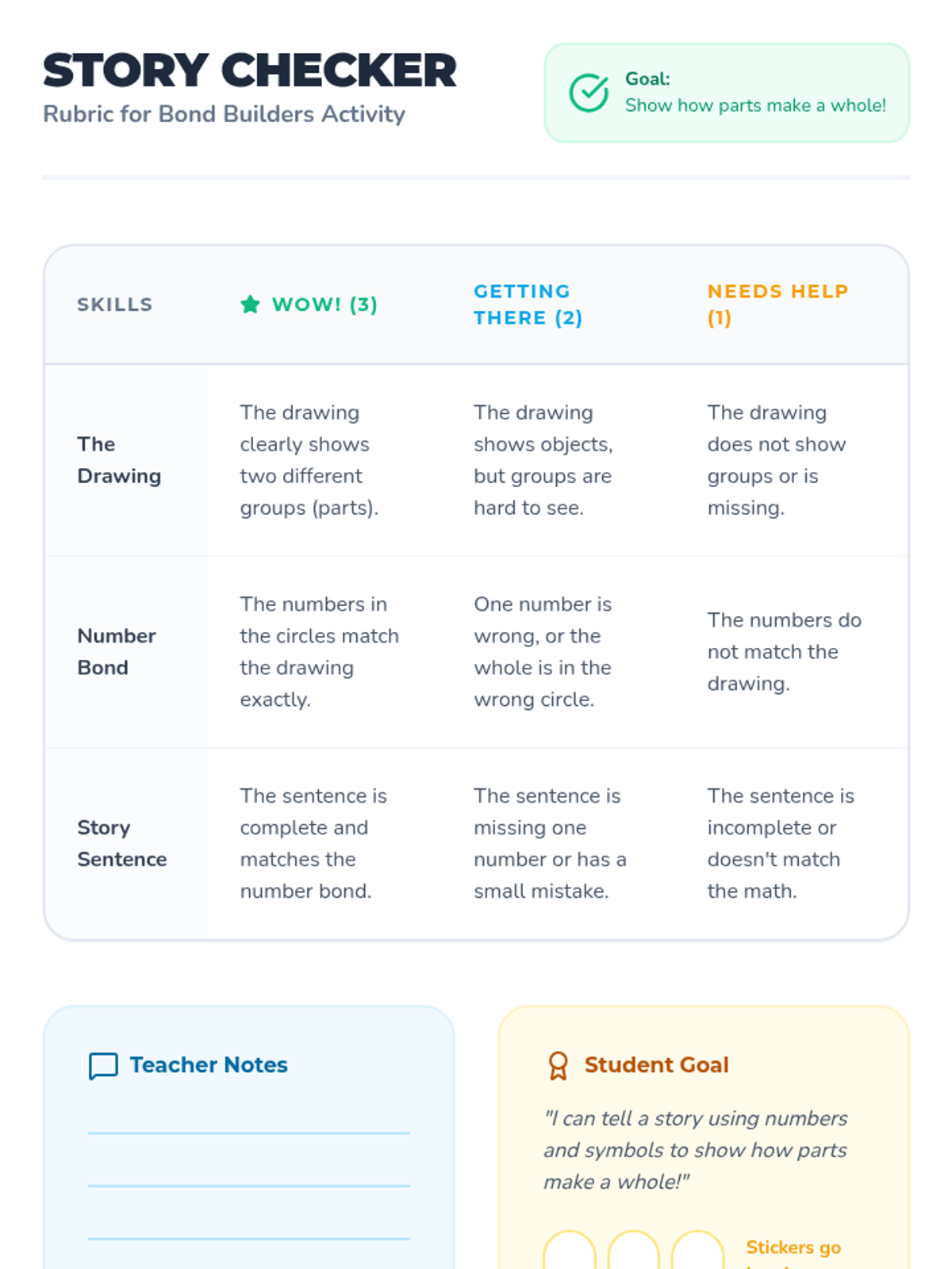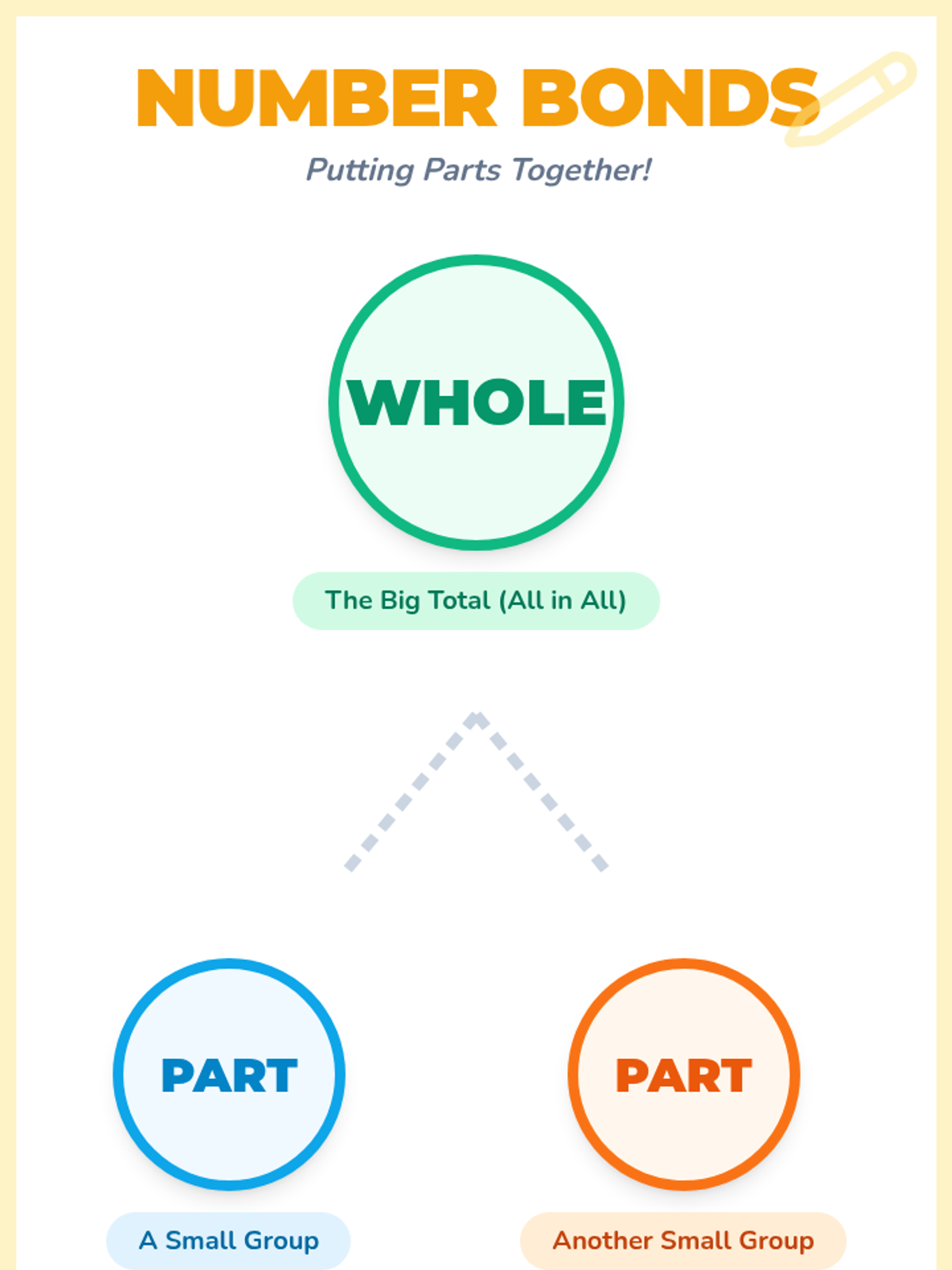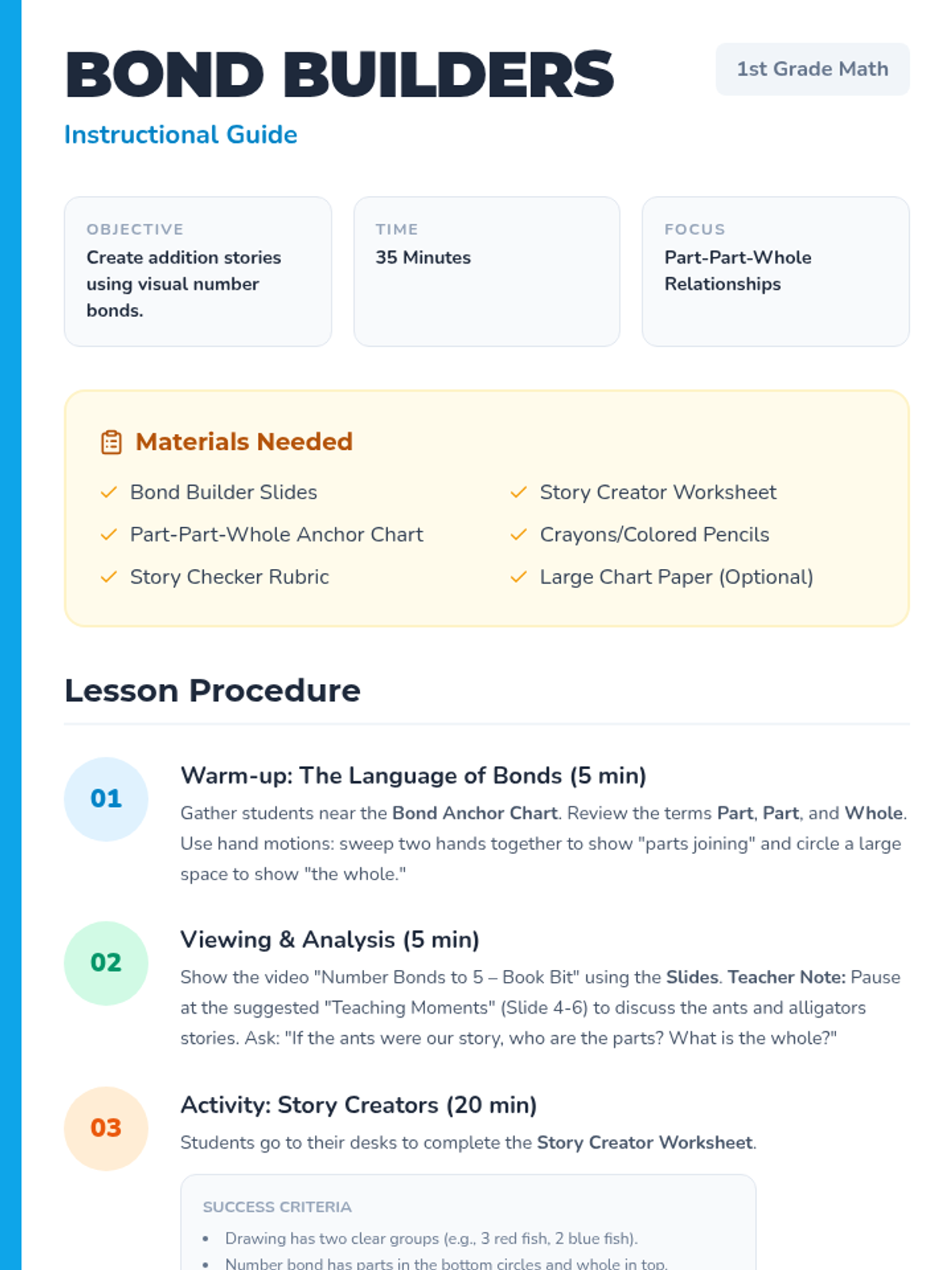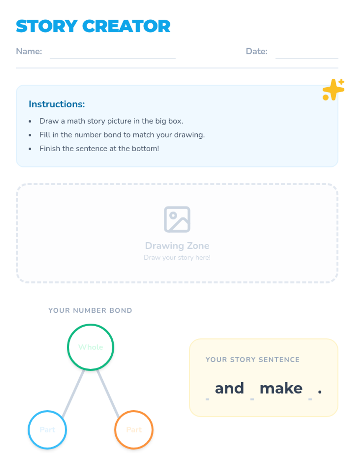 A 1st-grade math lesson where students use number bonds to create and illustrate their own addition story problems, bridging the gap between concrete visuals and abstract number sentences.