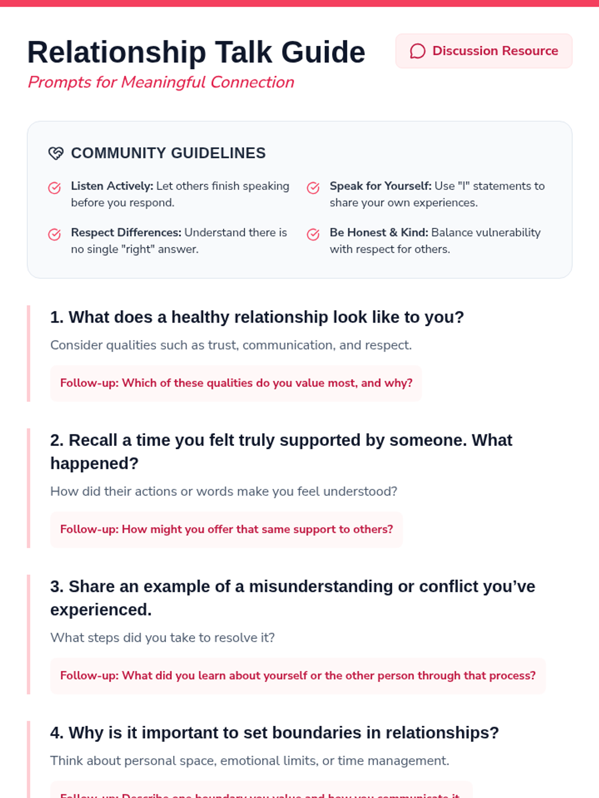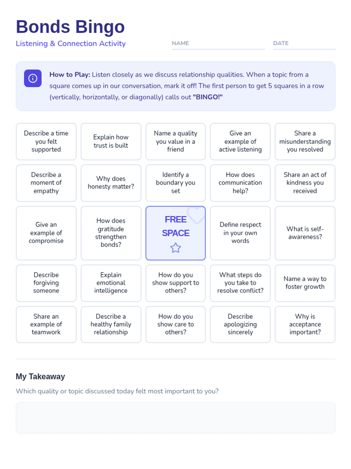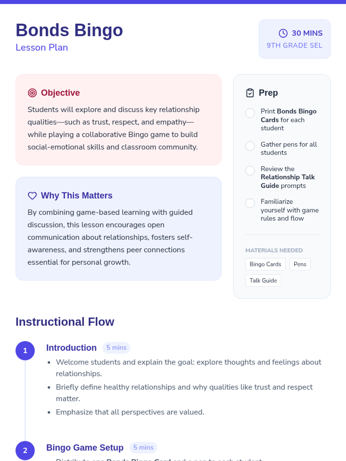 A 30-minute social-emotional learning lesson where 9th graders play a relationship-themed Bingo game to explore trust, respect, and empathy. Students engage in guided discussions while marking off squares on their Bingo cards, fostering classroom community and self-awareness.
