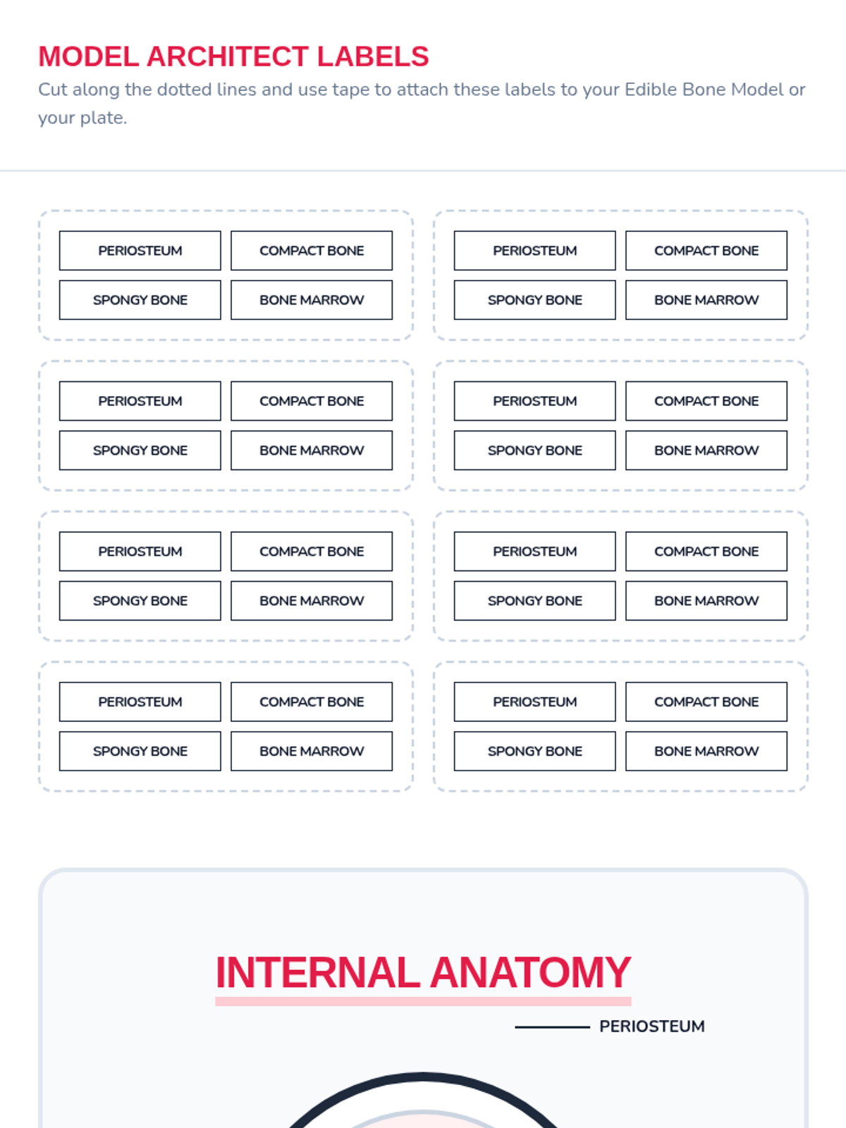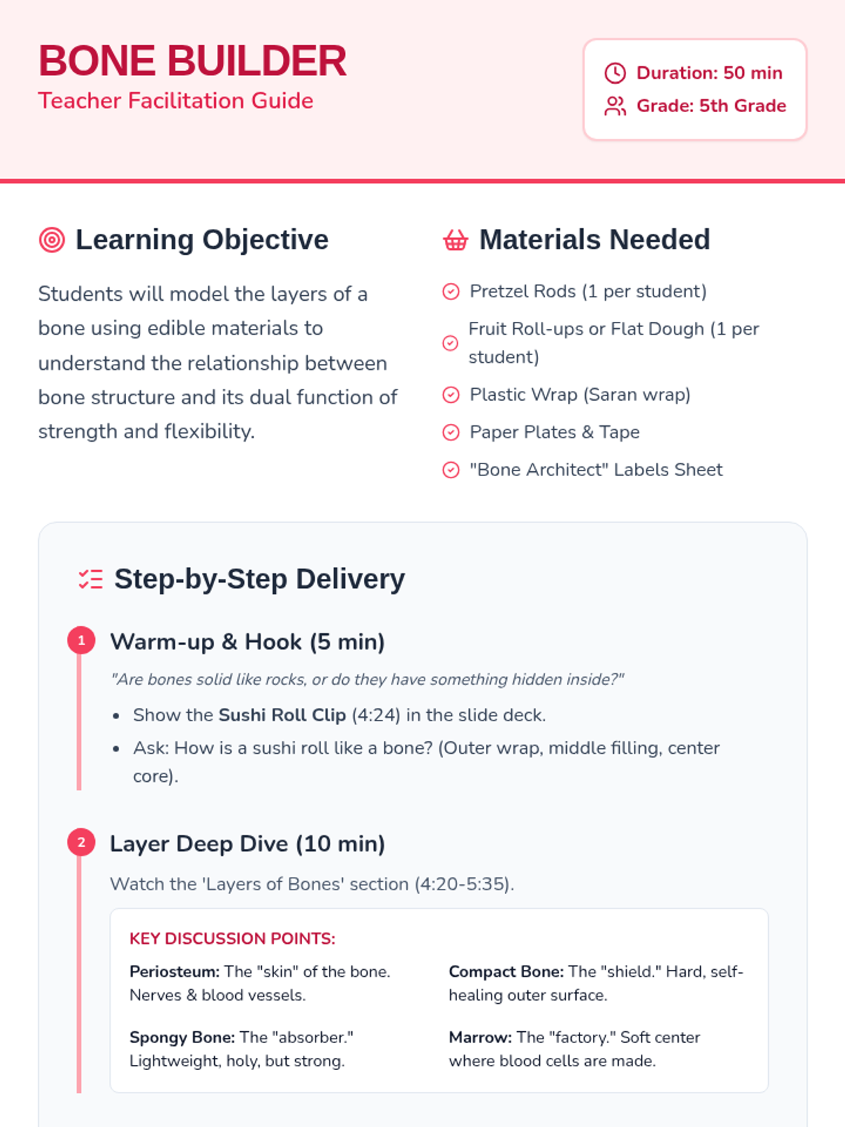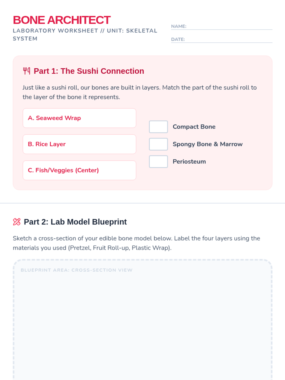 Students investigate the internal structure of human bones by comparing them to sushi rolls and building edible cross-section models to identify the four key layers: periosteum, compact bone, spongy bone, and marrow.