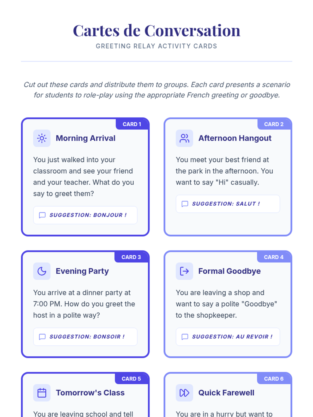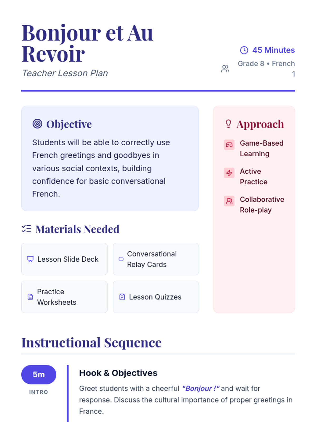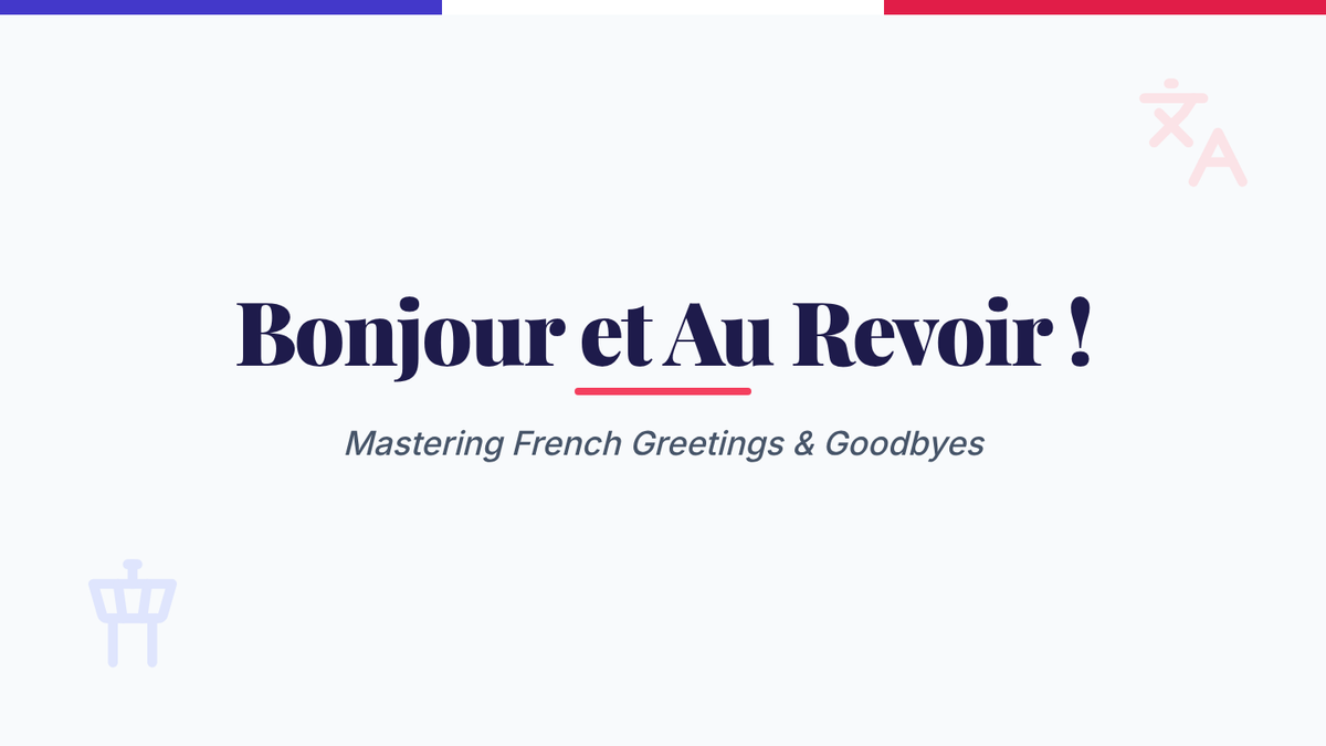 A beginner French lesson focused on essential greetings and goodbyes. Students will learn how to greet others and say farewell through interactive games, role-play, and structured practice.