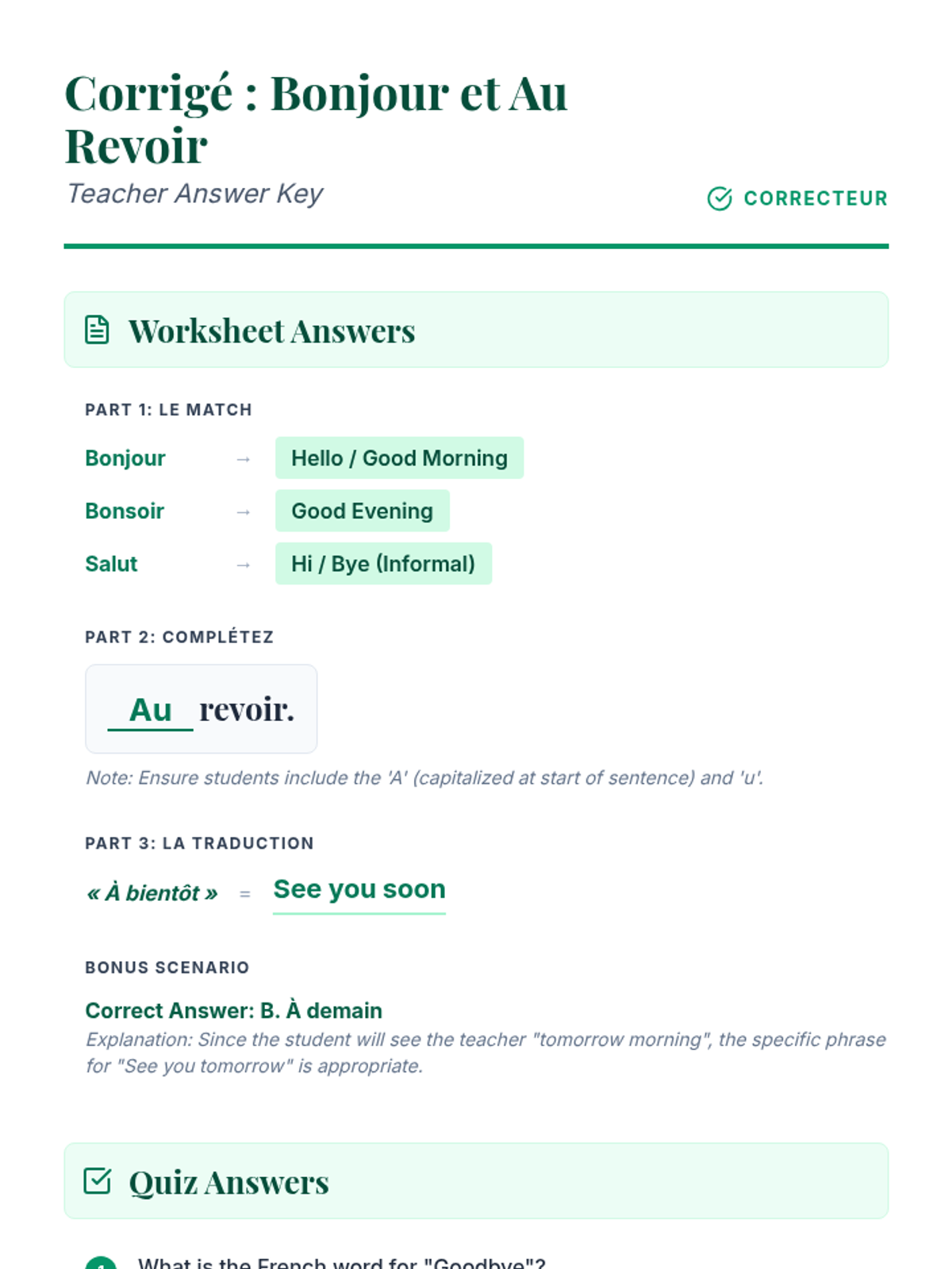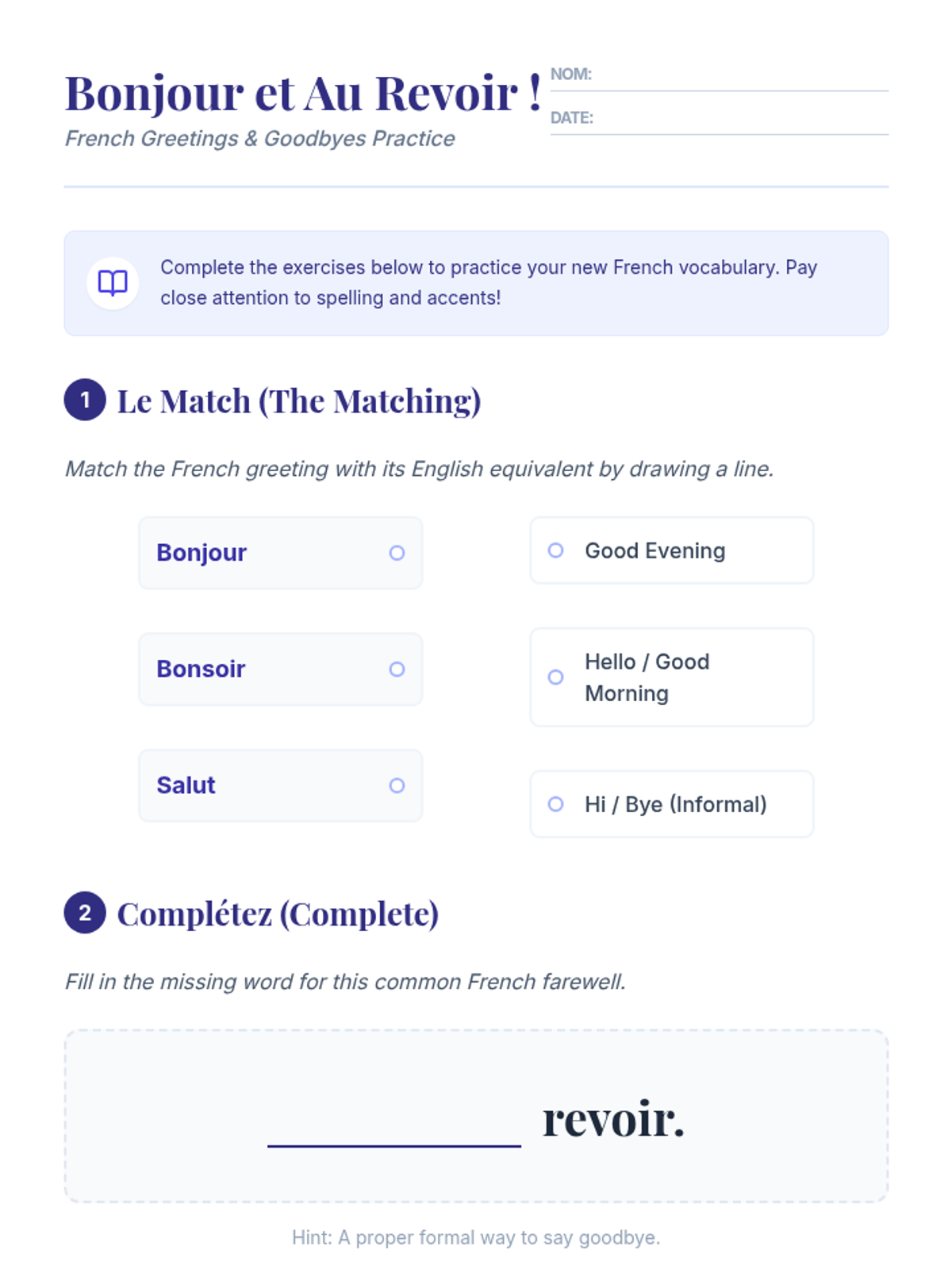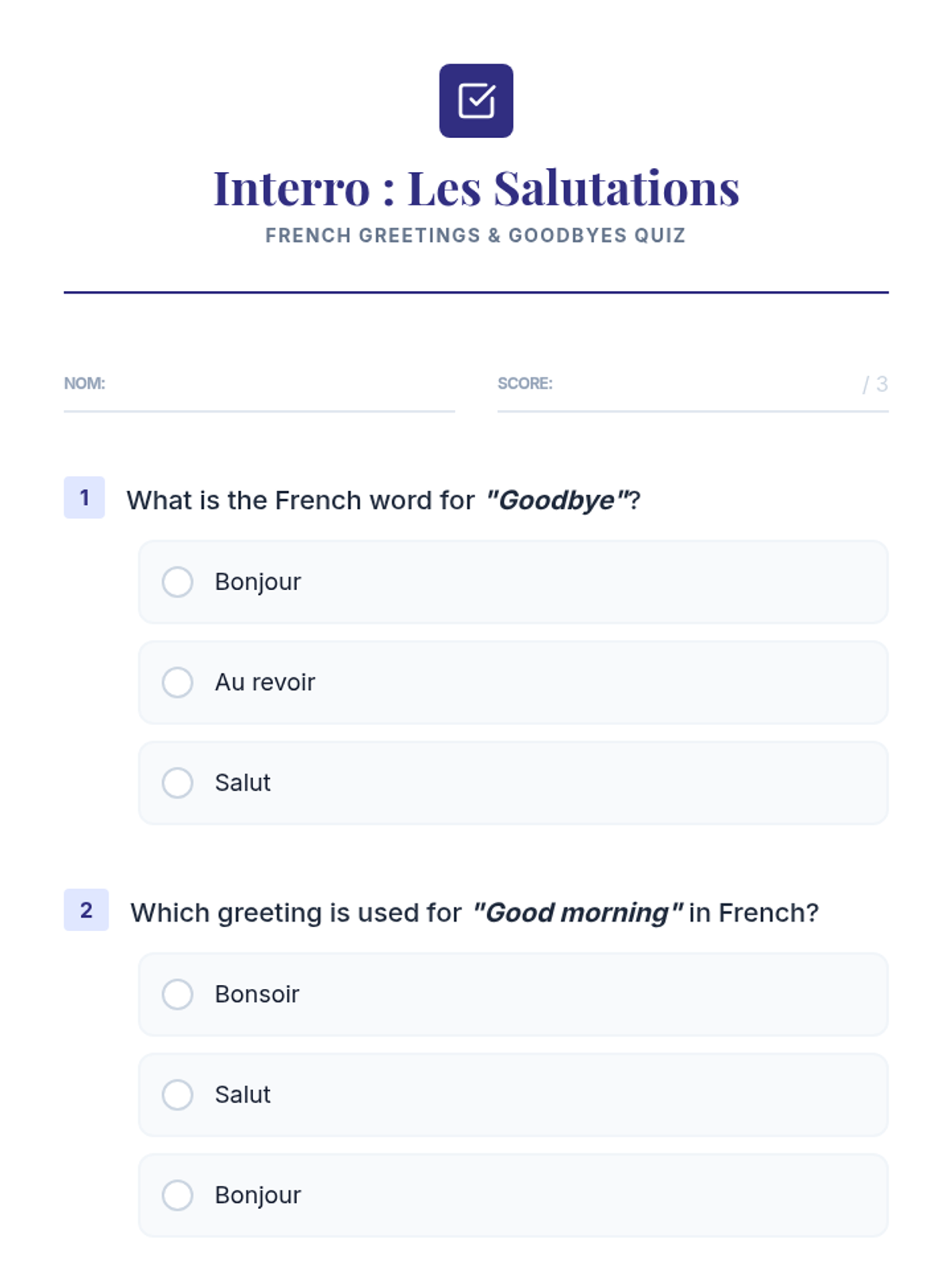 A beginner French lesson focused on essential greetings and goodbyes. Students will learn how to greet others and say farewell through interactive games, role-play, and structured practice.
