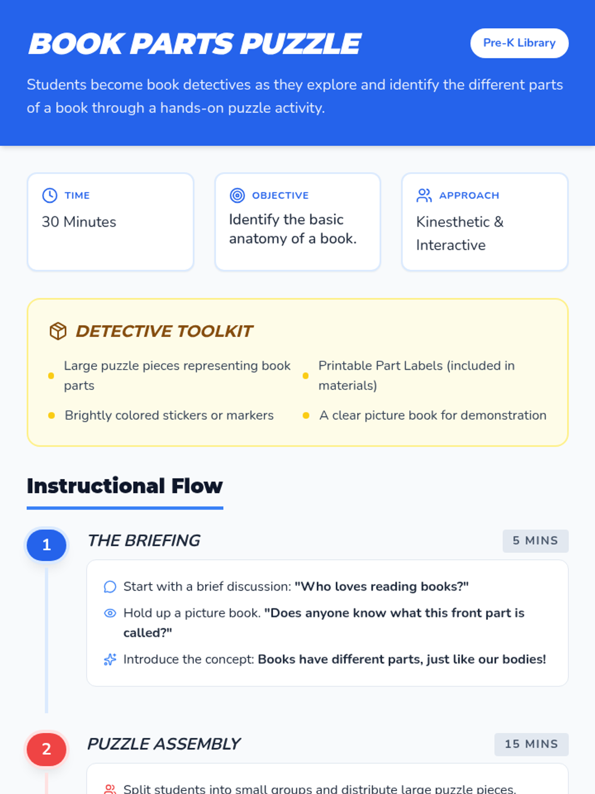Students become book detectives as they explore and identify the different parts of a book through a hands-on puzzle activity. This lesson is designed for Pre-K learners to build early literacy and library skills.