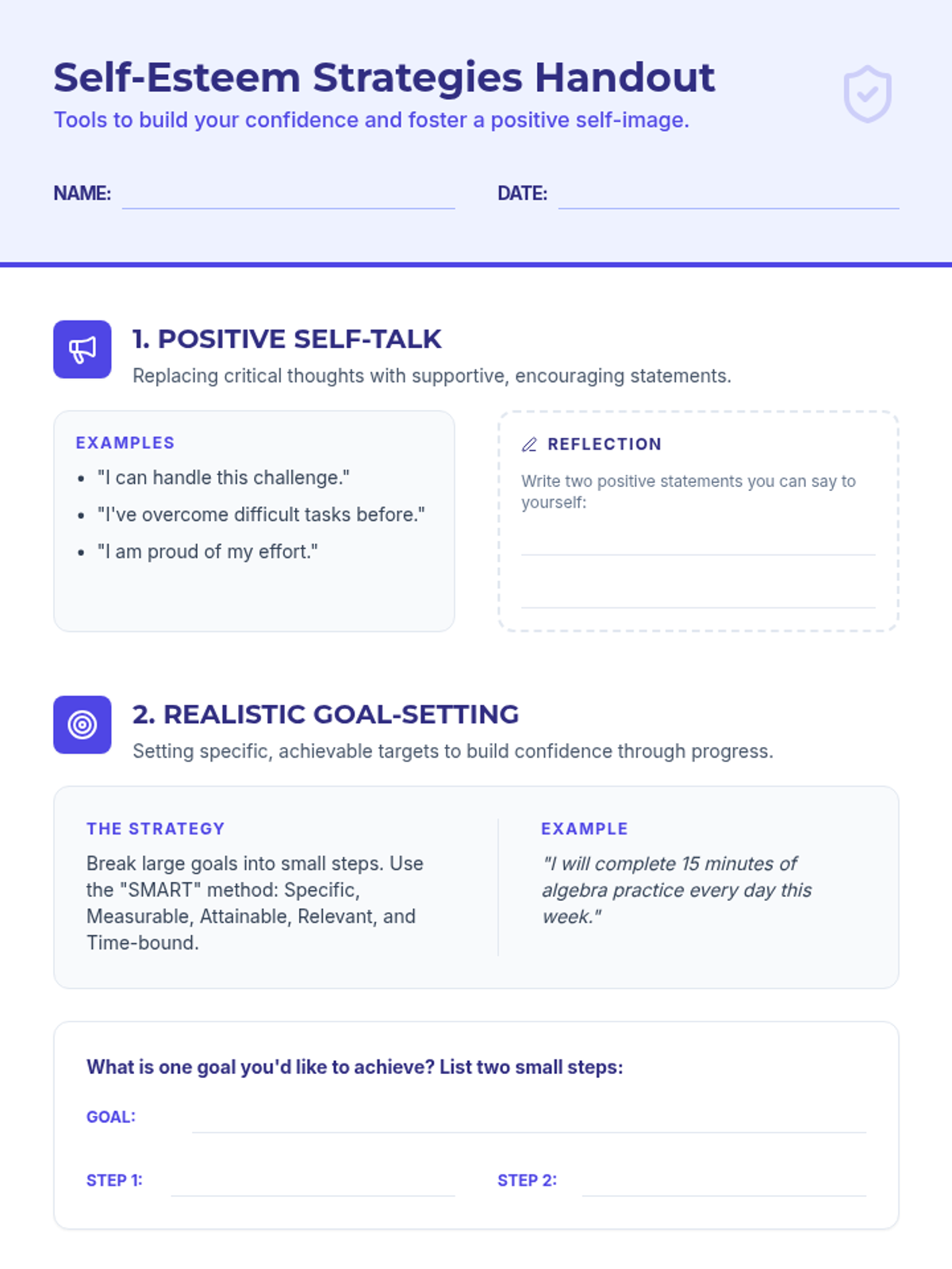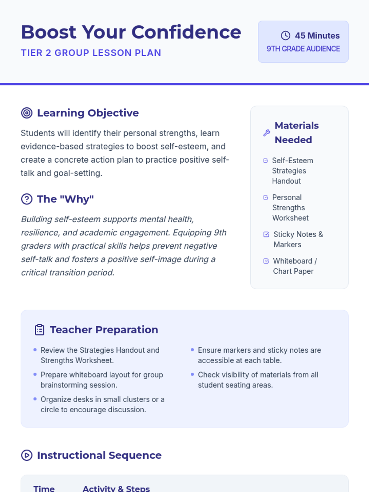 A 45-minute Tier 2 group session for 9th graders to identify personal strengths and develop actionable strategies for building self-esteem and positive self-talk.