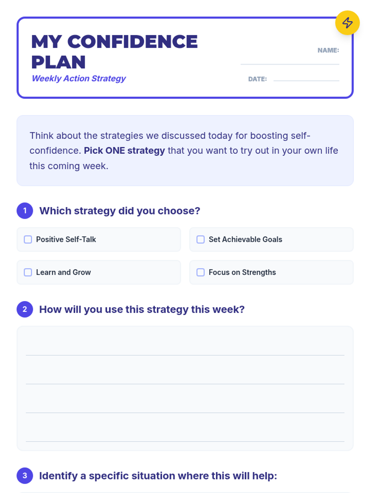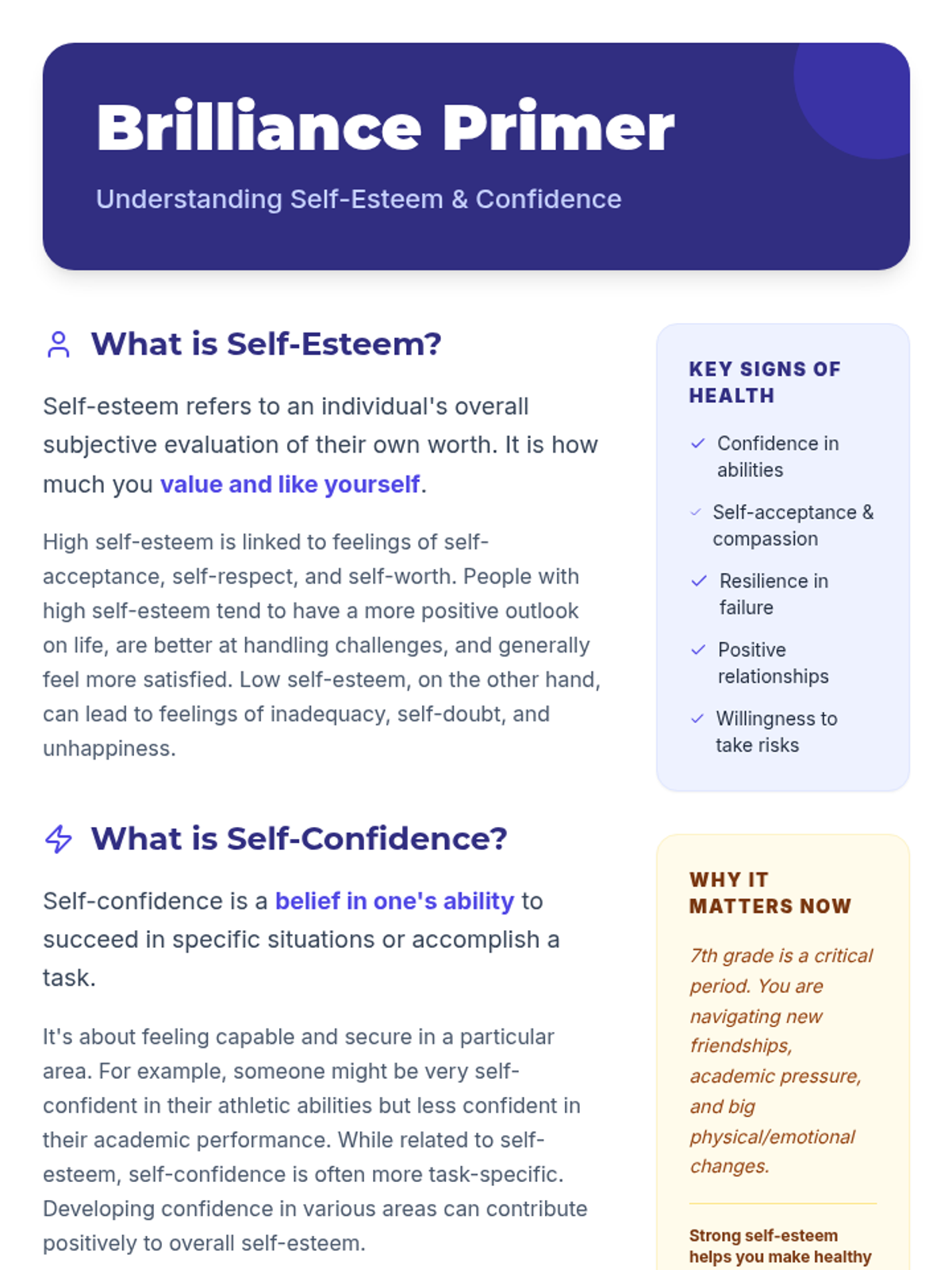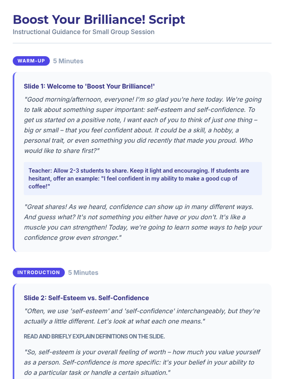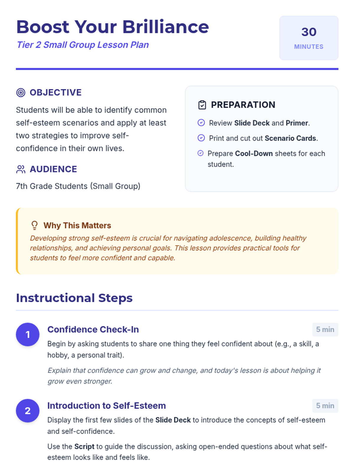 A 30-minute Tier 2 small group lesson for 7th graders focused on identifying self-esteem scenarios and applying practical confidence-boosting strategies.