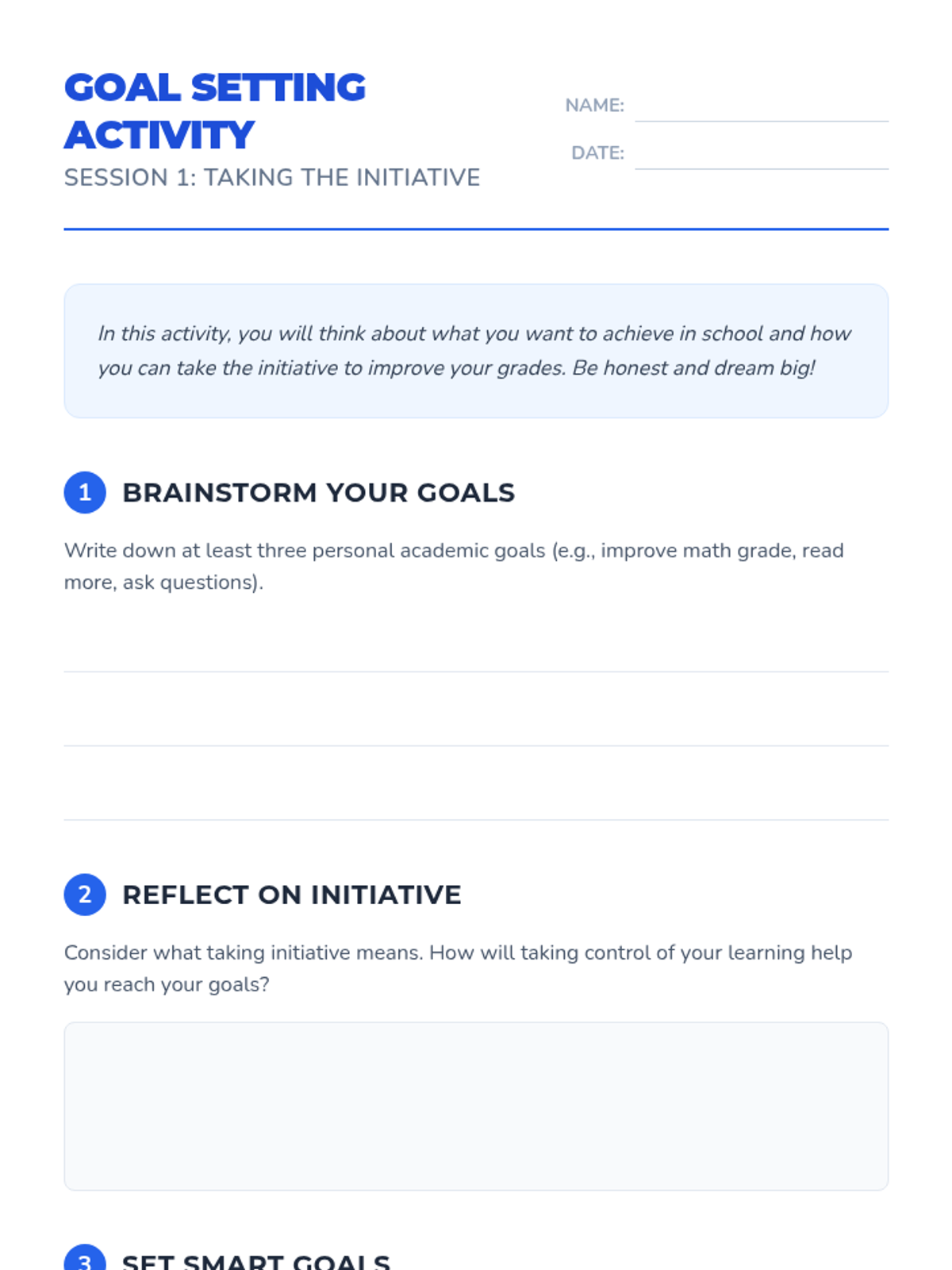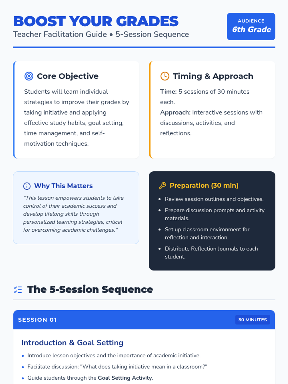 A 5-session unit for 6th graders focused on developing academic initiative through goal setting, study habits, time management, and self-motivation strategies.