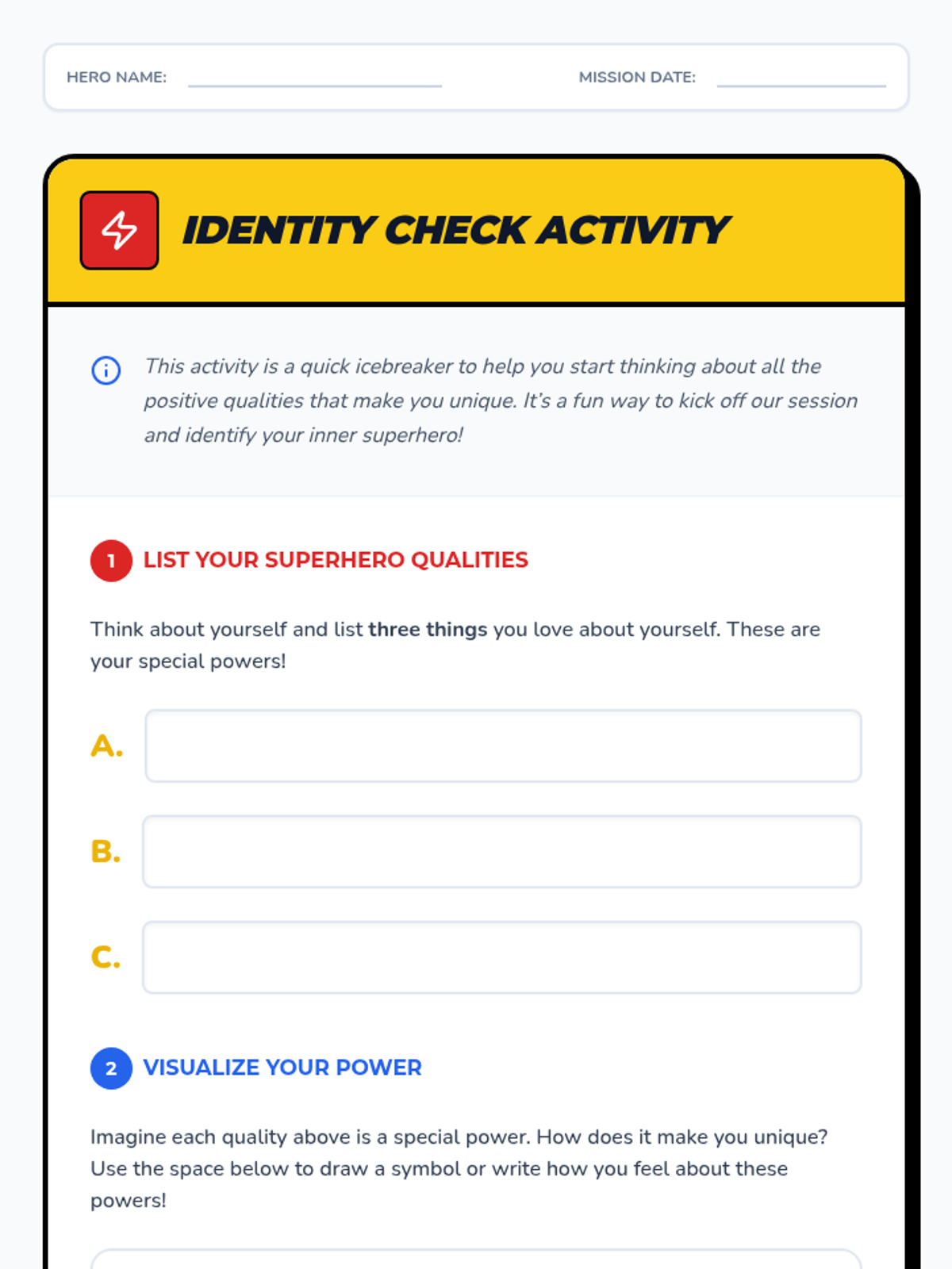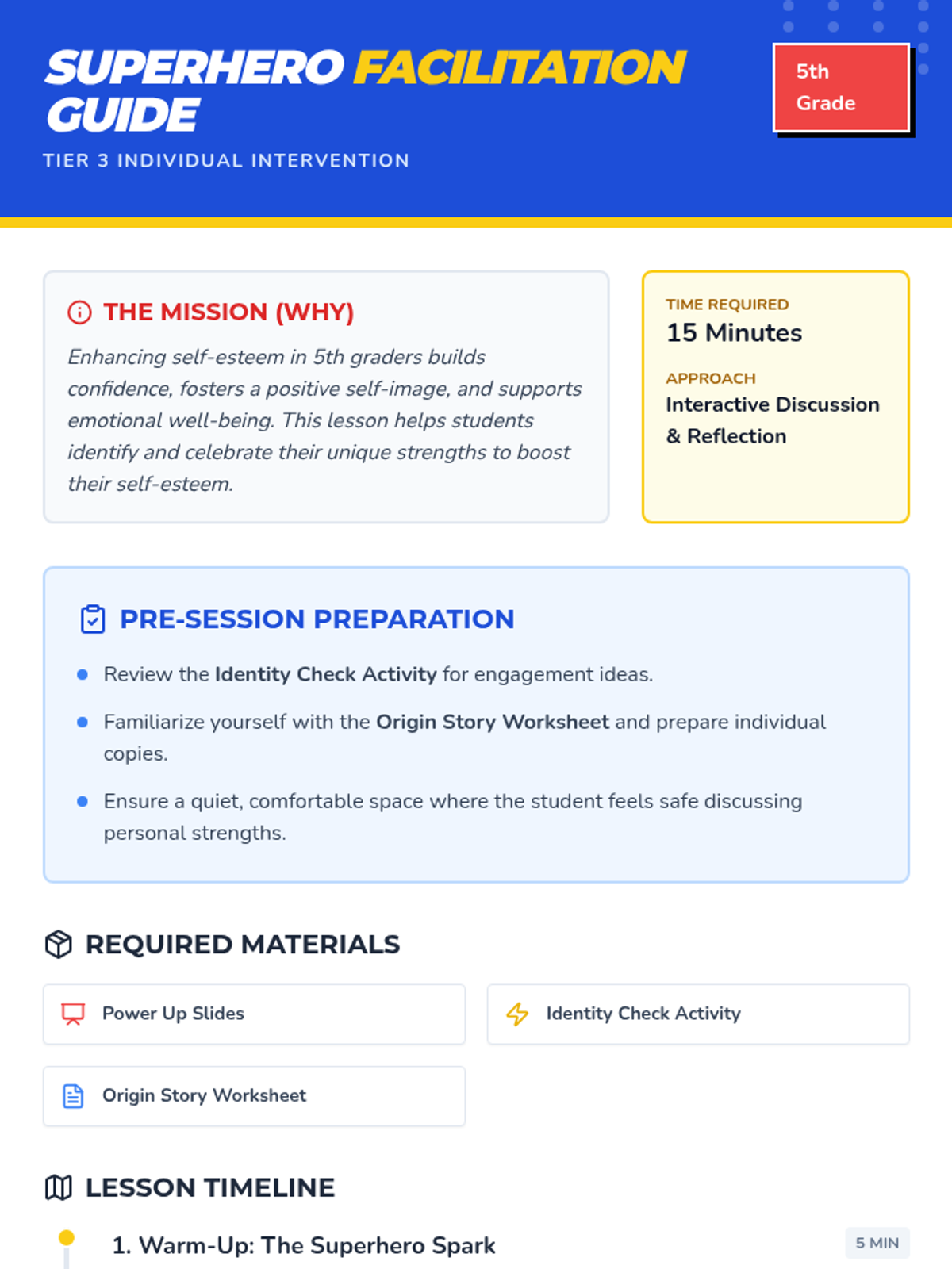 A Tier 3 intervention lesson designed for 5th-grade students to enhance self-esteem and recognize their unique strengths through a superhero-themed exploration.