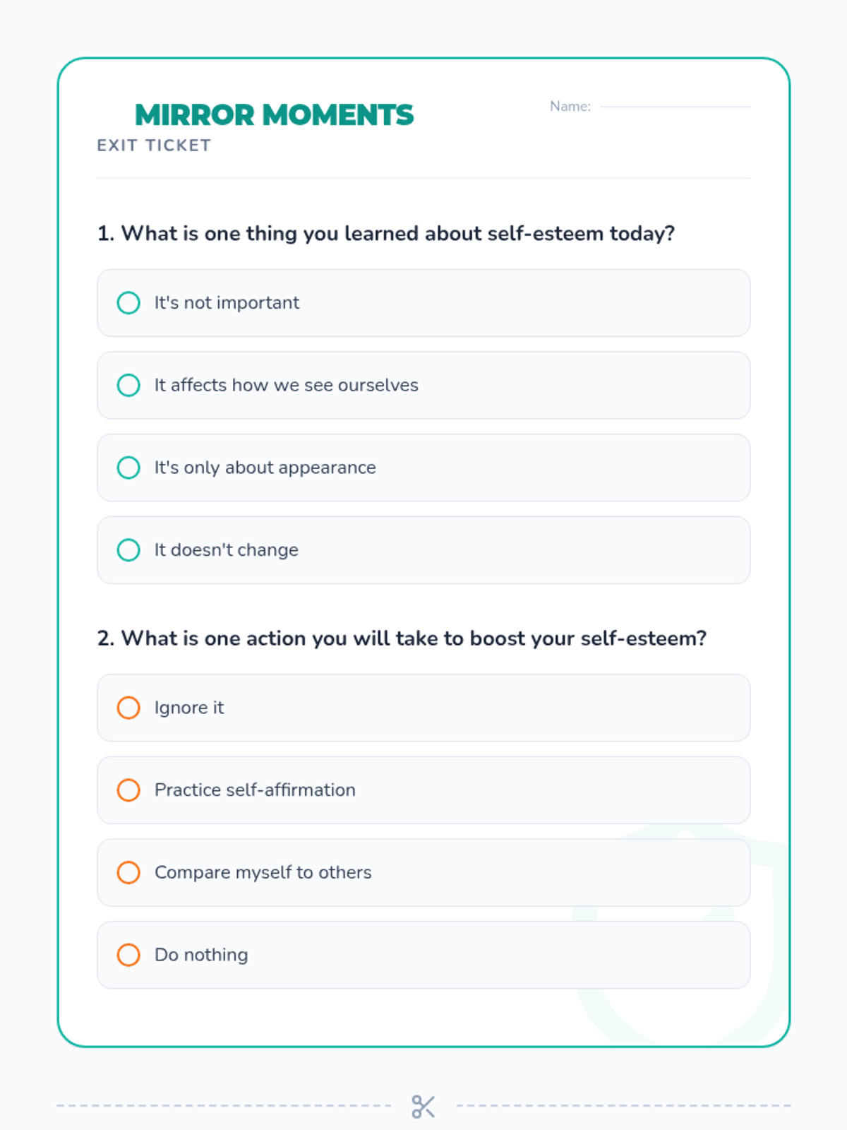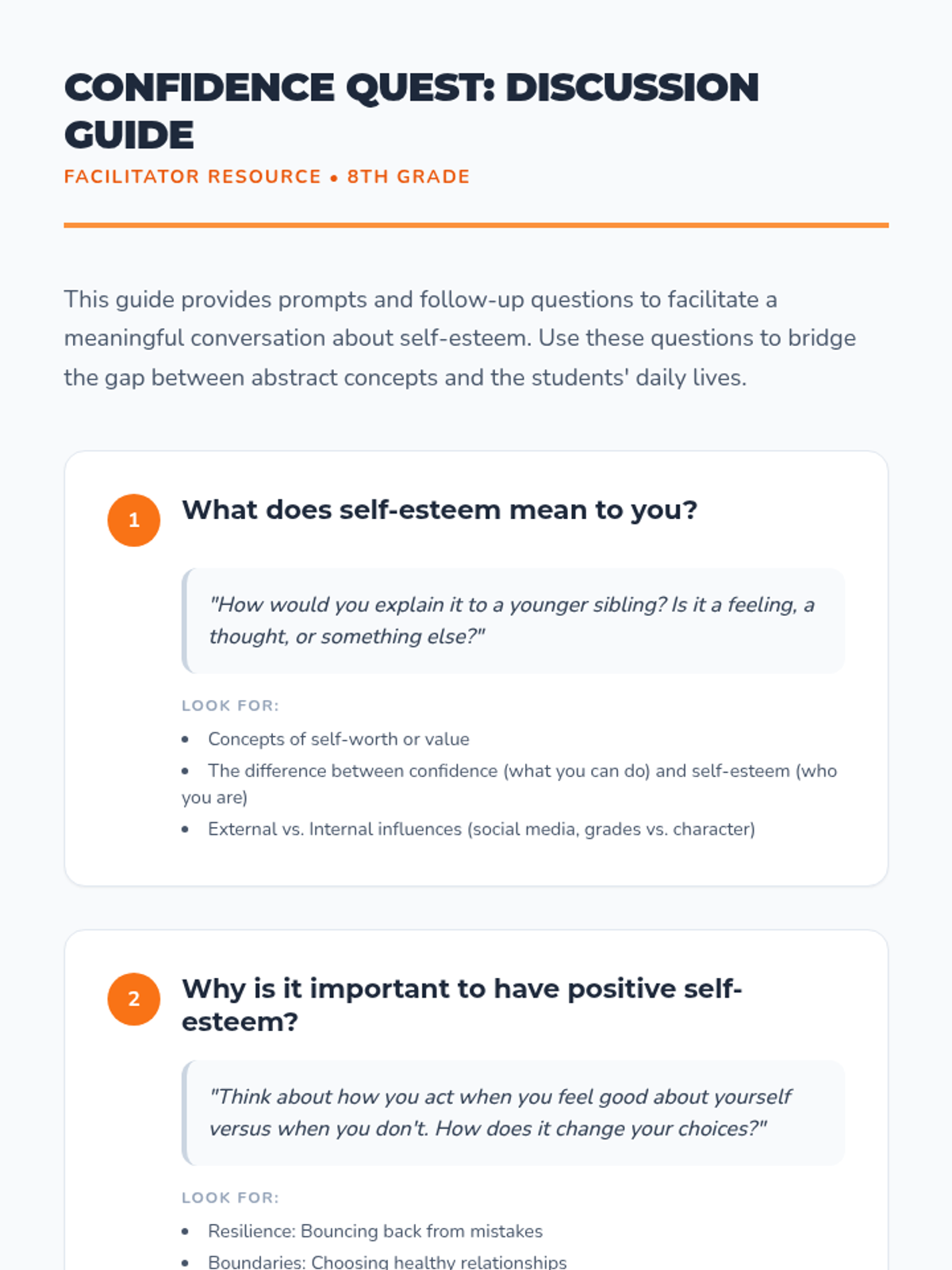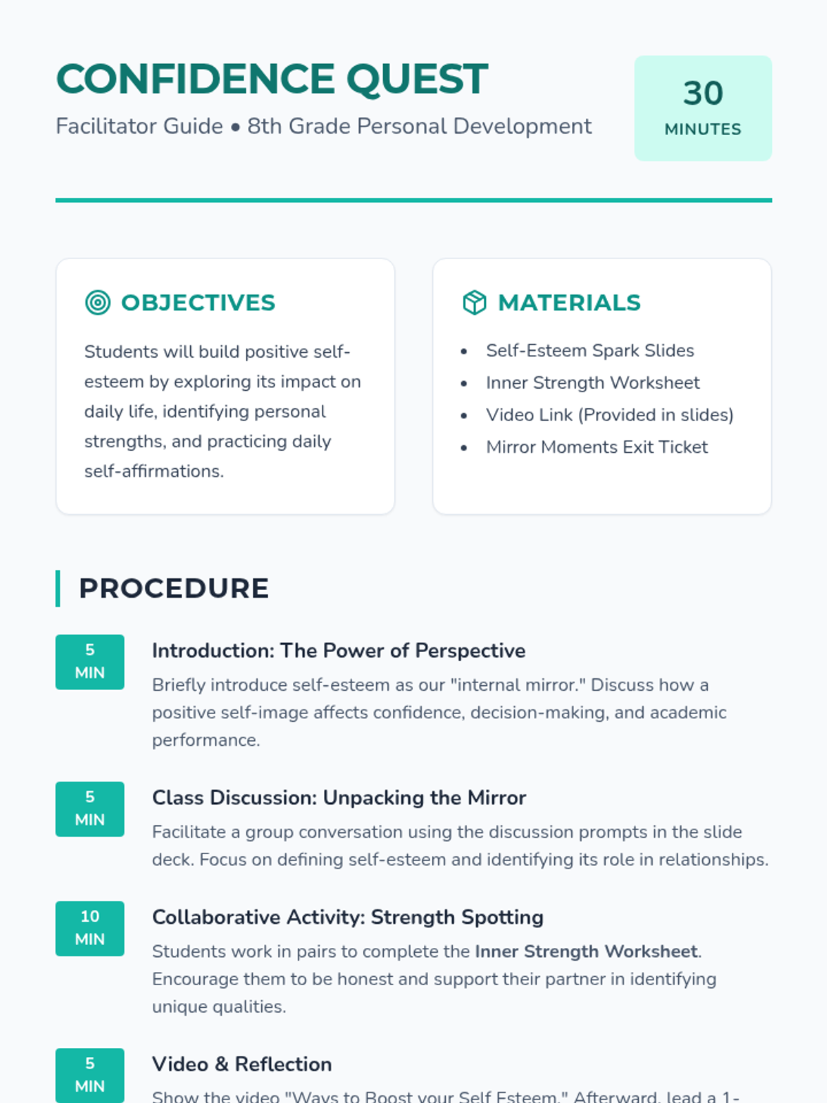 A 30-minute lesson for 8th graders to explore self-esteem, practice self-affirmation, and identify personal strengths through collaborative discussion and activities.