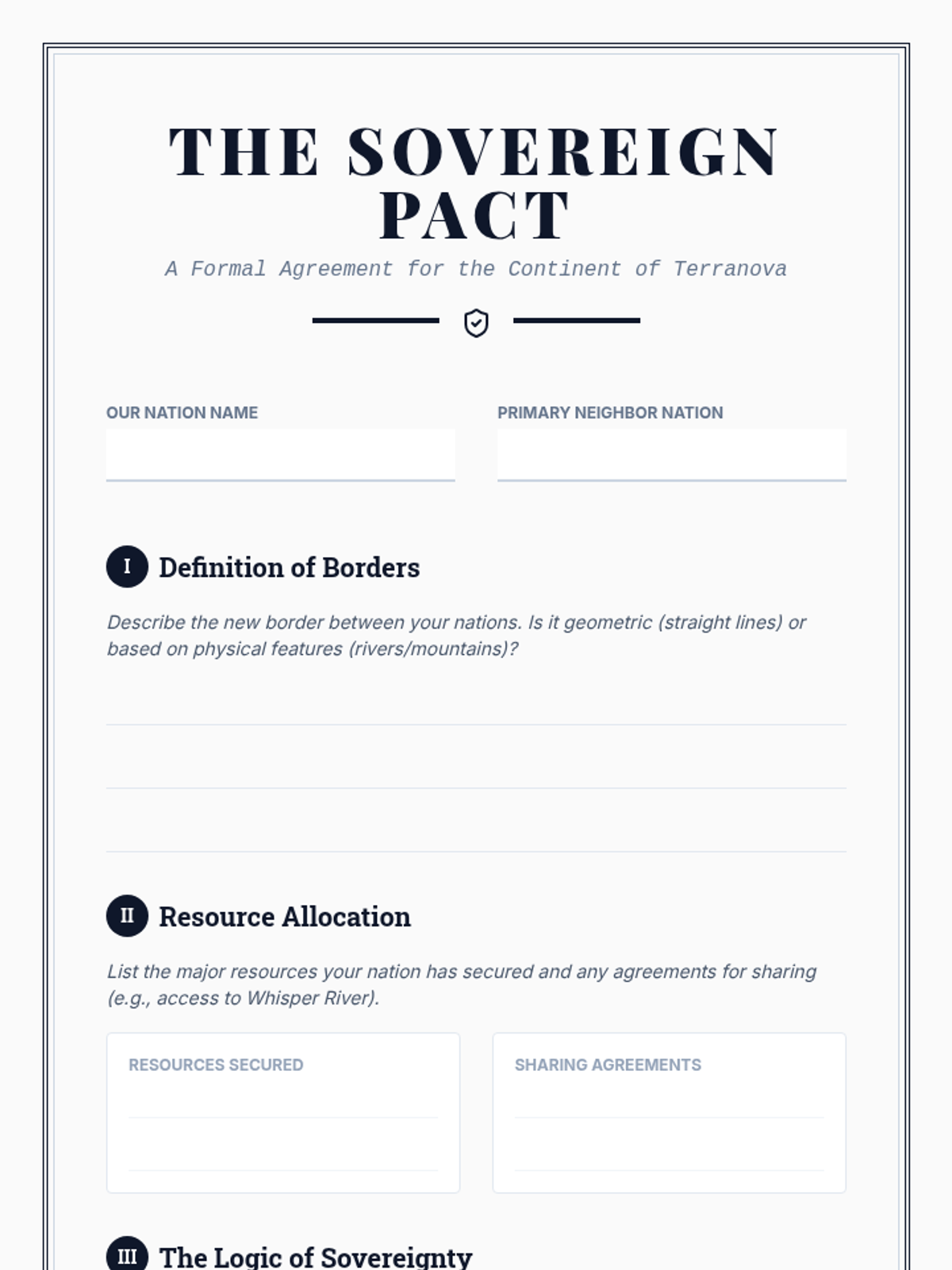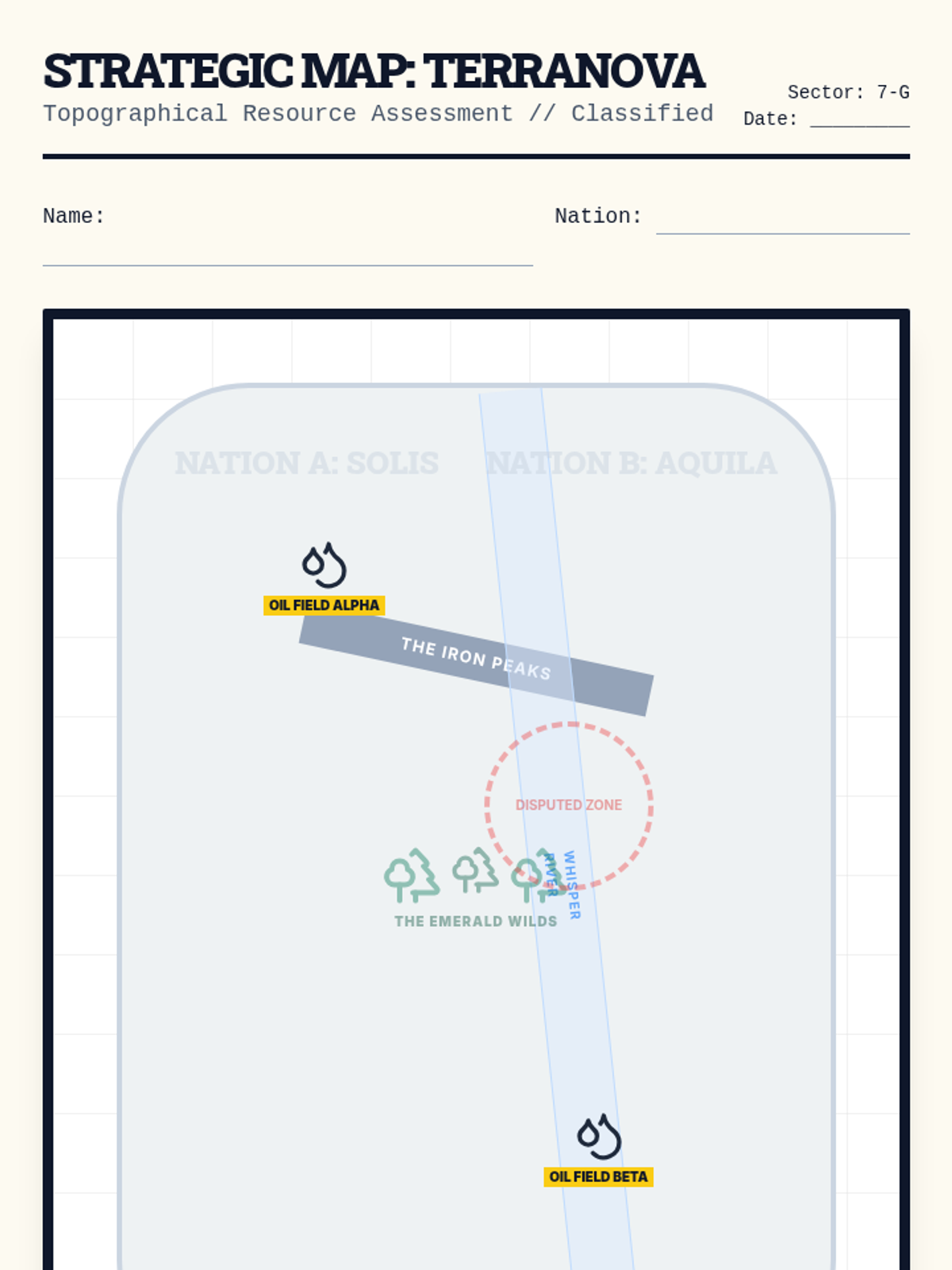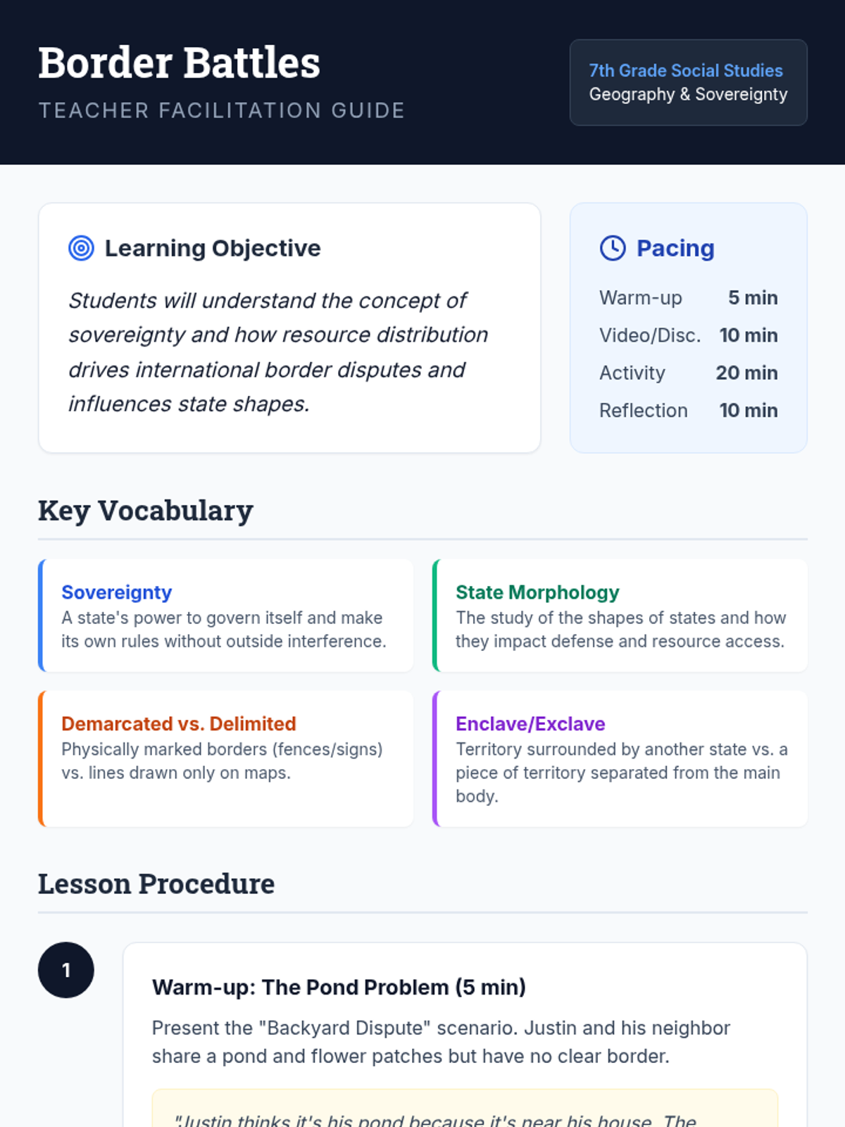 Students explore the concepts of sovereignty and state morphology through the lens of resource competition, using a backyard analogy to understand international border disputes. The lesson culminates in a mock negotiation where groups must draft treaties to secure vital resources for their fictional nations.