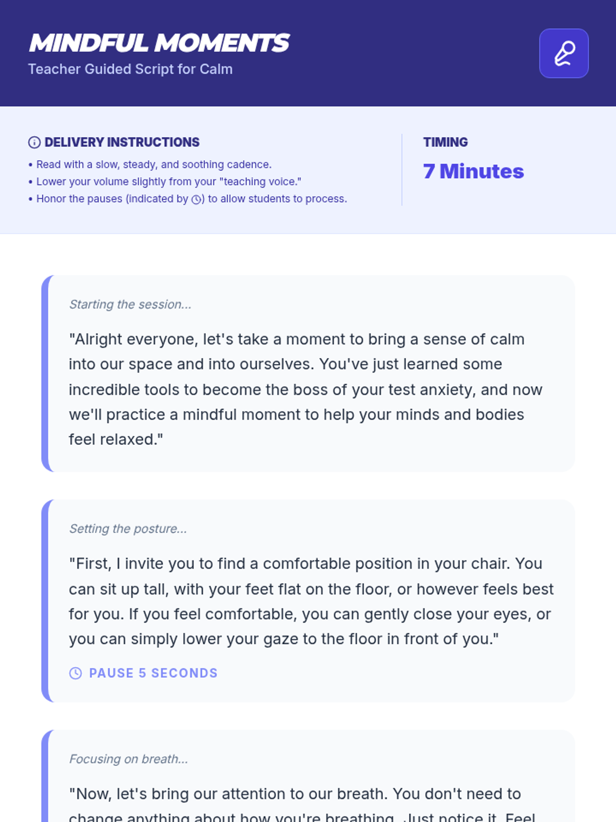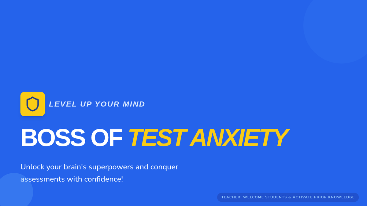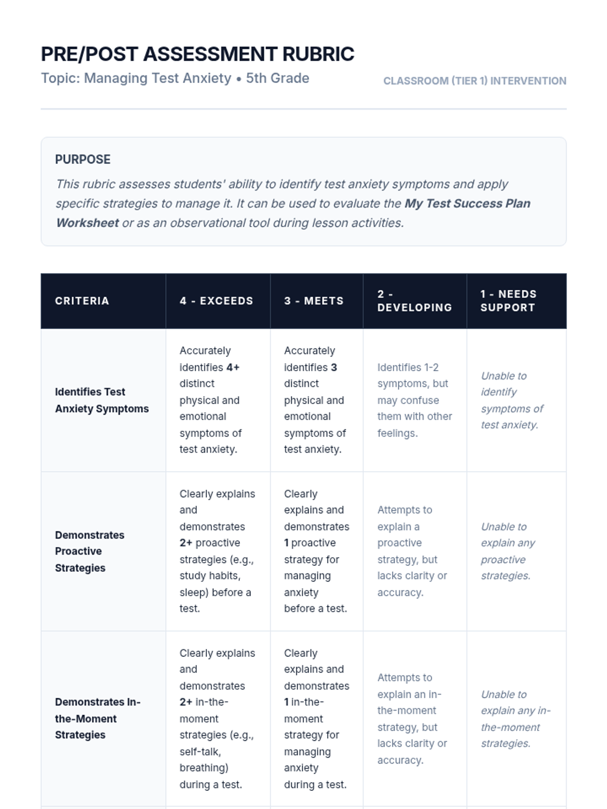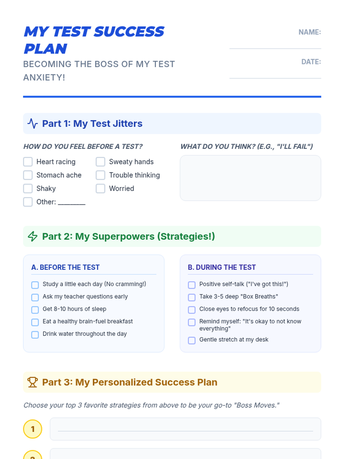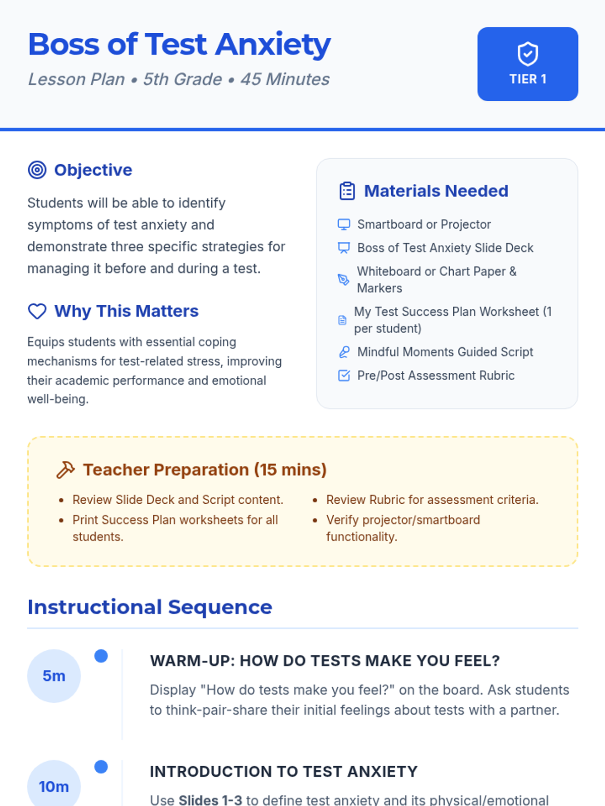 This lesson empowers 5th-grade students to understand, identify, and manage test anxiety through practical strategies and personalized success plans. Students will learn to recognize symptoms, apply proactive habits, and use in-the-moment relaxation techniques.