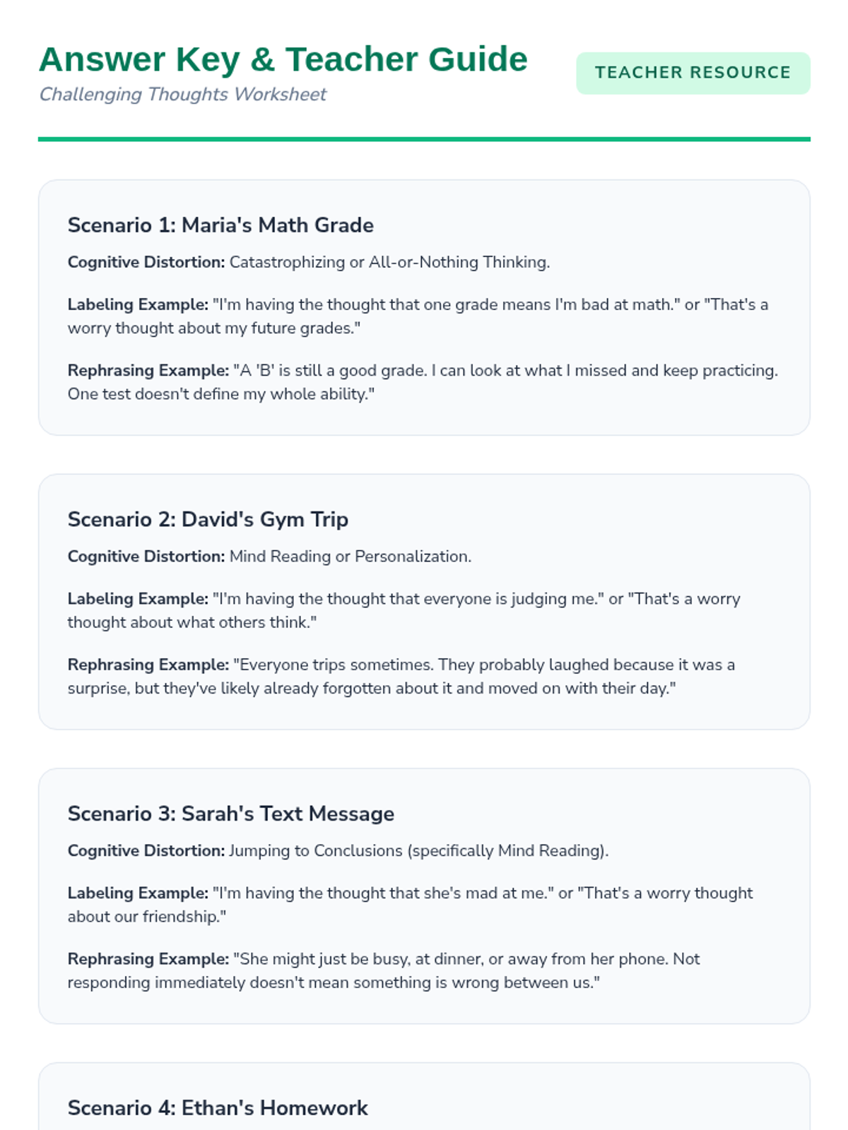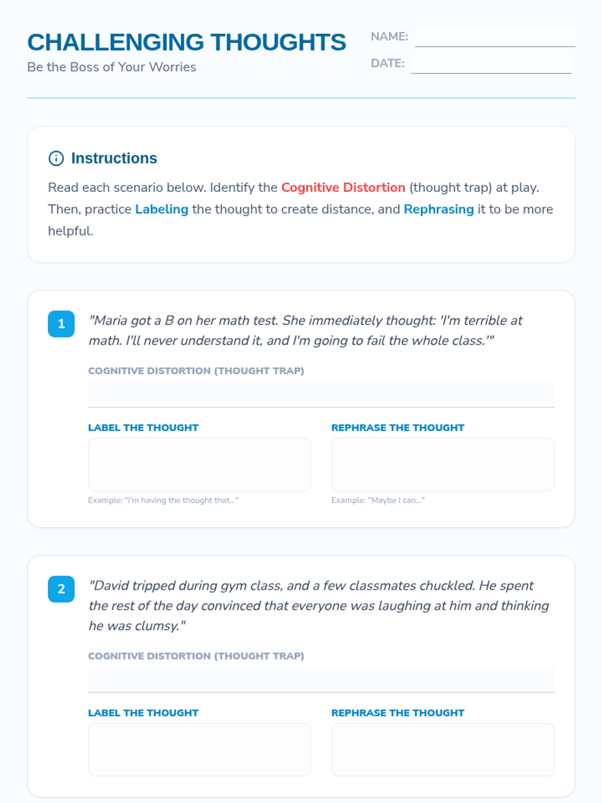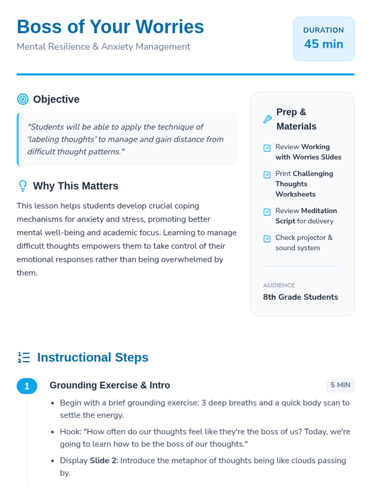 This 45-minute lesson empowers 8th-grade students to manage anxious thoughts using labeling techniques and cognitive restructuring. Students will identify common 'thought traps' and practice creating distance from their worries to build emotional resilience.