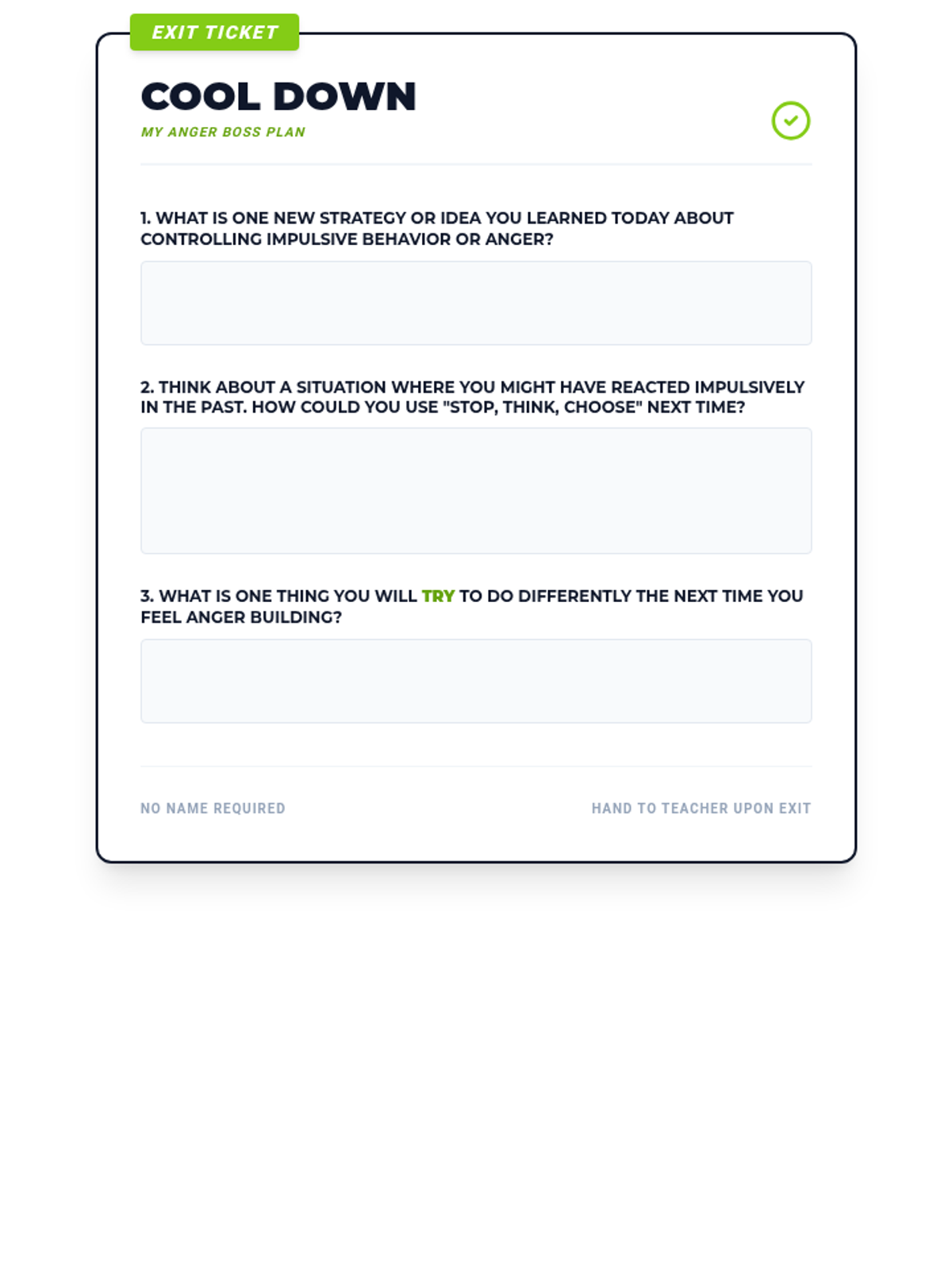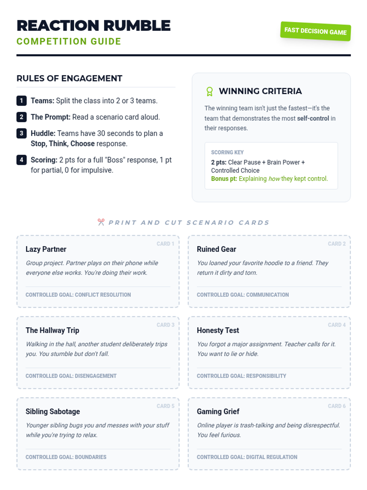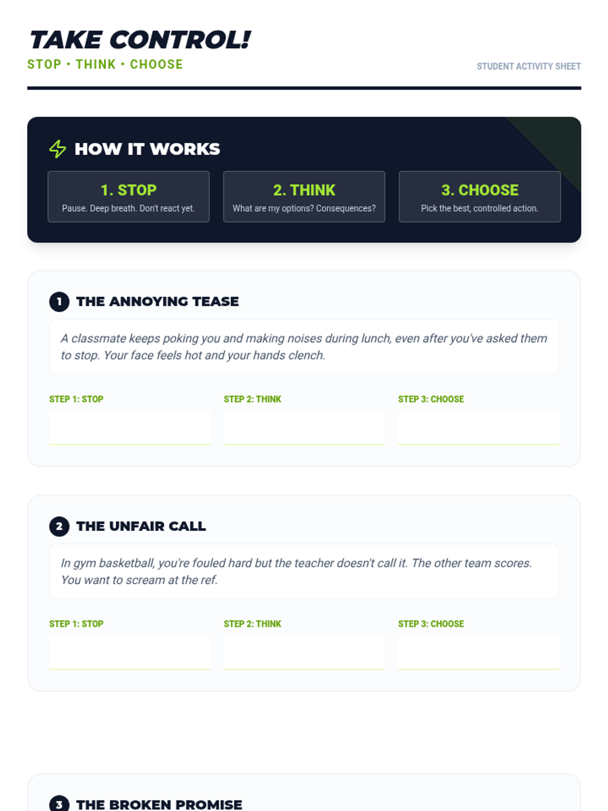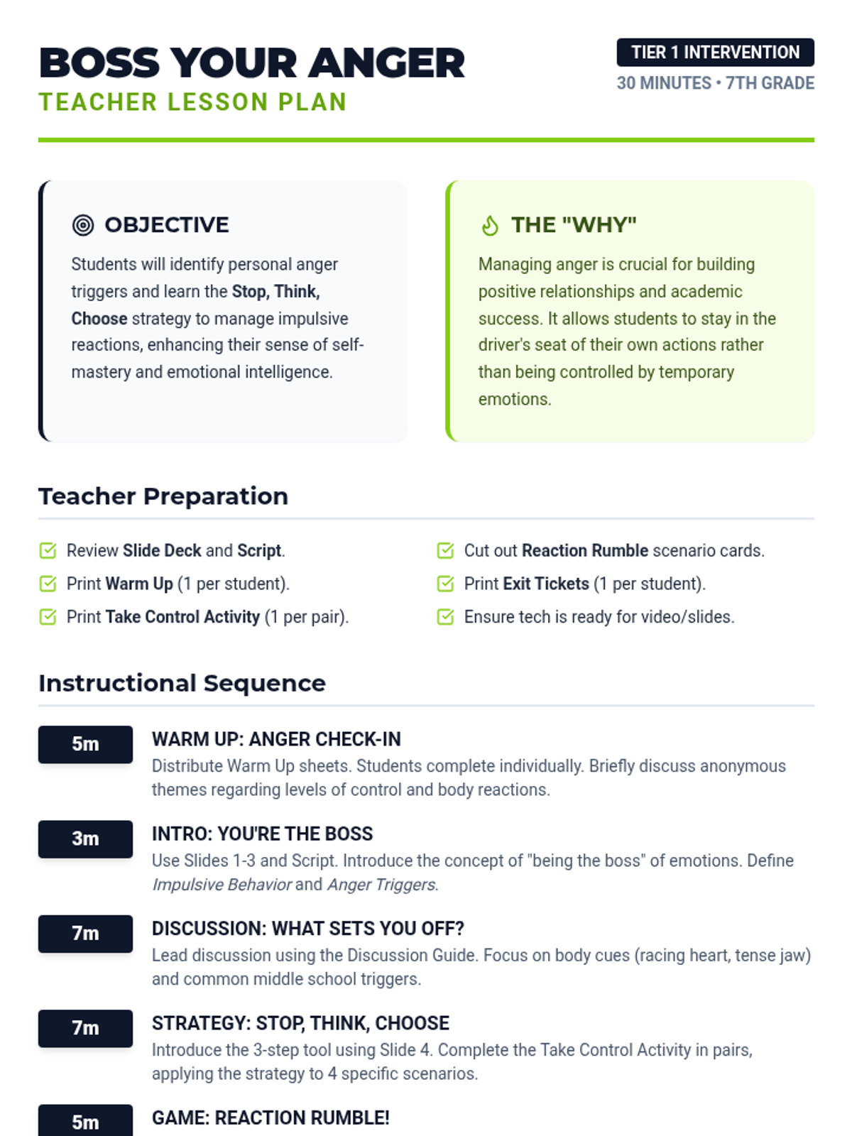 A 30-minute Tier 1 lesson for 7th-grade students to master self-regulation through the 'Stop, Think, Choose' strategy, specifically designed to support students with ADHD and ODD traits.