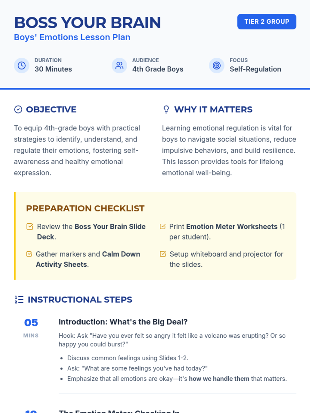 A 30-minute Tier 2 counseling group lesson designed to help 4th-grade boys identify, measure, and manage their emotions using the 'Boss Your Brain' framework.