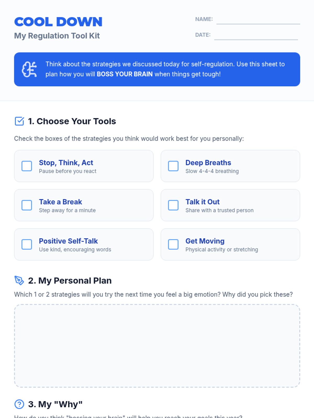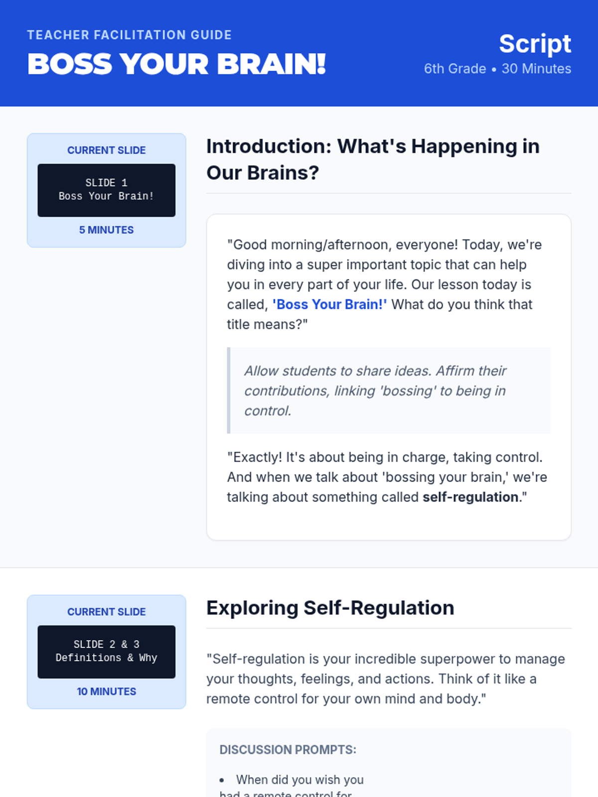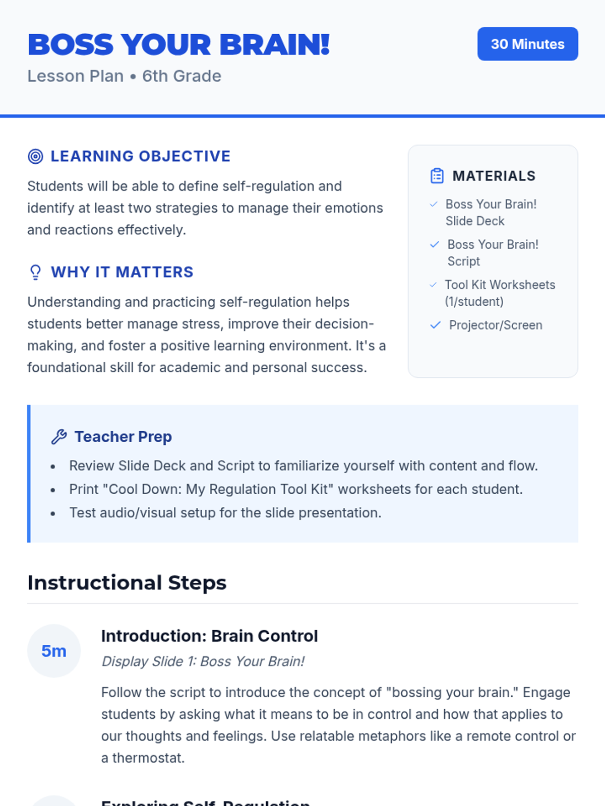 This lesson introduces 6th-grade students to self-regulation, providing them with practical strategies to manage their emotions and reactions. It's crucial for helping students navigate daily challenges, improve focus, and build healthier relationships. Designed for a single 30-minute session.