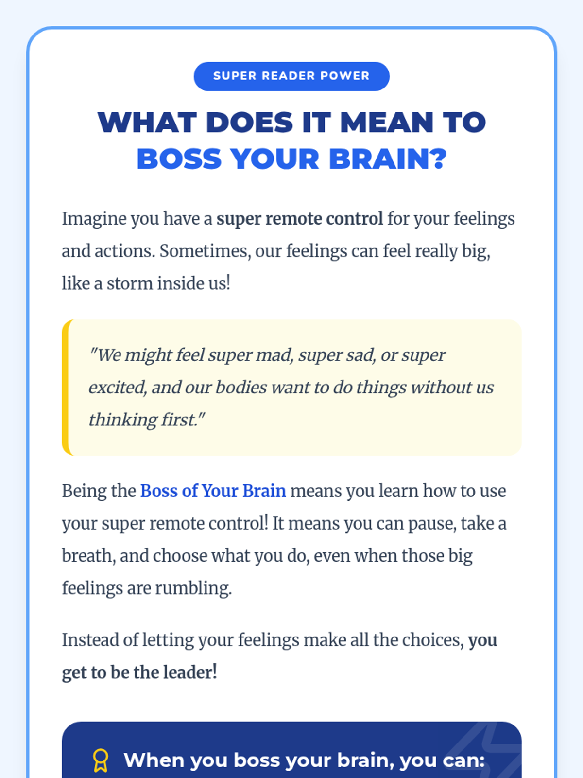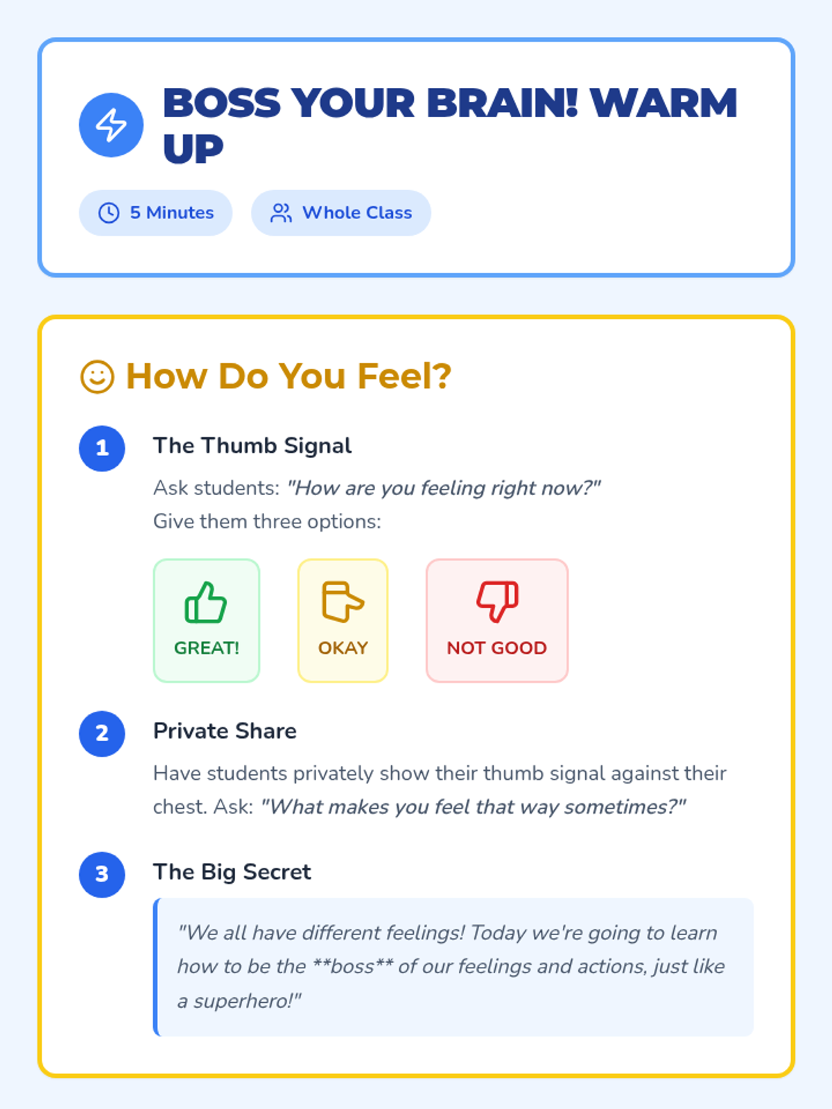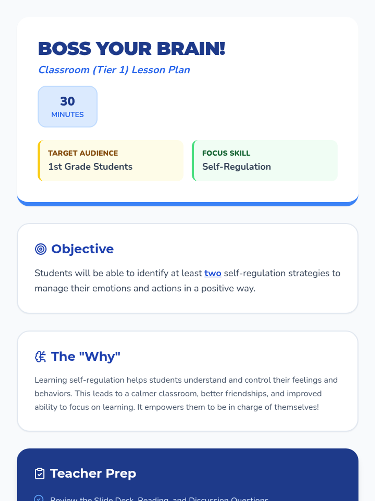 A 30-minute introductory lesson for first graders on self-regulation, using a 'superpower' theme to help them manage big feelings and stay in control of their actions.