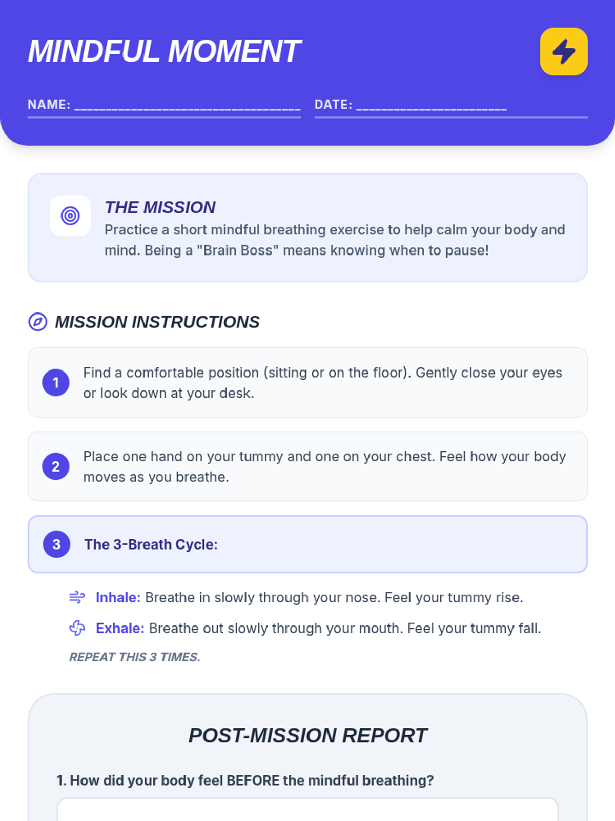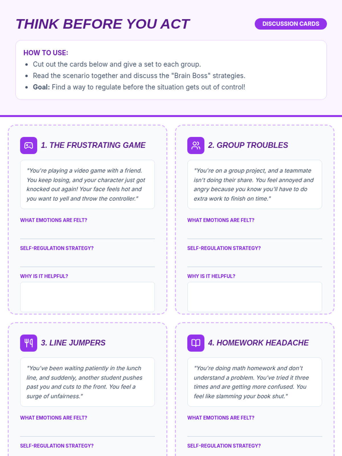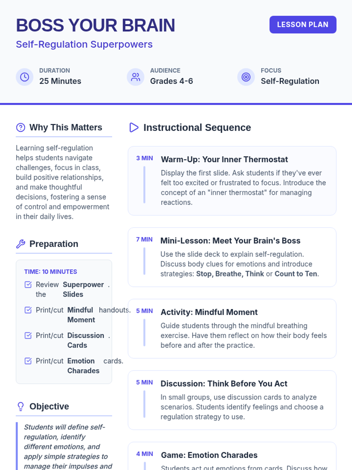 A 25-minute lesson for 4th-6th graders on self-regulation, using the 'Brain Boss' metaphor to teach students how to manage their emotions and reactions.