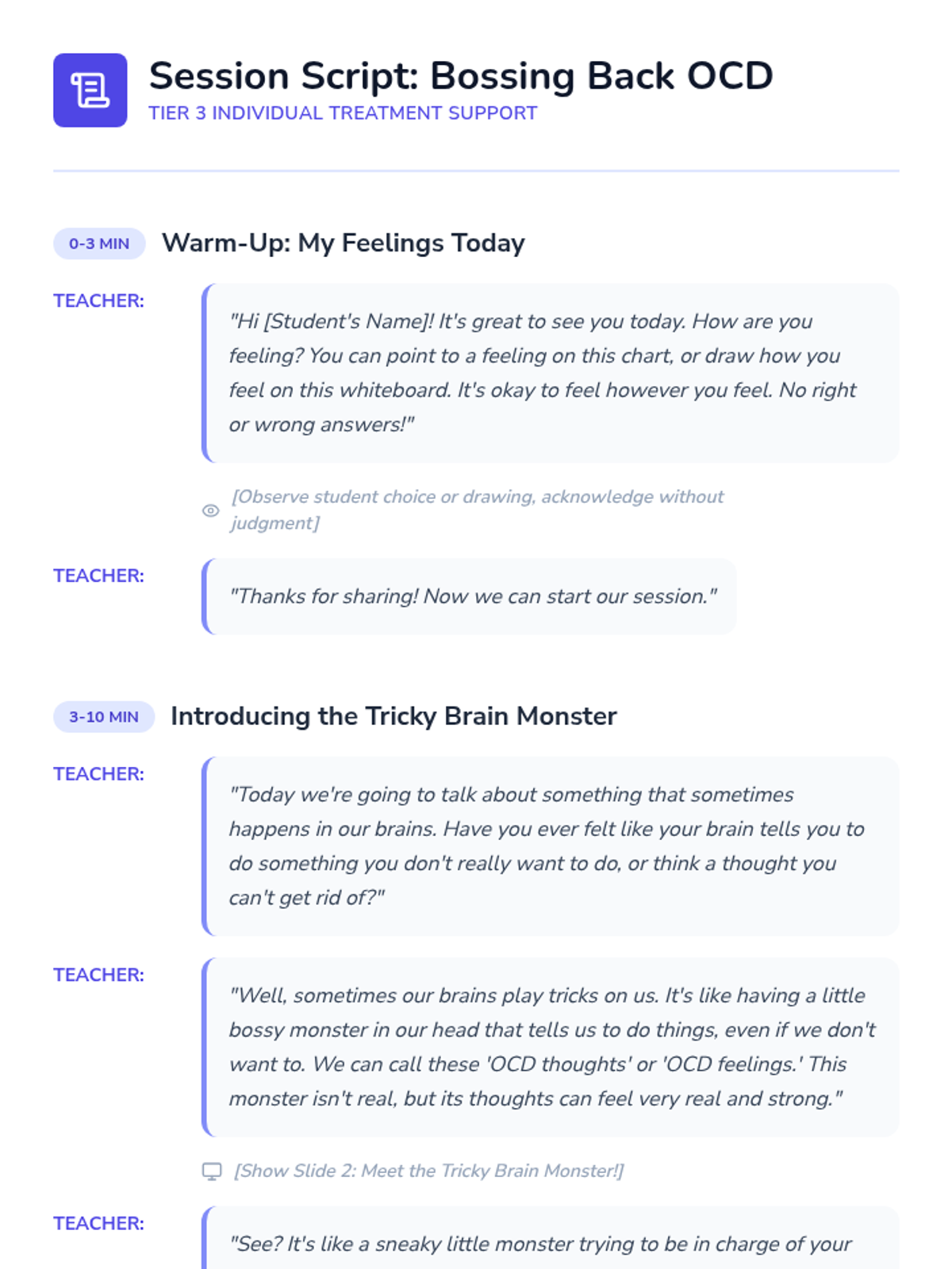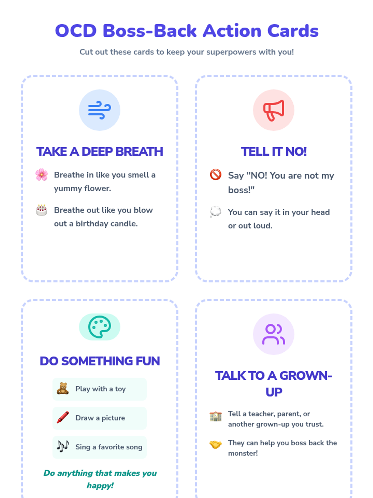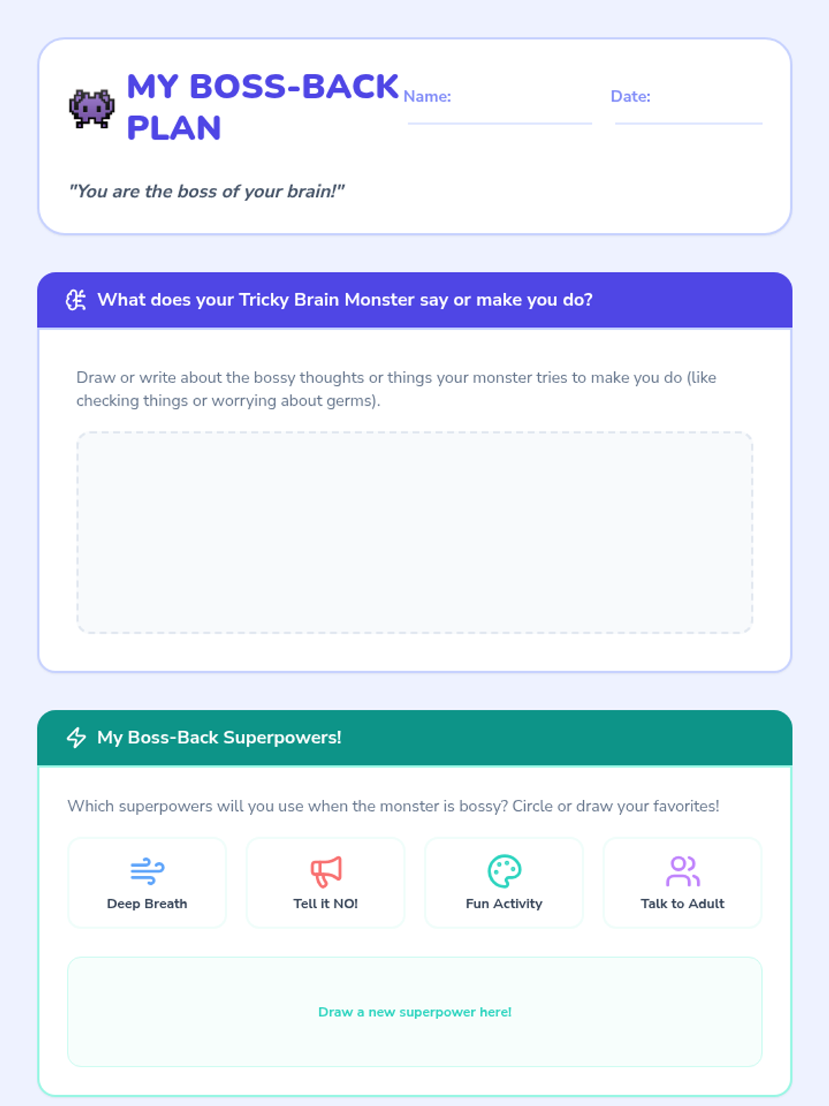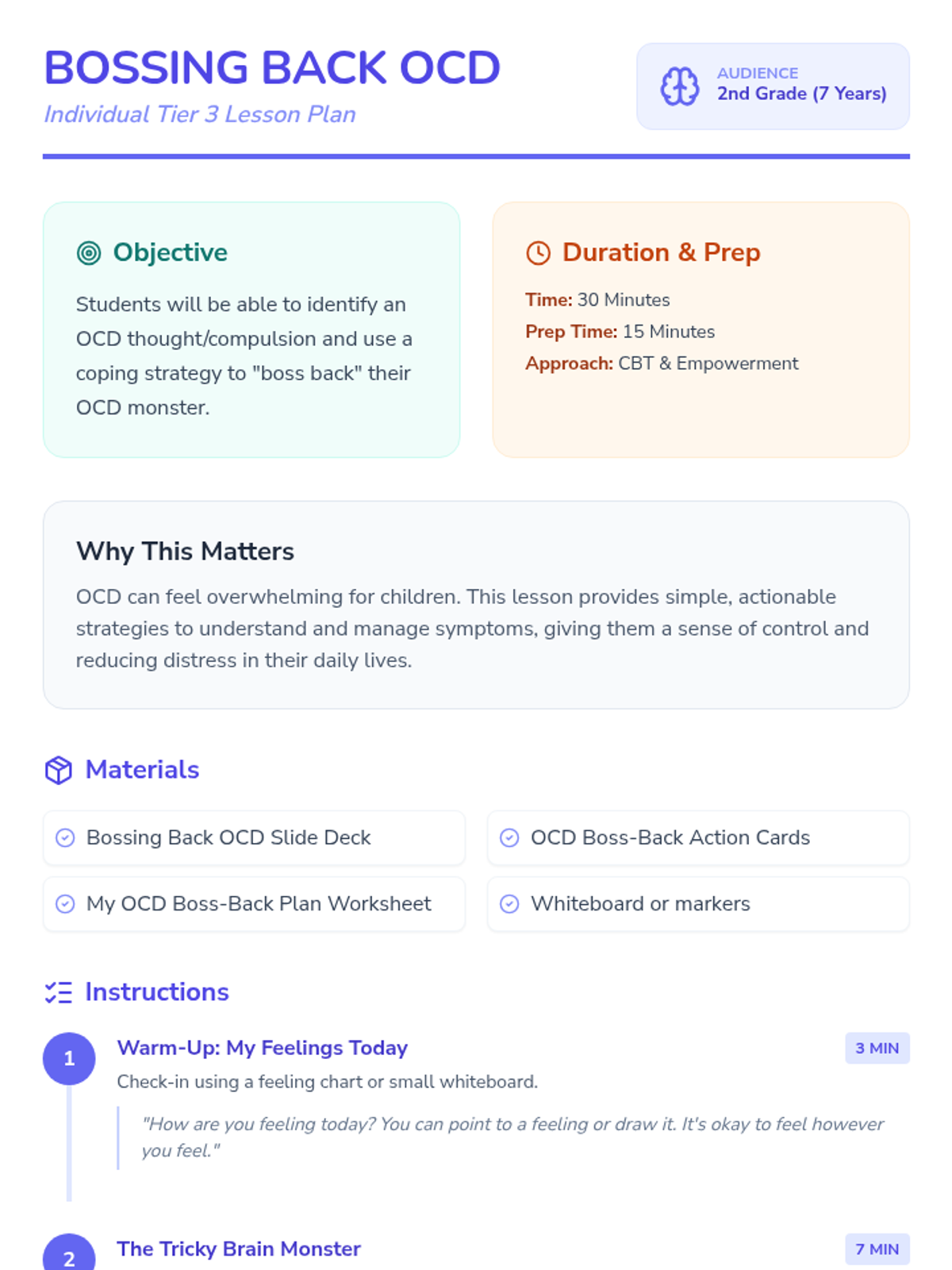A child-friendly CBT individual treatment plan to empower 2nd graders to manage OCD thoughts and compulsions using 'bossing back' strategies.