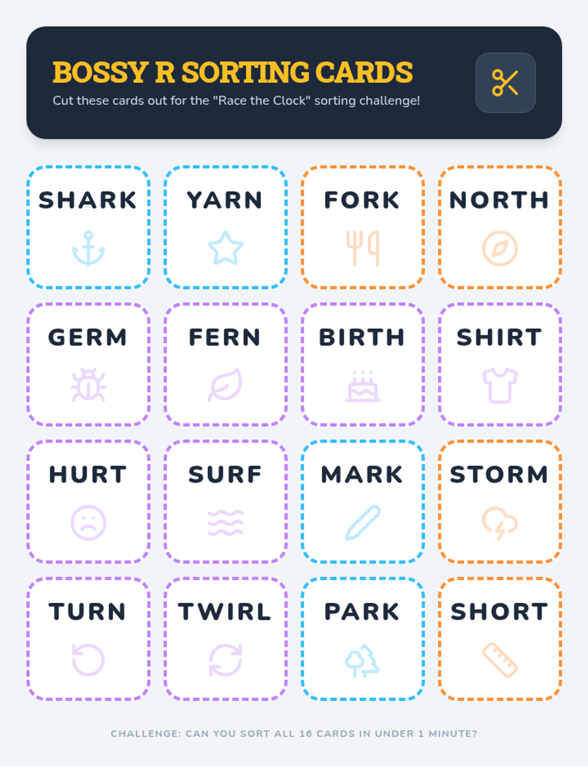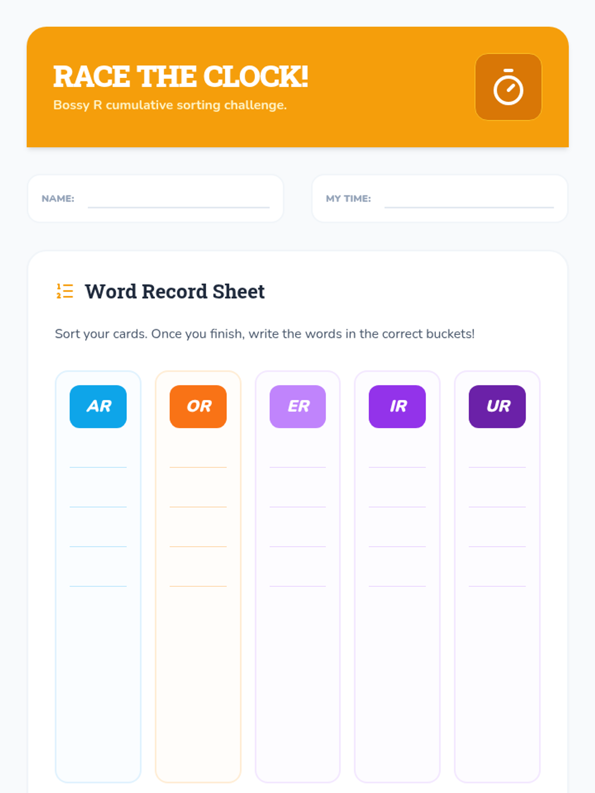 A cumulative sorting activity where students categorize all five R-controlled patterns to build rapid recognition.