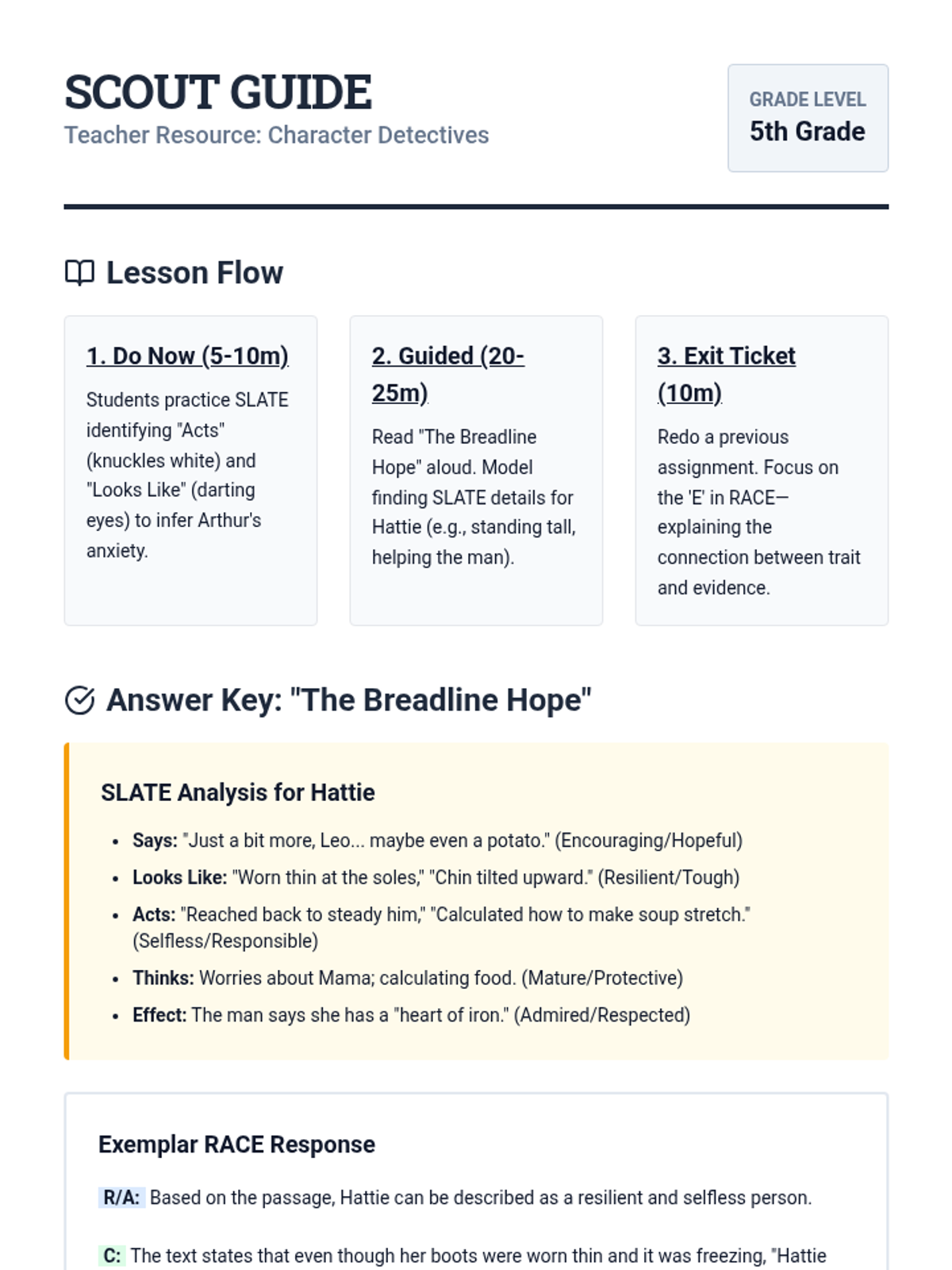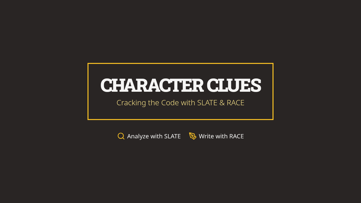 A lesson focused on characterization using the SLATE acronym for analysis and the RACE format for structured writing, centered around a 5th-grade historical fiction passage.