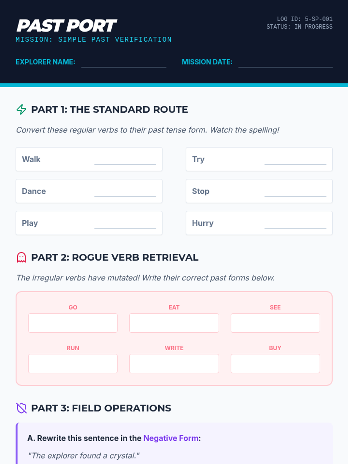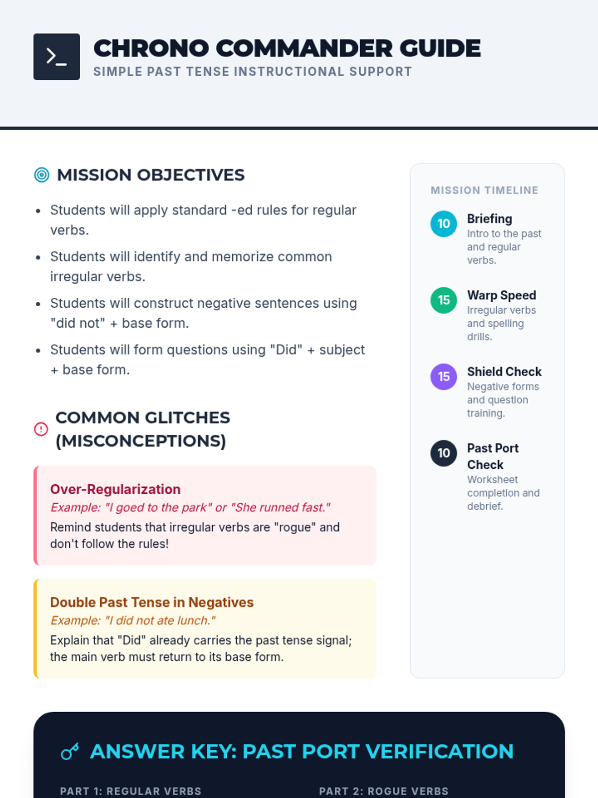 A 5th-grade lesson focused on mastering the simple past tense, including regular and irregular verbs, negative forms, and questions, all wrapped in a 'Time Trek' space-exploration theme.