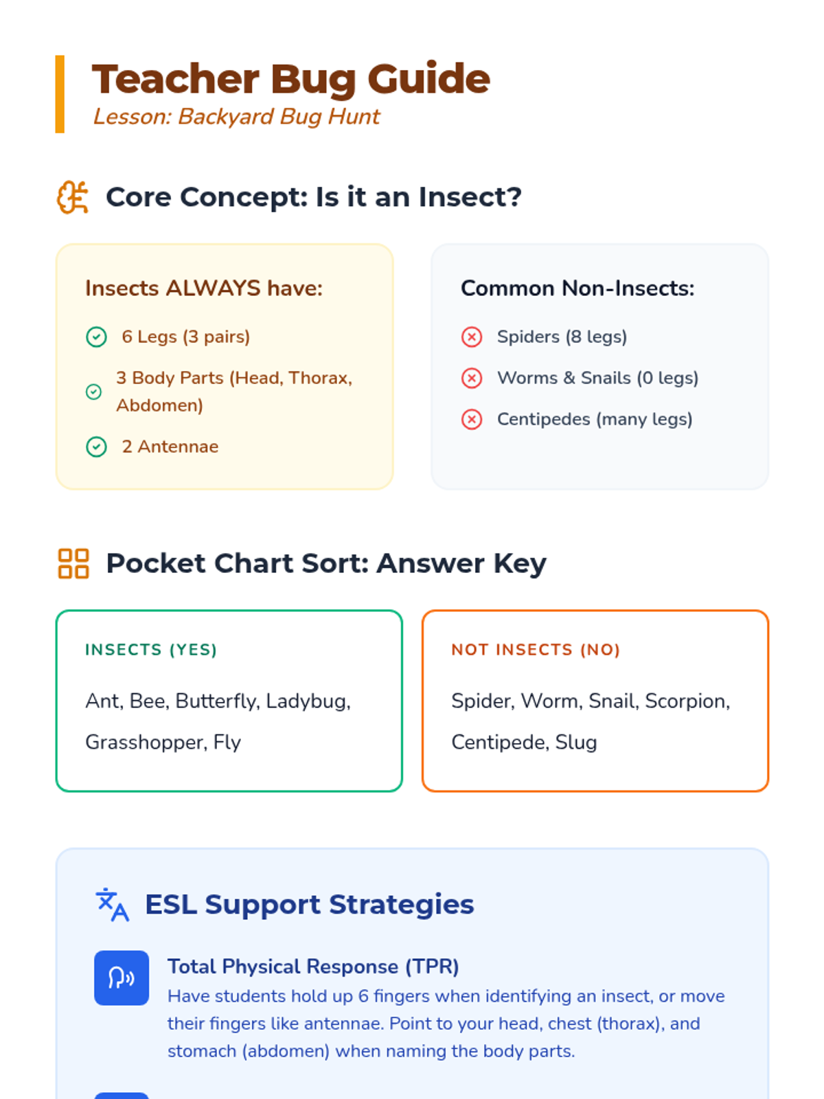 A hands-on introductory lesson for 2nd grade ESL students to distinguish between insects and other backyard creatures using physical sorting and visual identification.