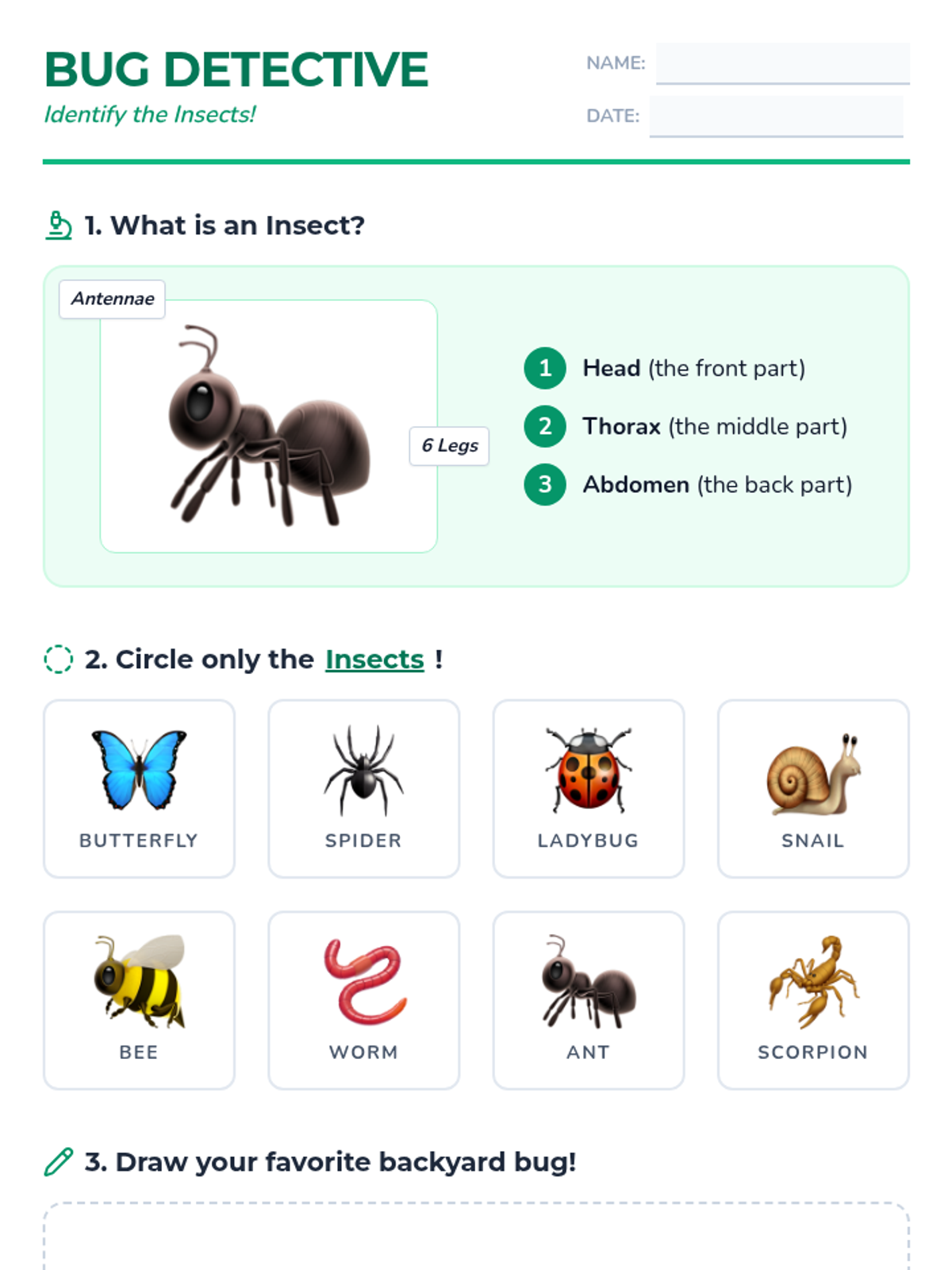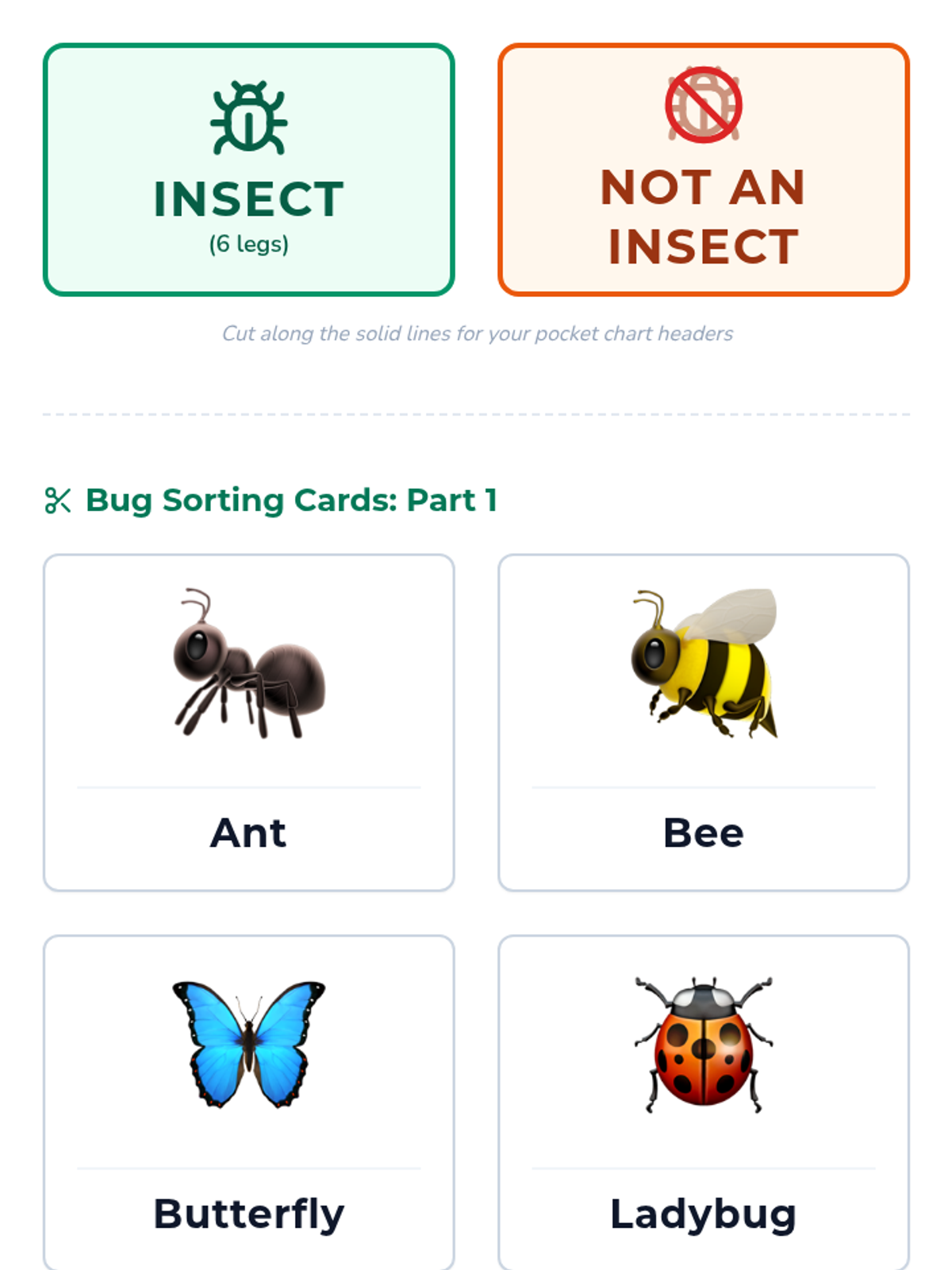 A hands-on introductory lesson for 2nd graders to identify insects by their physical characteristics (6 legs, 3 body parts) and sort them from other creepy-crawlies.