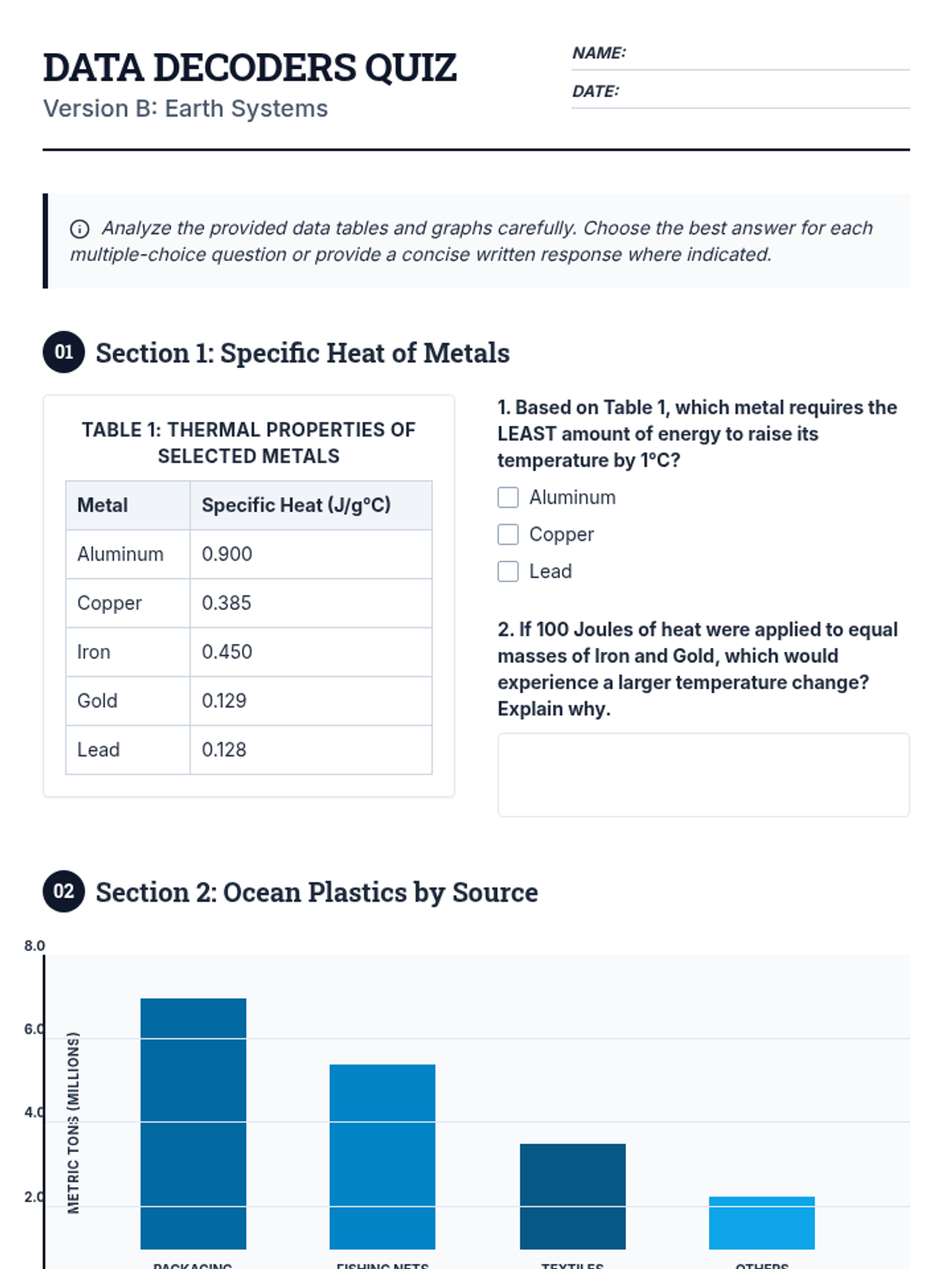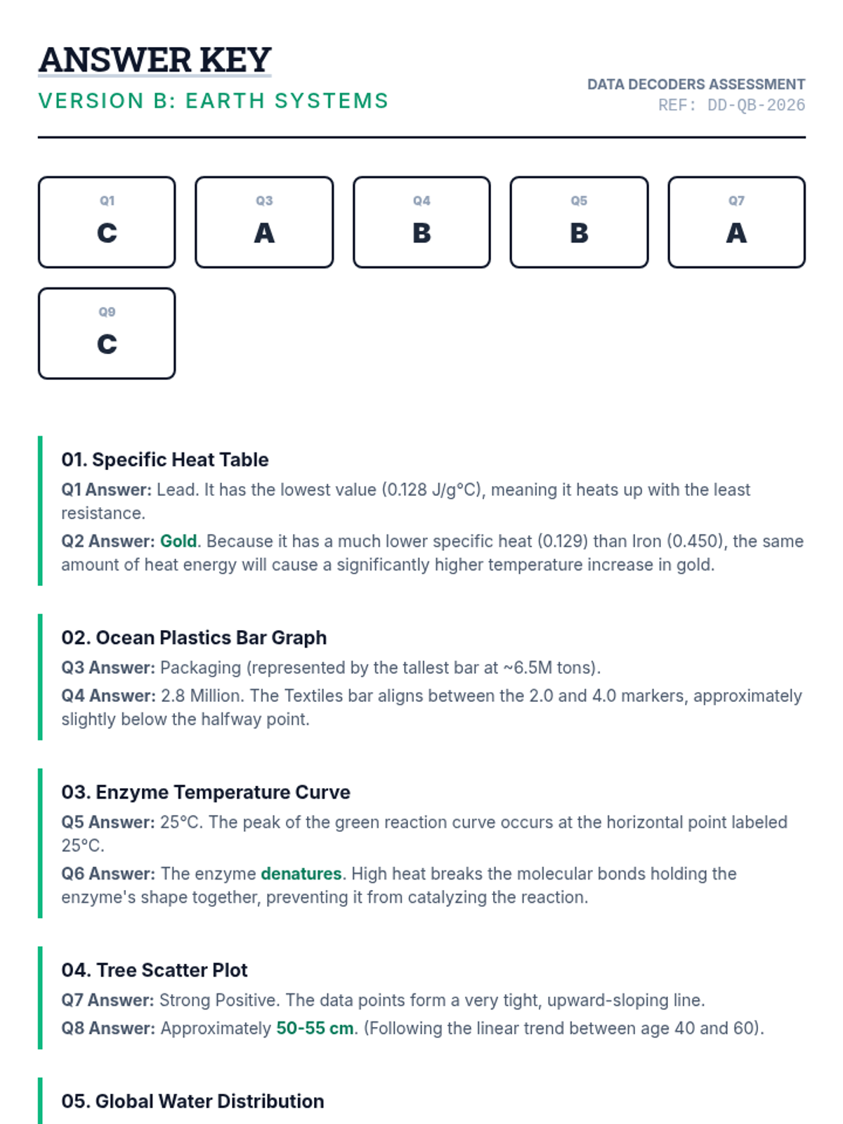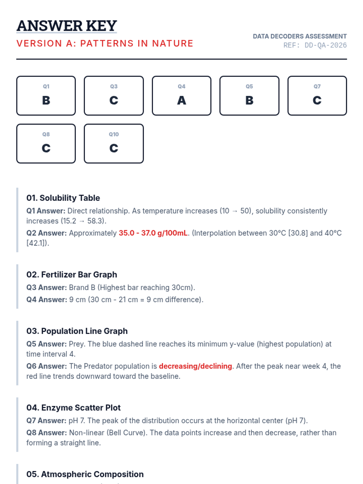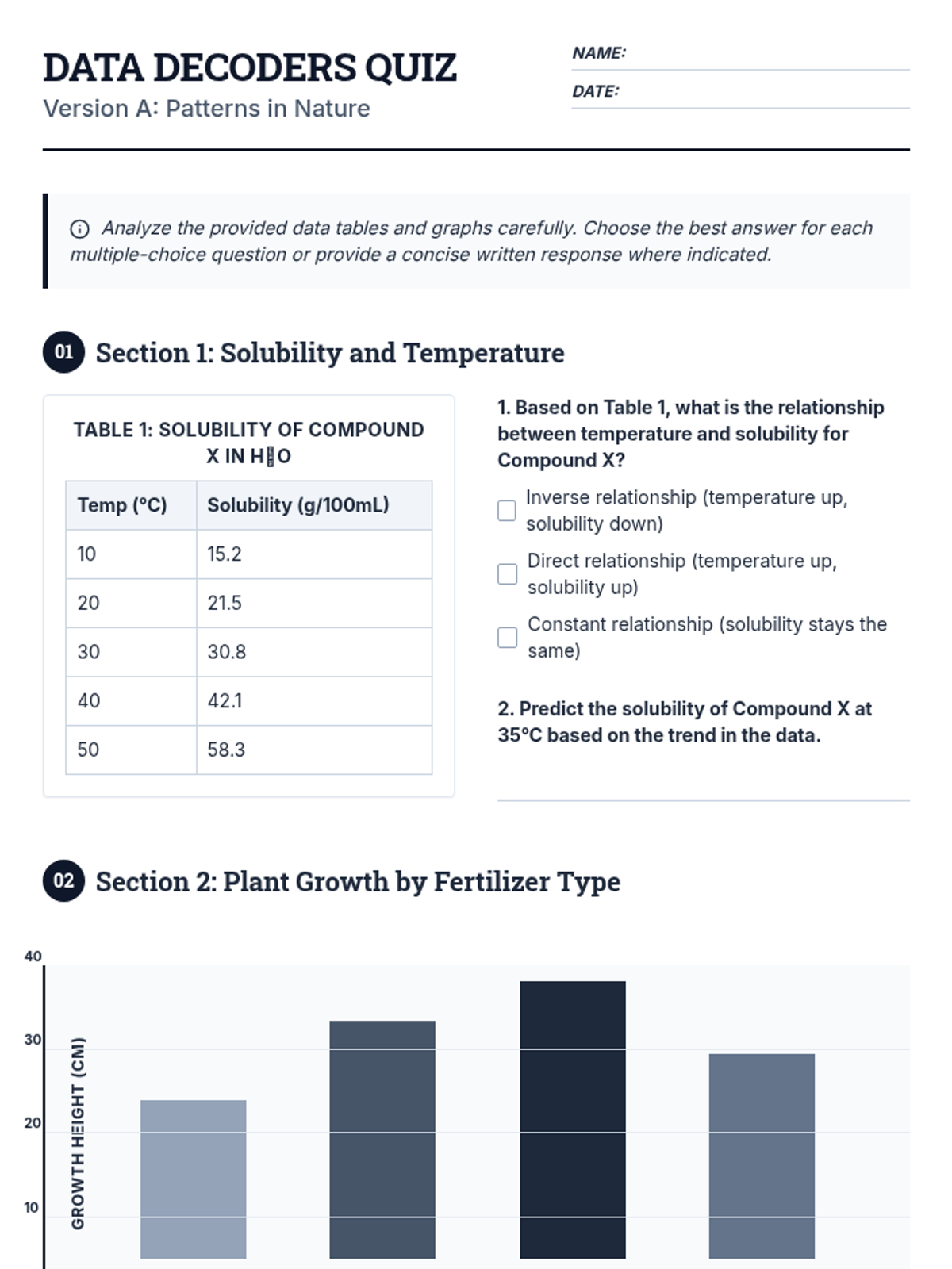 A high-stakes assessment focused on interpreting various scientific data representations, including tables, bar graphs, line graphs, and scatter plots. Students will analyze trends, identify variables, and draw conclusions from realistic scientific scenarios.