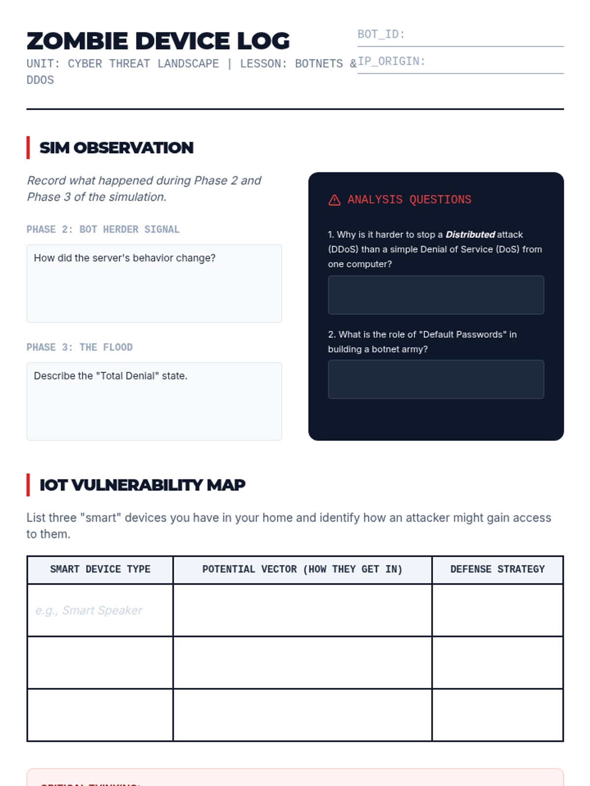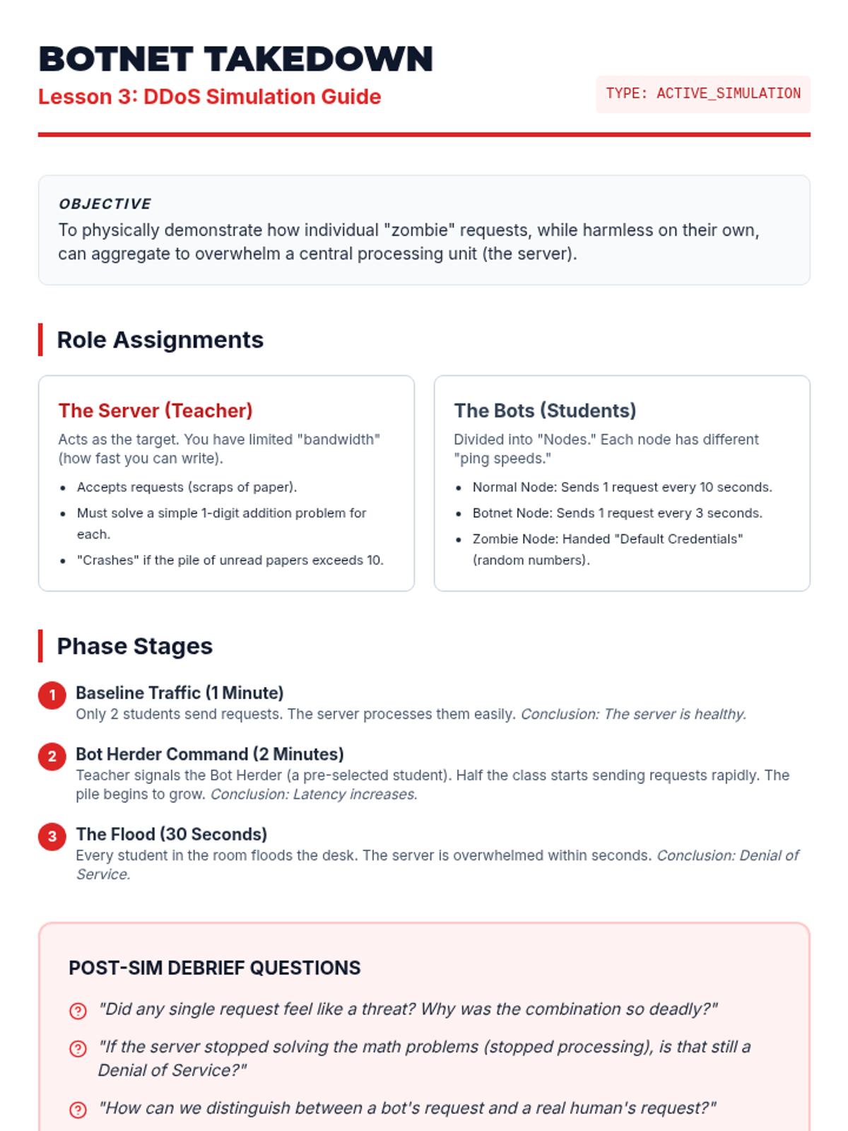 Students investigate how botnets are formed and used to launch DDoS attacks, including a classroom simulation of traffic overload.