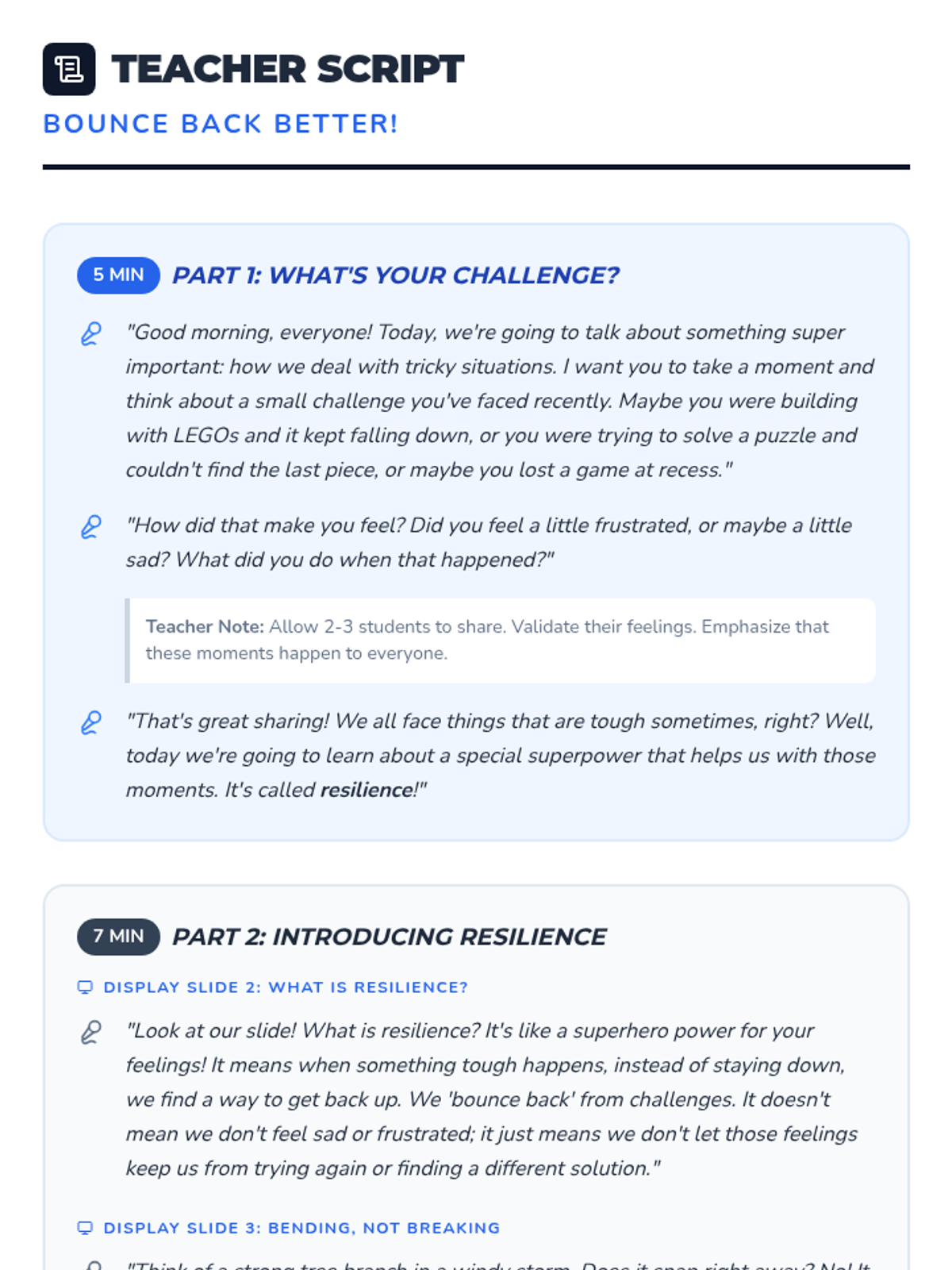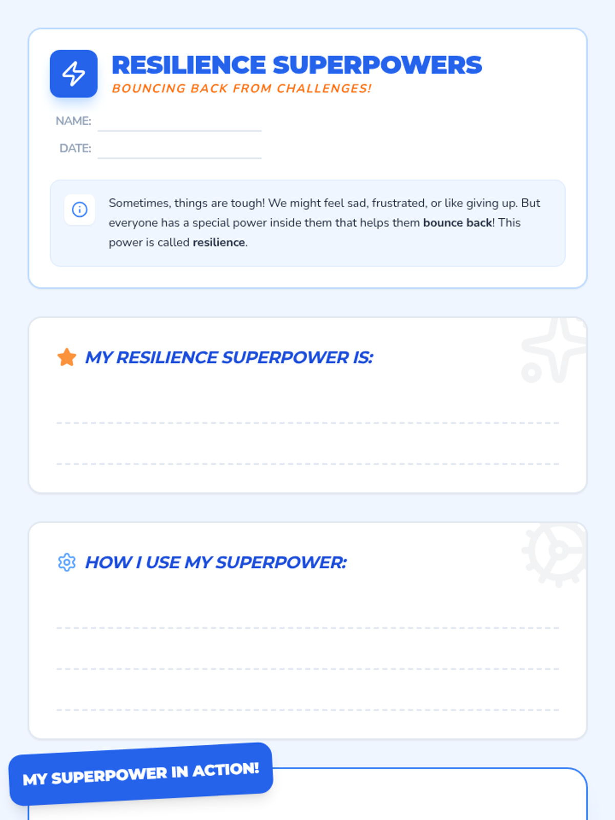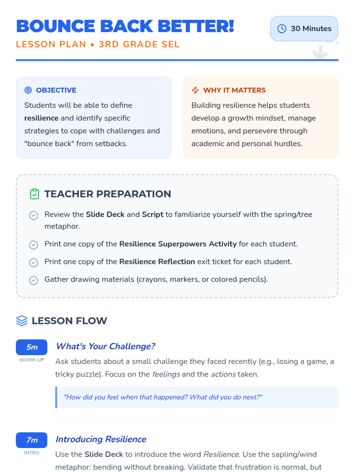 A 30-minute interactive lesson for 3rd graders that introduces the concept of resilience through storytelling, discussion, and a 'superpower' themed activity. Students learn to 'bounce back' from challenges using specific coping strategies.
