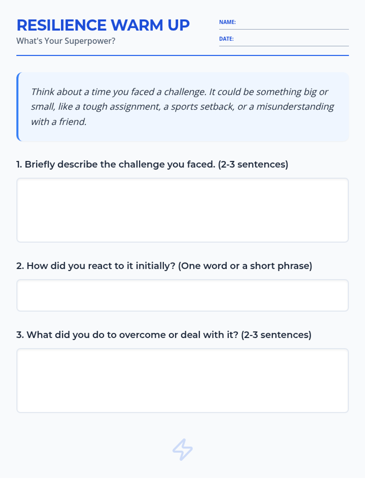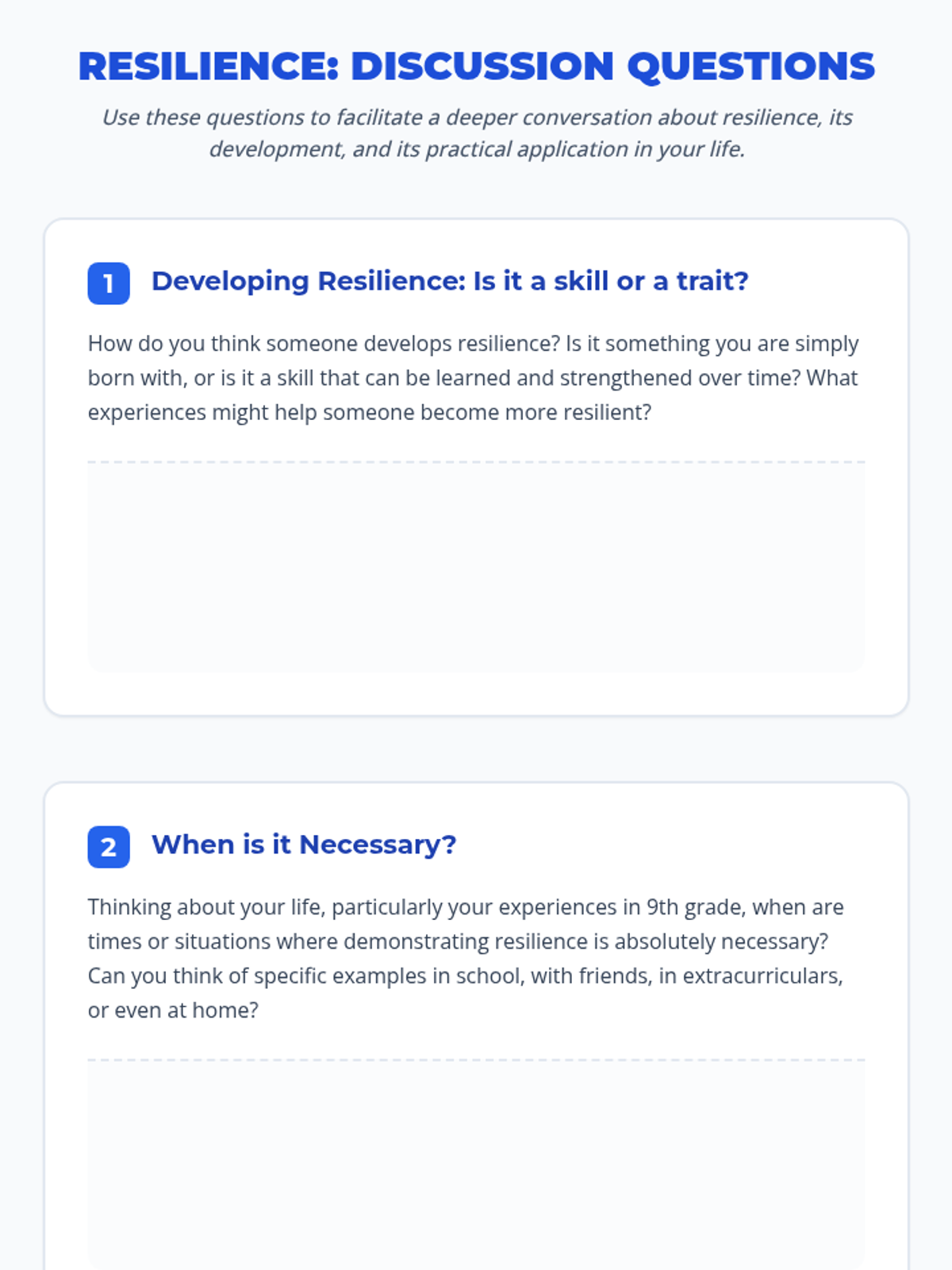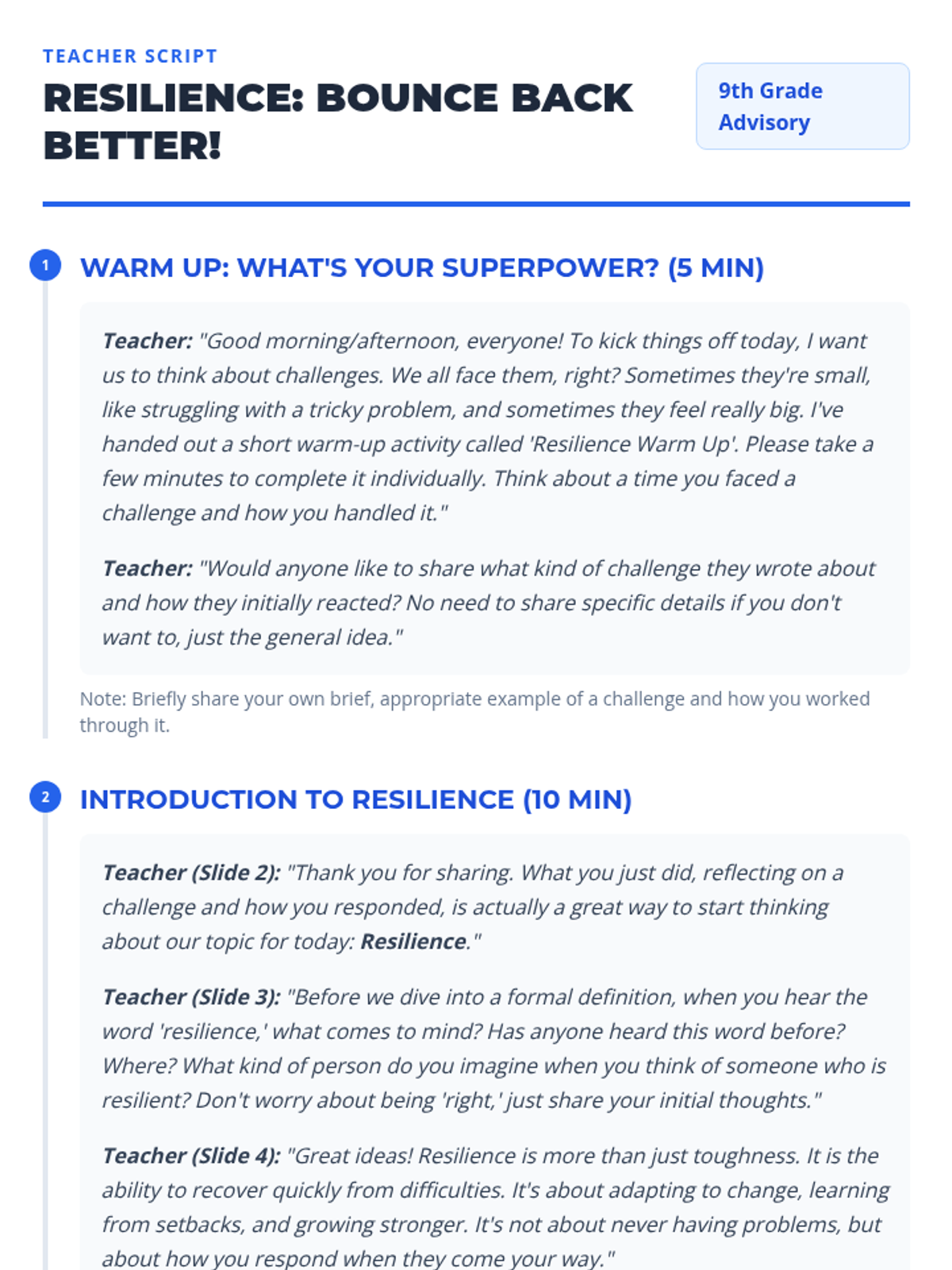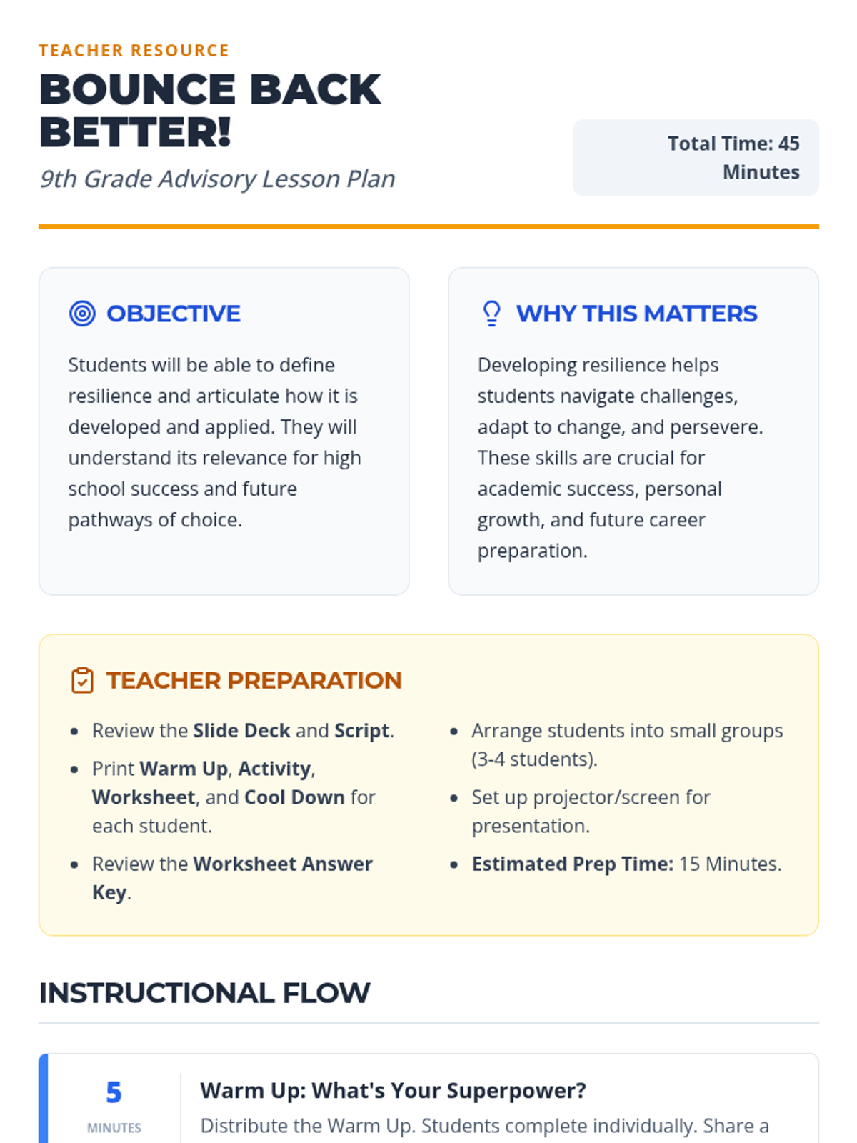 A 45-minute resilience-building lesson for 9th-grade advisory students. It uses a UDL framework to help students define, develop, and apply resilience to their academic and personal lives.