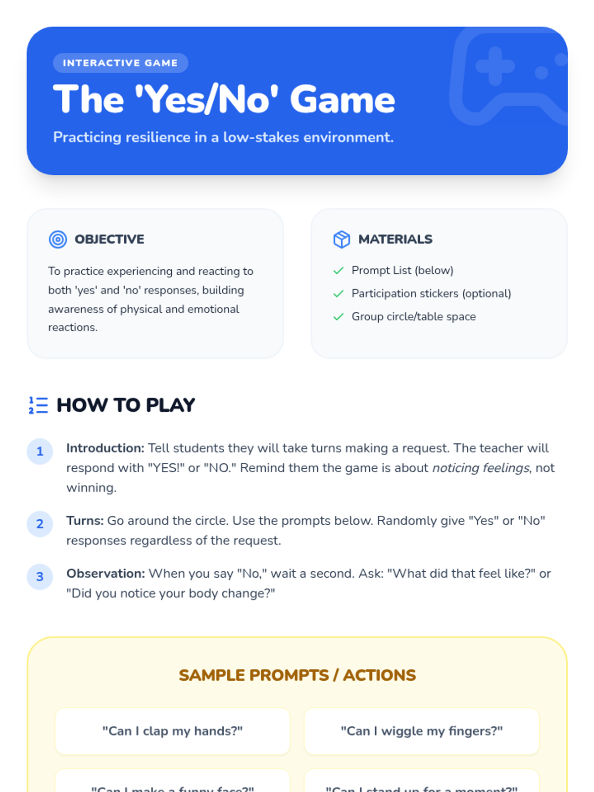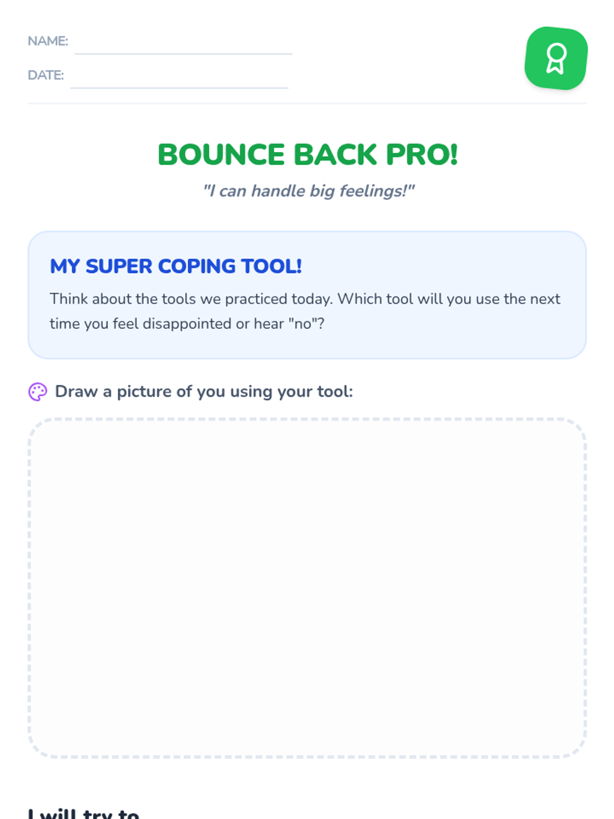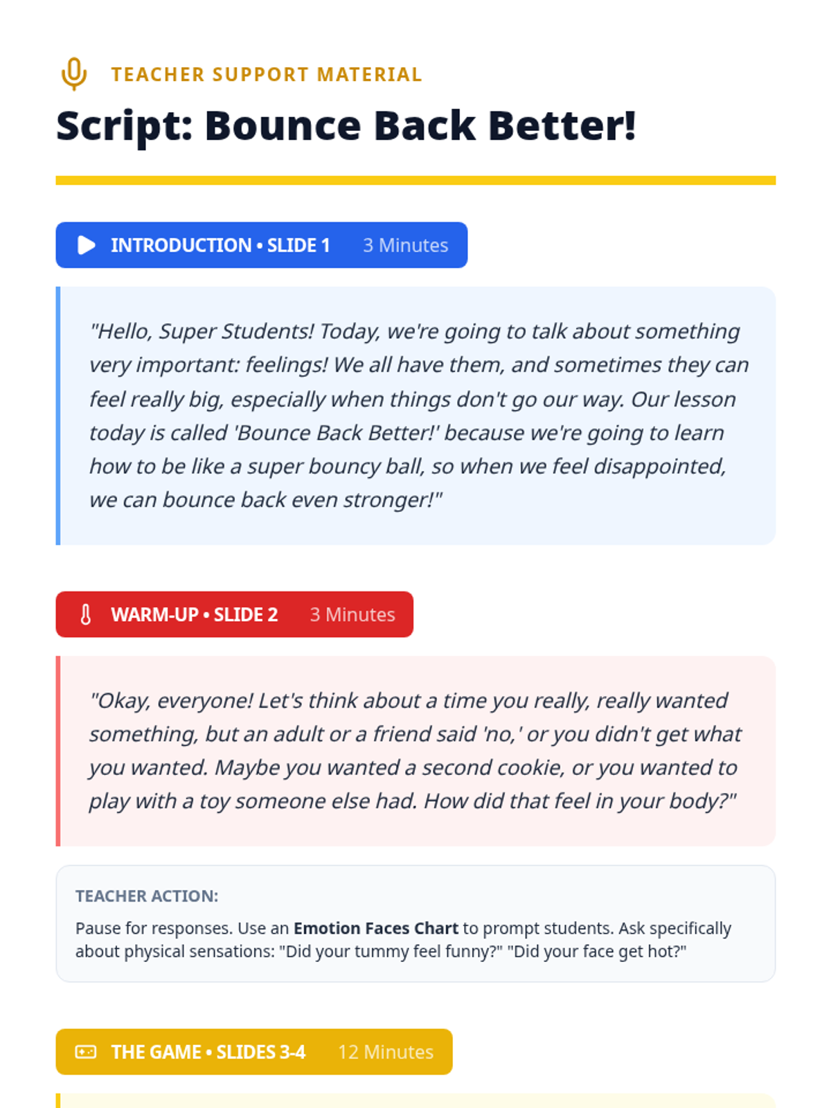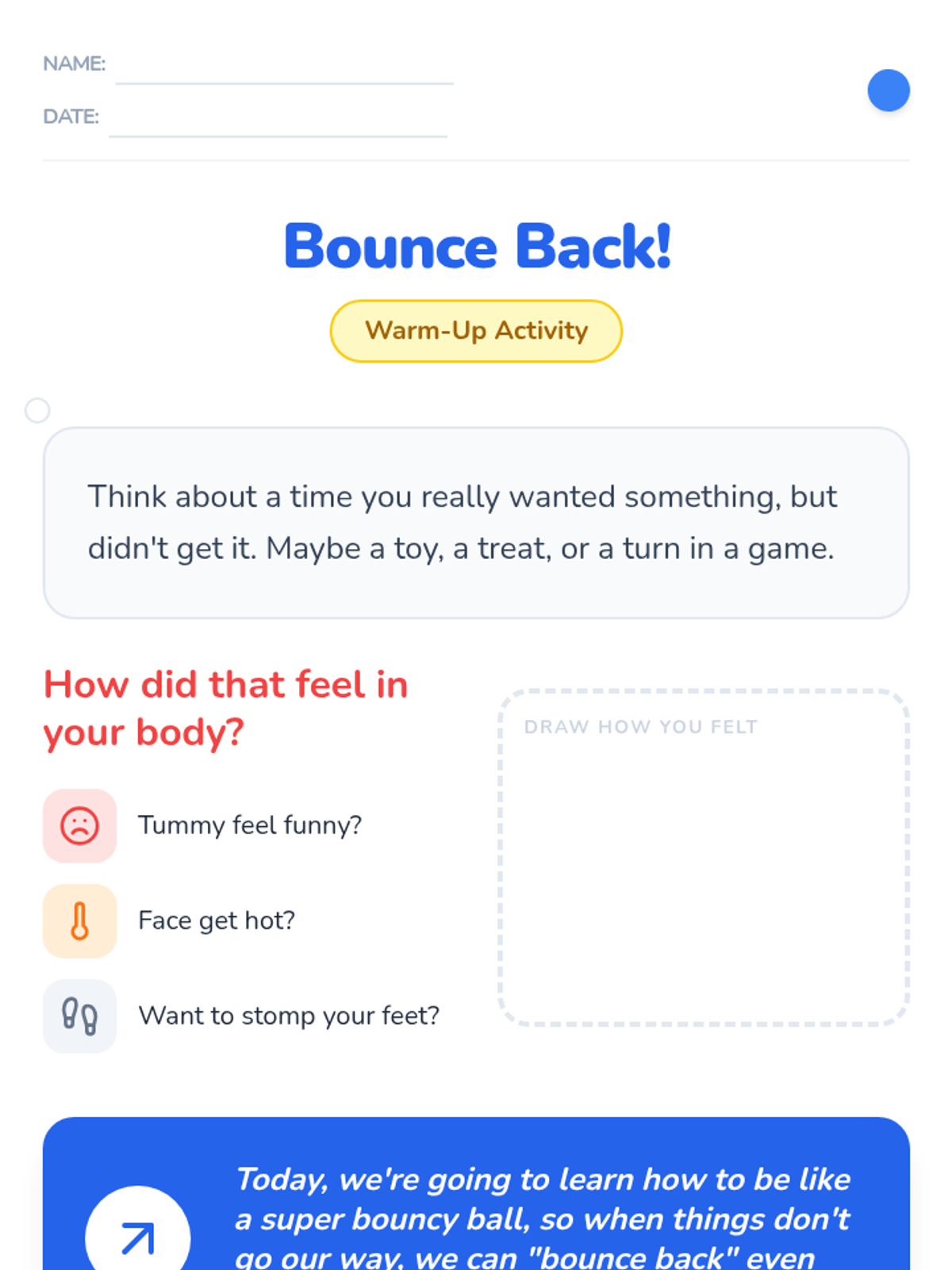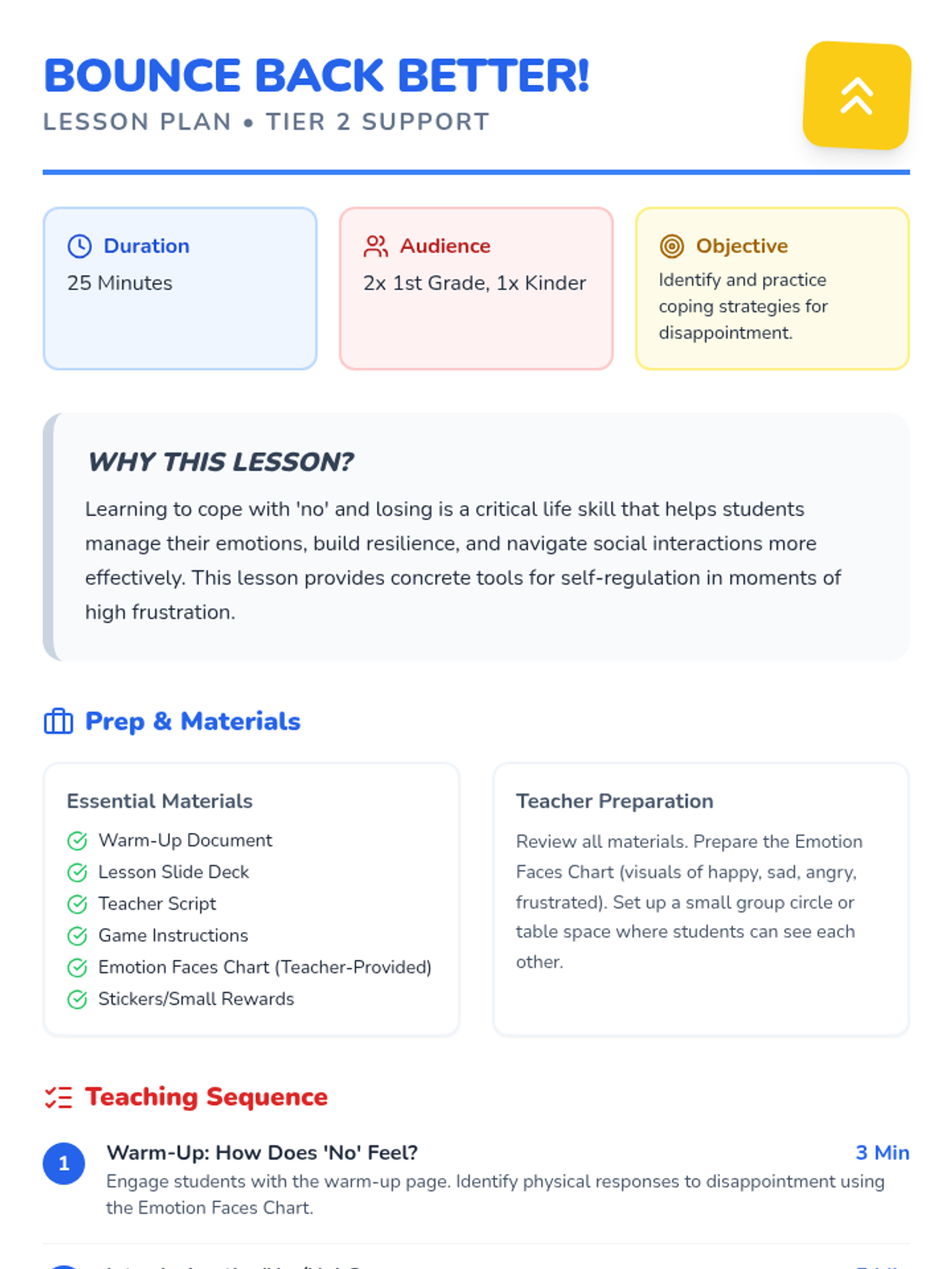 A 25-minute Tier 2 group lesson for K-1 students focused on developing healthy coping strategies for handling disappointment, losing, and hearing 'no.' Students learn to 'bounce back' through games and guided reflection.
